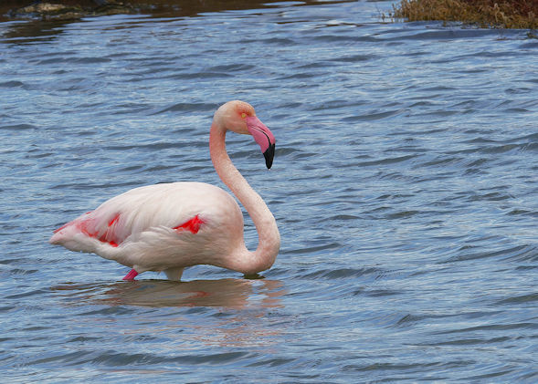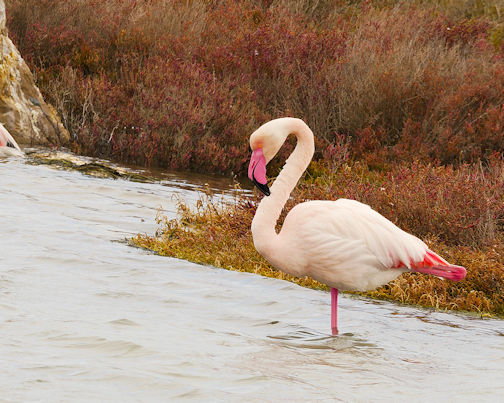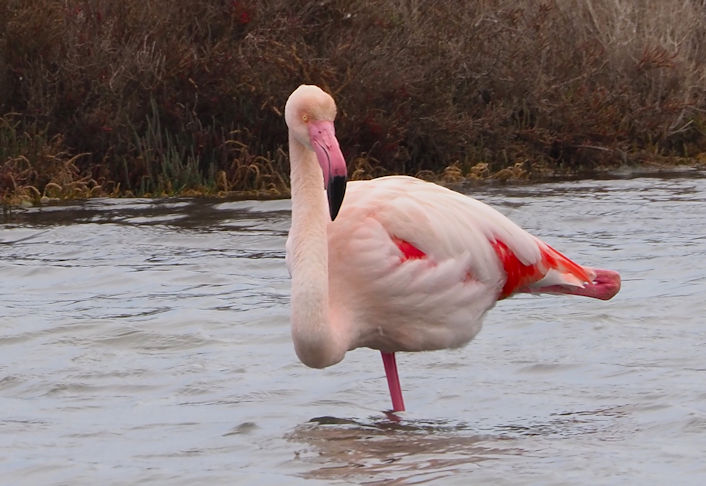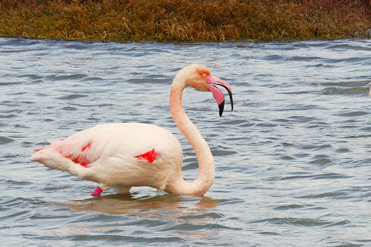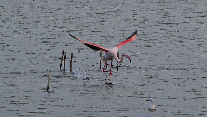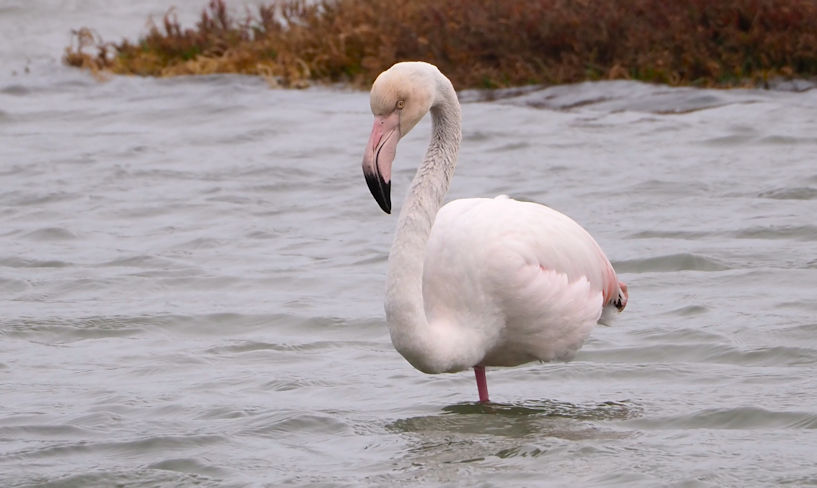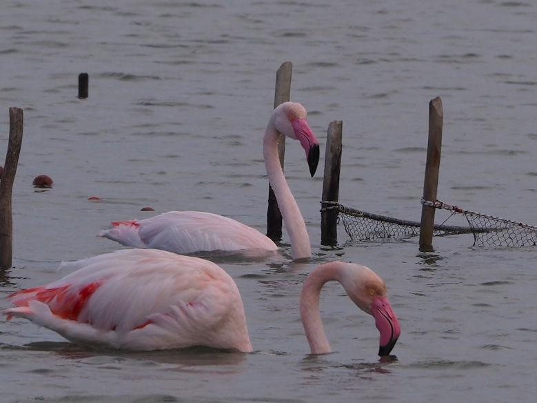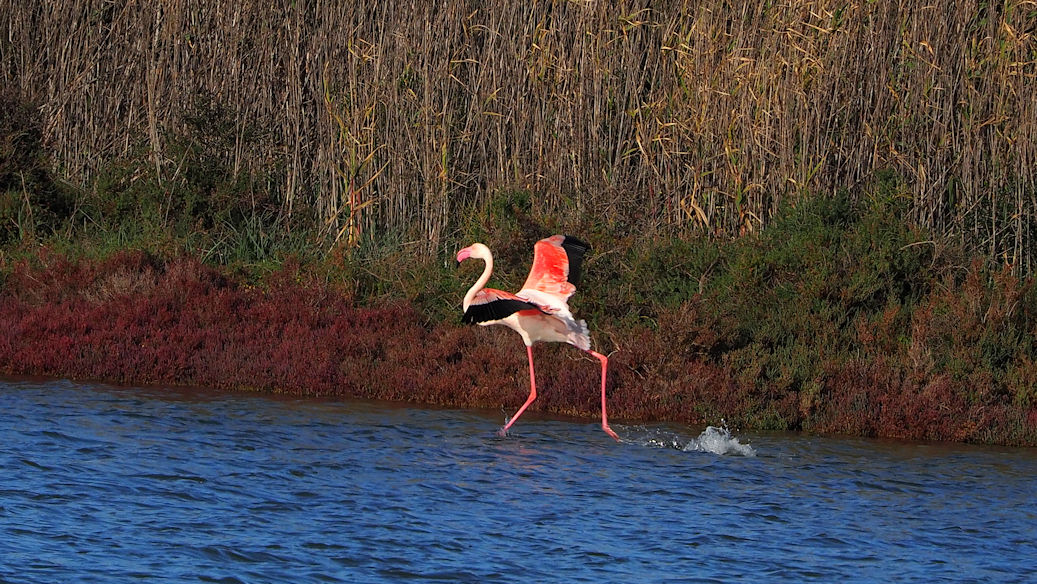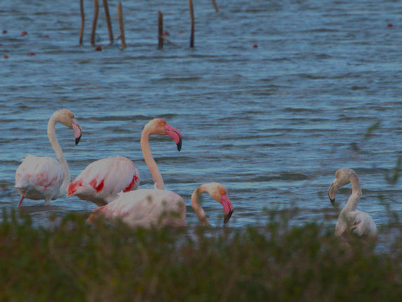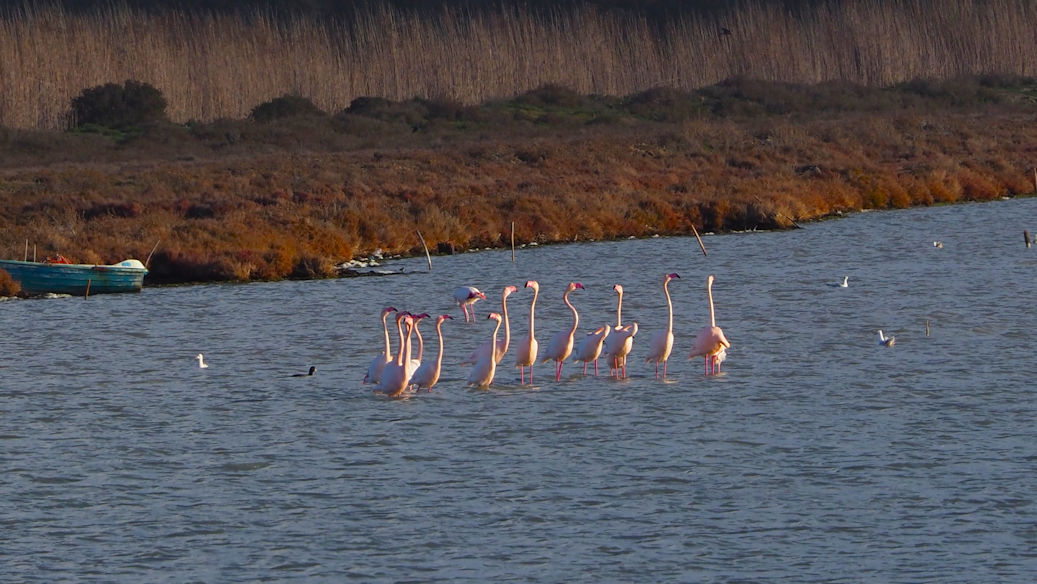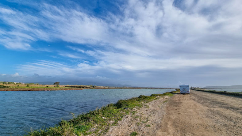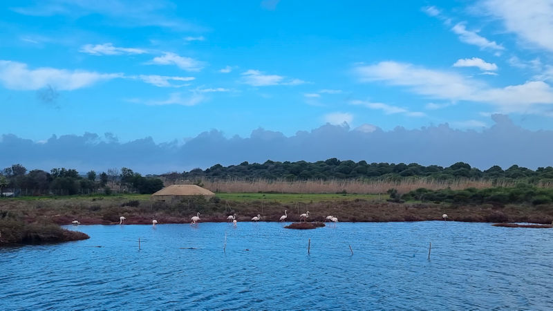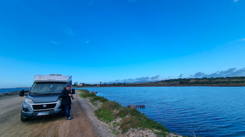 Und jetzt? Ganz in der Nähe ist ein Kiosk mit Stellplatz. Als wir dorthin auf dem Weg sind passieren wir einen weiteren Stagno. Jetzt gegen 3 sind die Farben wundervoll und die vielen Flamingos, die es dort hat, sind fast pinkfarben.