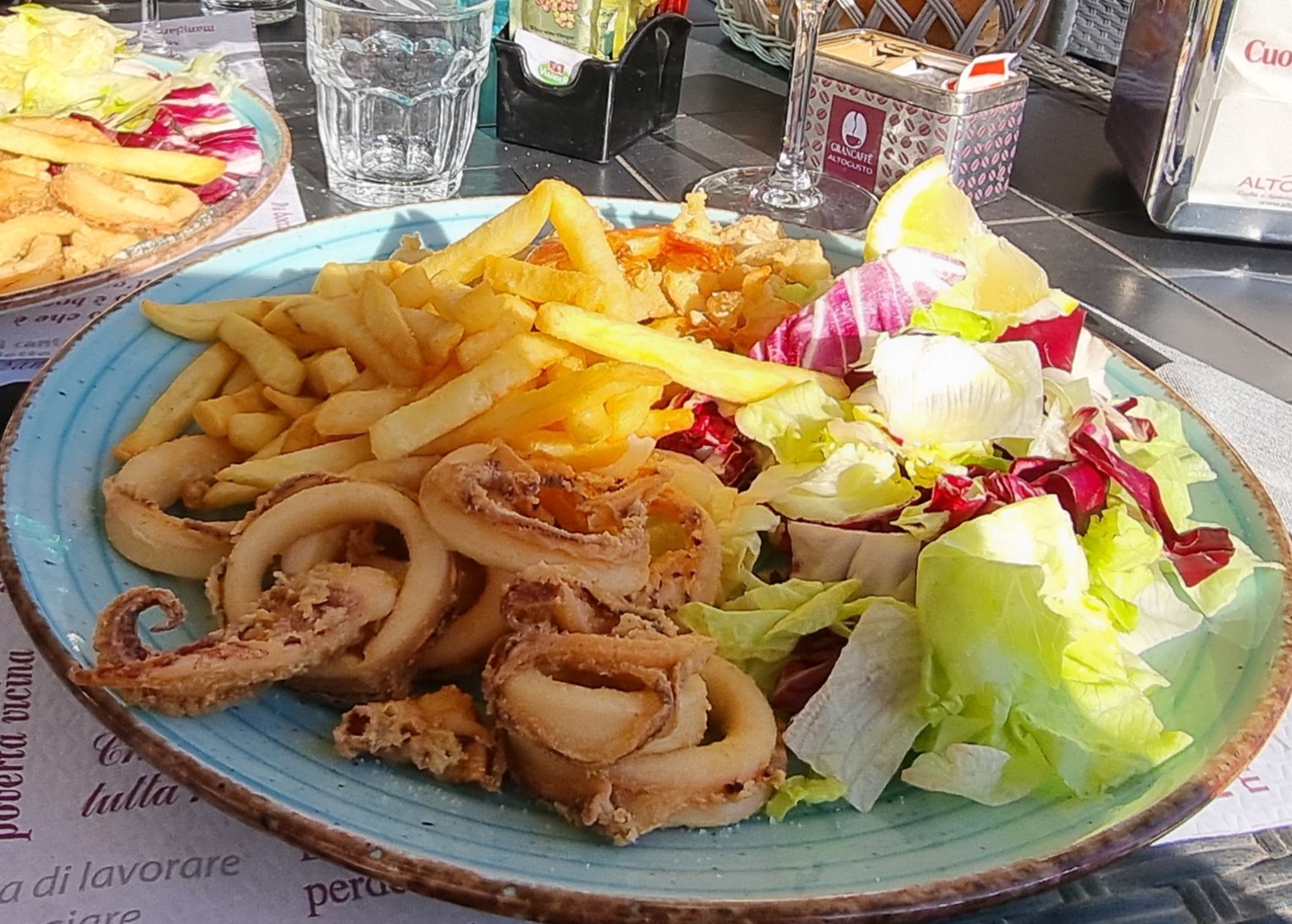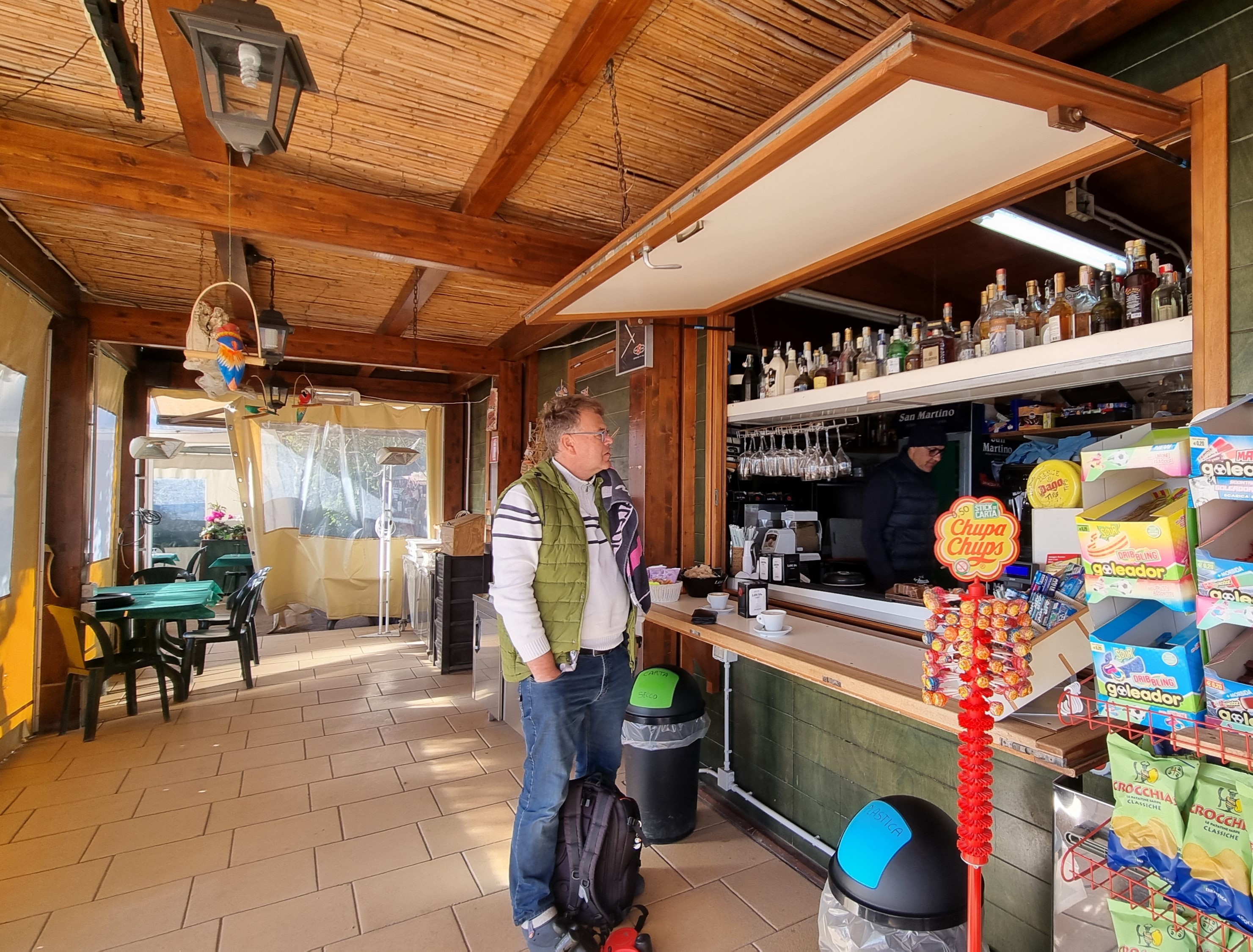 Unser Ziel ist die kleine Bar Ristorante am Ortseingang von Fertilia. Es ist jetzt 1 Uhr und wir bekommen den letzten Parkplatz. Alle Arbeiter des Ortes scheinen ihre Mittagspause hier zu verbringen. Das heutige Tagesgericht ist leider nichts für uns, denn Innereien mögen wir nicht.