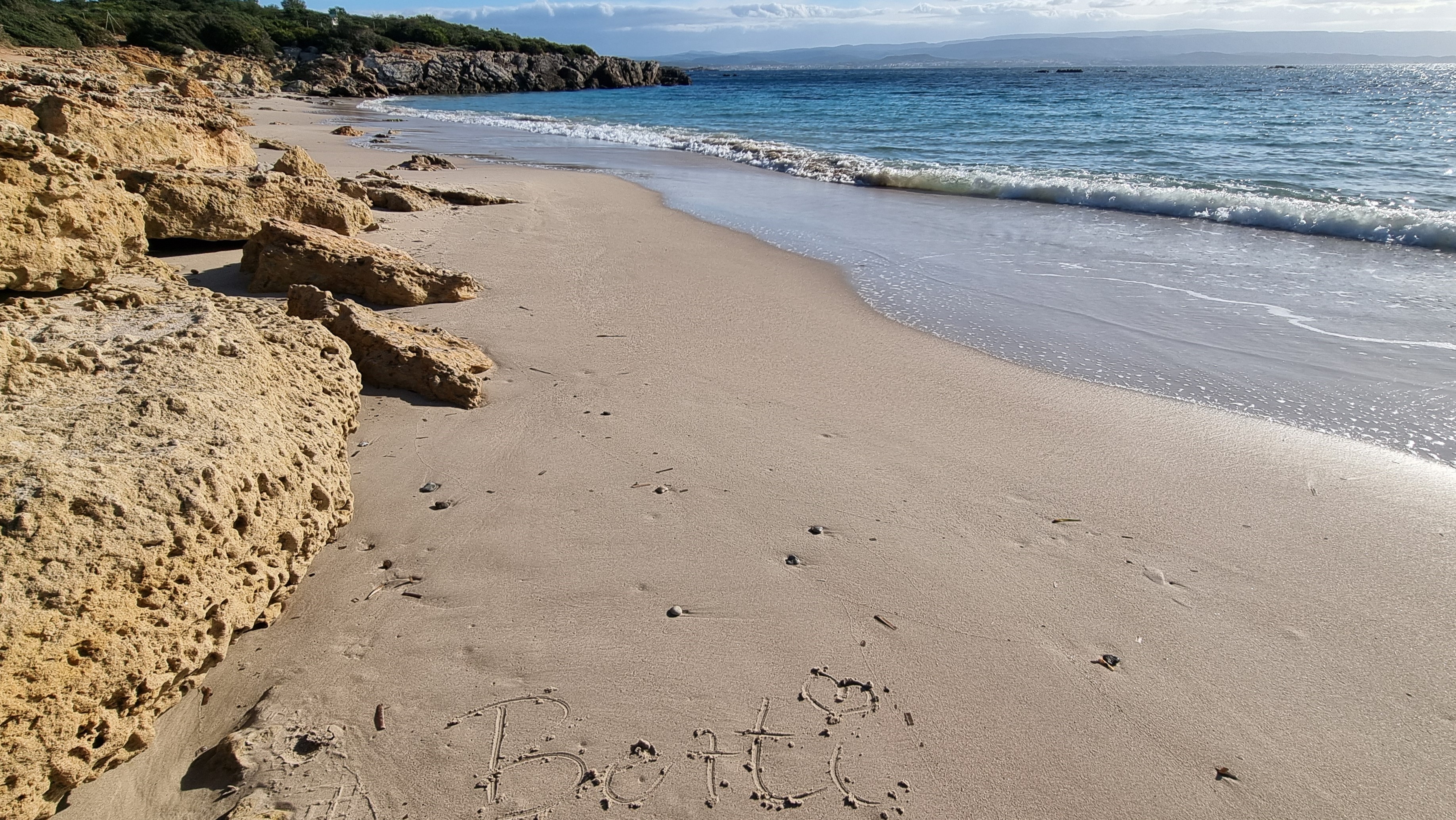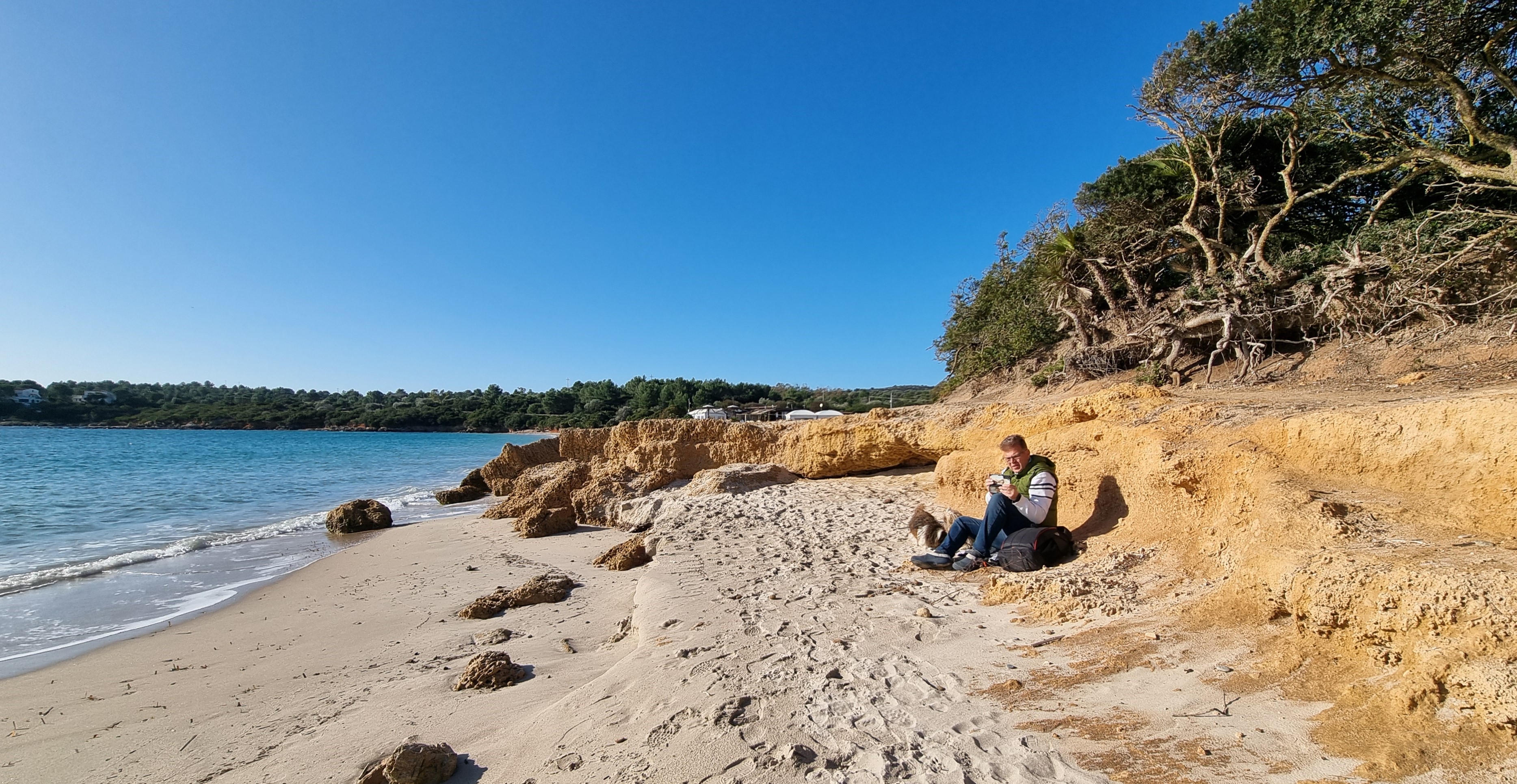 Die kleine Holzbude ist verschwunden und die Bar/das Restaurant vereinnahmt fast die ganze Bucht. Und es hat geöffnet. Also schnell ein Cappuccino im Stehen, ein kurzes Schwätzchen, Hundekekse für unsere Schätze und dann geht es kurz an den Strand, an dem unser Ben nach seiner schweren OP so glücklich war. Ein paar Tränchen laufen, wir schmusen unsere Bärchen und verlassen diesen Ort, der leider etwas von seinem Zauber verloren hat.