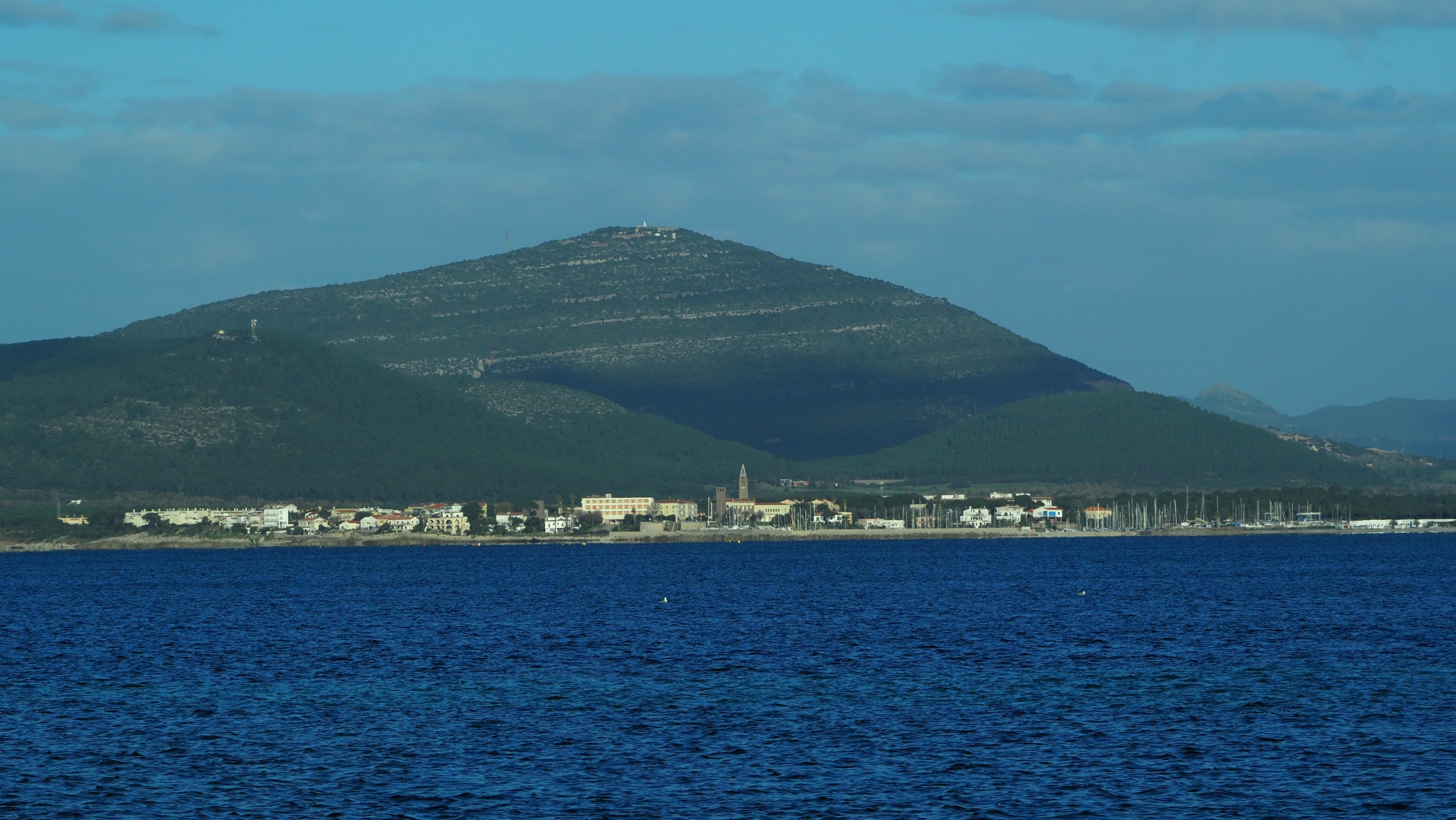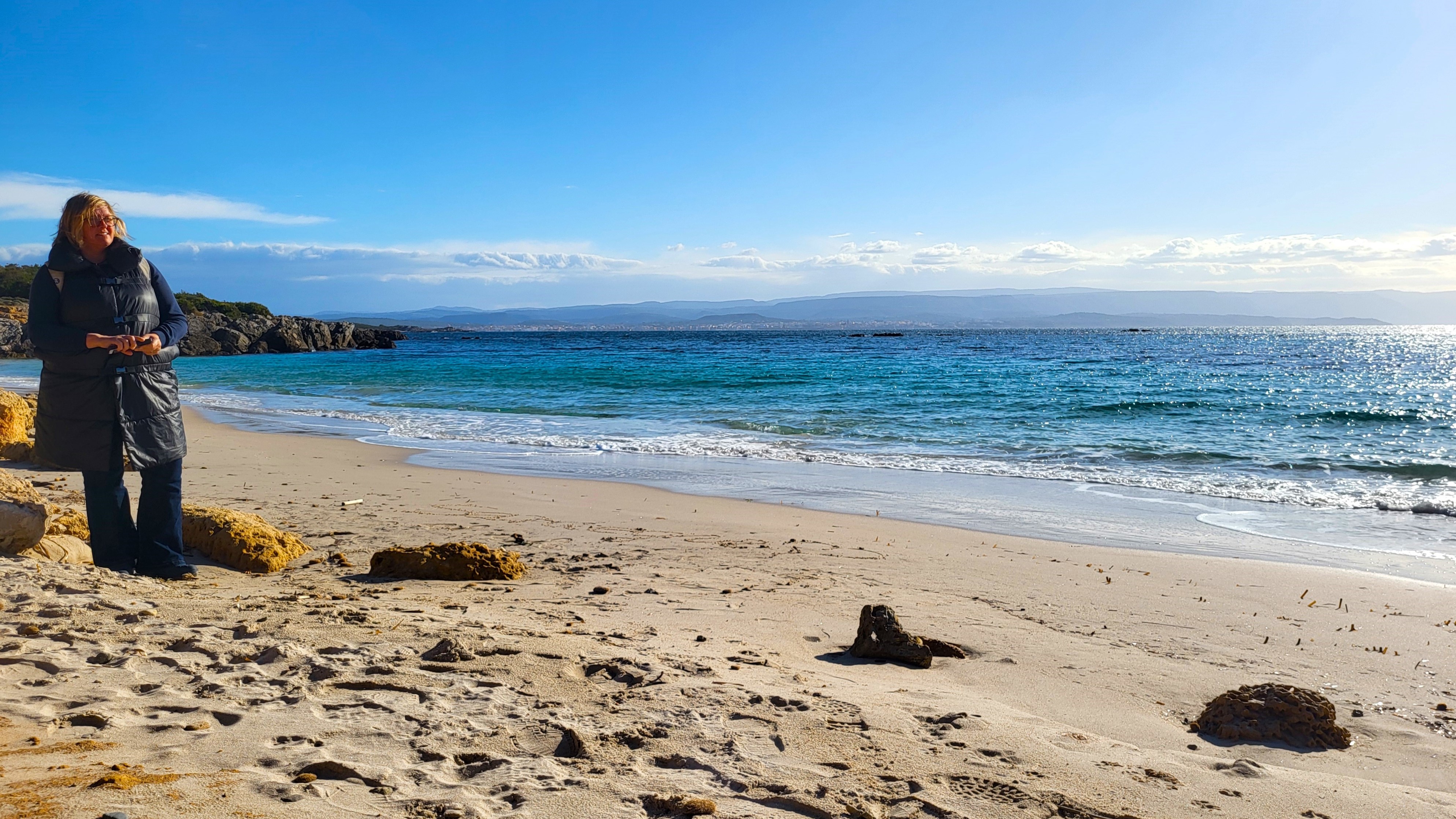 Die angekündigte Sonne weckt uns um 8 Uhr. Ralf ersteht beim Fellnasengassi 2 Cornetti, denn der Plan ist es, in Fertilia am Meer zu frühstücken. Und da stehen wir dann kurze Zeit später vor einer Steinbank. Diese polstern wir mit unseren Kissen, die Bialetti wird aktiviert und schon sitzen wir dick eingemummelt auf der Bank. Die Sonne scheint zwar, aber der Wind ist richtig kalt.