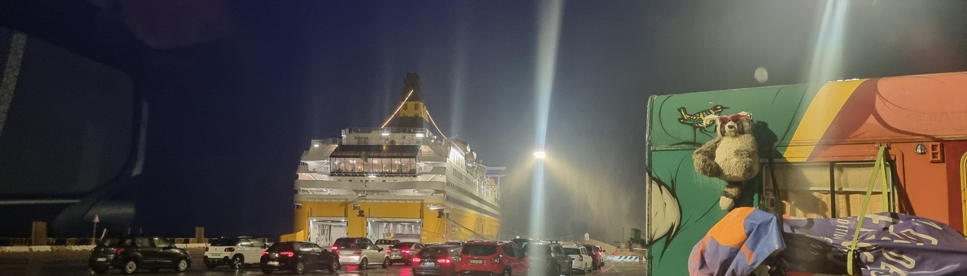 Je mehr wir uns Olbia nähern, umso schlechter wird das Wetter. Wind und Regen nehmen zu. In Olbia fahren wir noch die Servicestation für Wohnmobile an, bevor wir in Richtung Golfo Aranci einbiegen. Das Wetter ist echt schrecklich und wir fragen uns, ob unsere Fähre überhaupt fährt. Ja sie wird fahren und der Laderaum ist völlig ausgebucht.