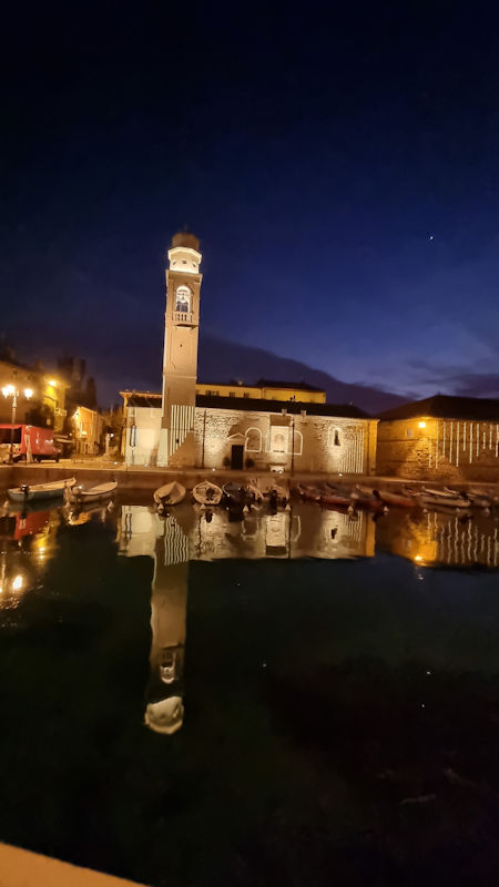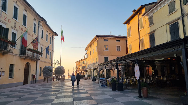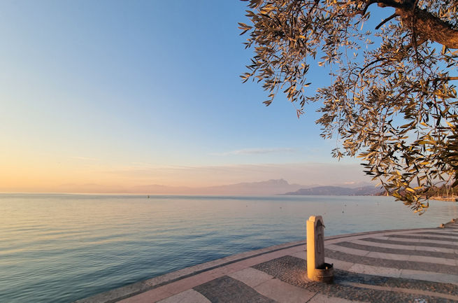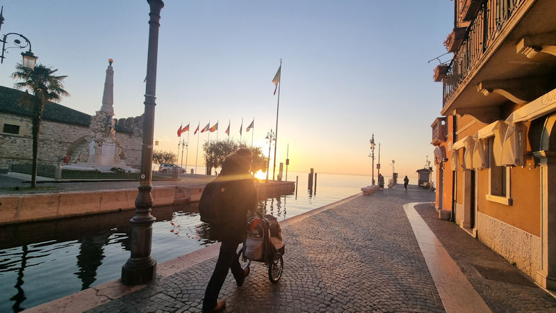Gegen 4 parken wir auf einem kleinen Parkplatz oberhalb von Lazise und sind pünktlich zum Sonnenuntergang am Wasser. Wunderschön und nahezu menschenleer. Nur ganz wenig Bars haben geöffnet. Die, die wir uns aussuchen, hat eine witzige Besatzung. An jedem Tisch sitzt ein Hund. Außer an einem, da sitzt eine Amazone auf der Stuhllehne, natürlich angeleint. Gegen halb 6 sind wir plötzlich die einzeigen die noch da sind. Es folgt ein nettes Gespräch mit der Besitzerin Diana. Sie kommt aus Brasilien und klagt uns ihr Leid, nach 18 Jahren immer noch nicht von den Lazisern in die Dorfgemeinschaft aufgenommen worden zu sein.