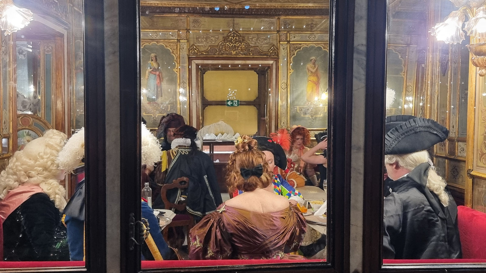 Ja , wir steigen noch einmal aus, sehen die ein oder andere Maske an uns vorbeihuschen. Wir stoppen vor Venedigs berühmtesten Caffé, dem Caffé Florian. Was wir hier sehen und auch von den verkleideten Menschen zu hören bekommen, lässt sich tatsächlich nur mit einem Wort umschreiben: Dekadenz.