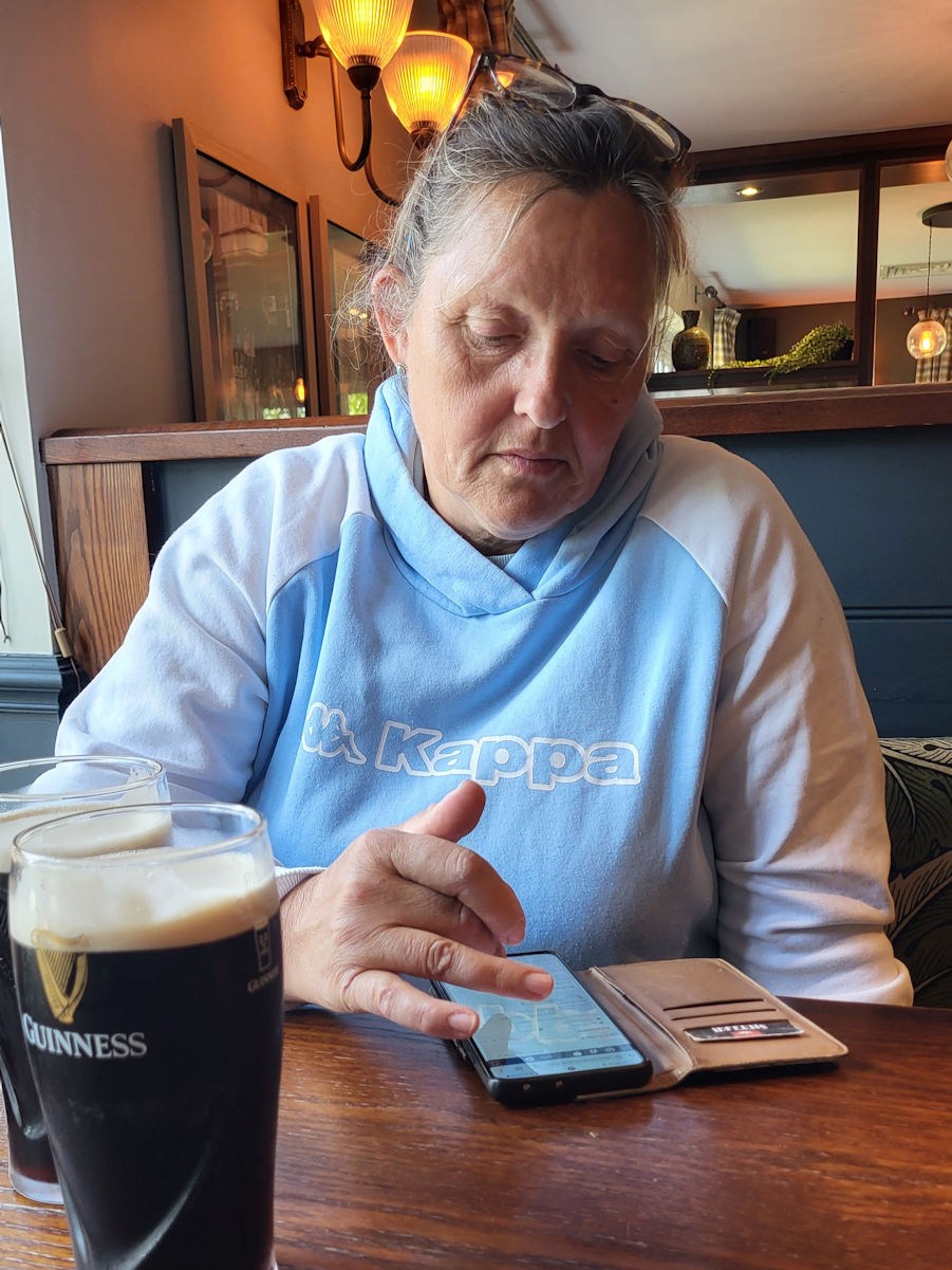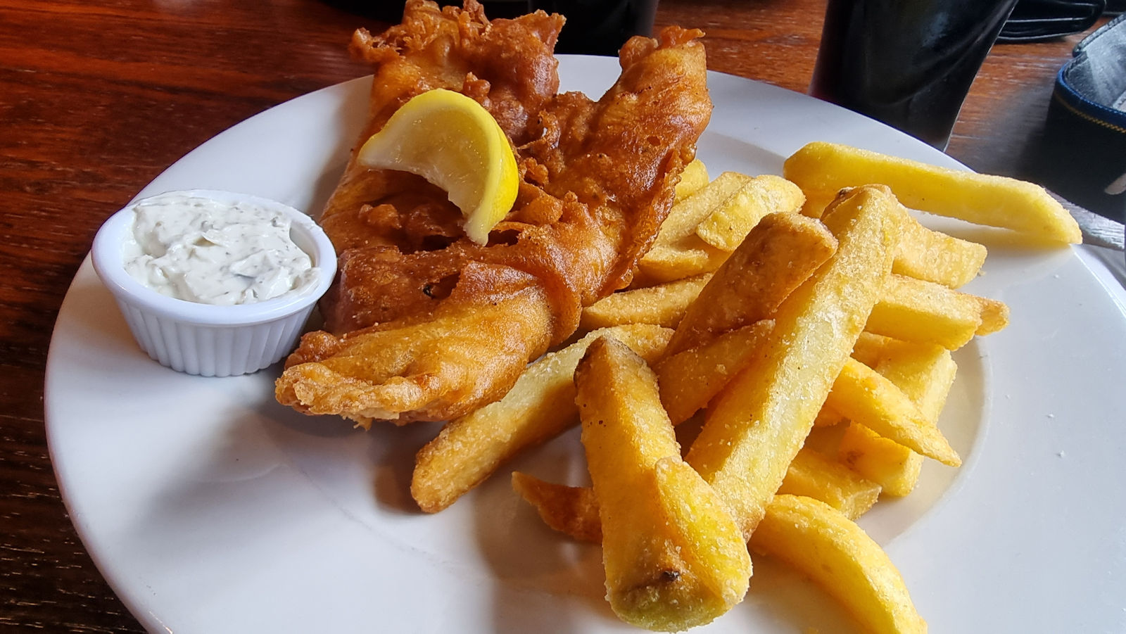 Wir schlendern ein wenig herum- hatten wir erwähnt, dass es etwa 5 Minuten vor Ankunft aufgehört hat zu regnen – und passieren das nett gelegene Pub Cyrigg Glas. Und schon sitzen wir drinnen bei Fish&Chips und Guinness. Fühlt sich an wie „Angekommen!“