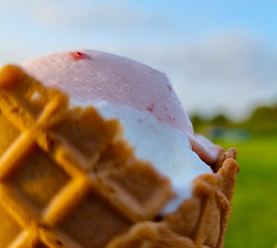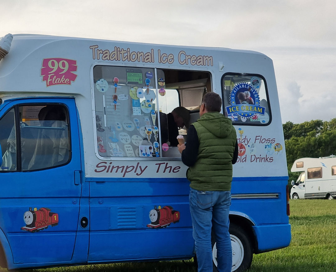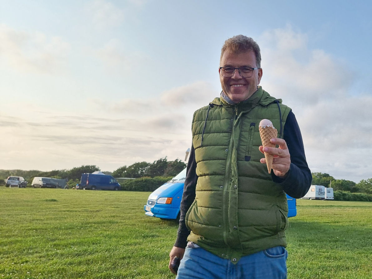 Es gibt etwas Schinken und Käse mit Brot und Salat und ein Eis vom süßen Eiswagen, der Yankee Doodle spielt, um Aufmerksamkeit zu bekommen. So, wie wir die Eiswagen vom letzten Walesaufenthalt in Erinnerung haben. Das Erdbeereis ist übrigens zum Niederknien….
