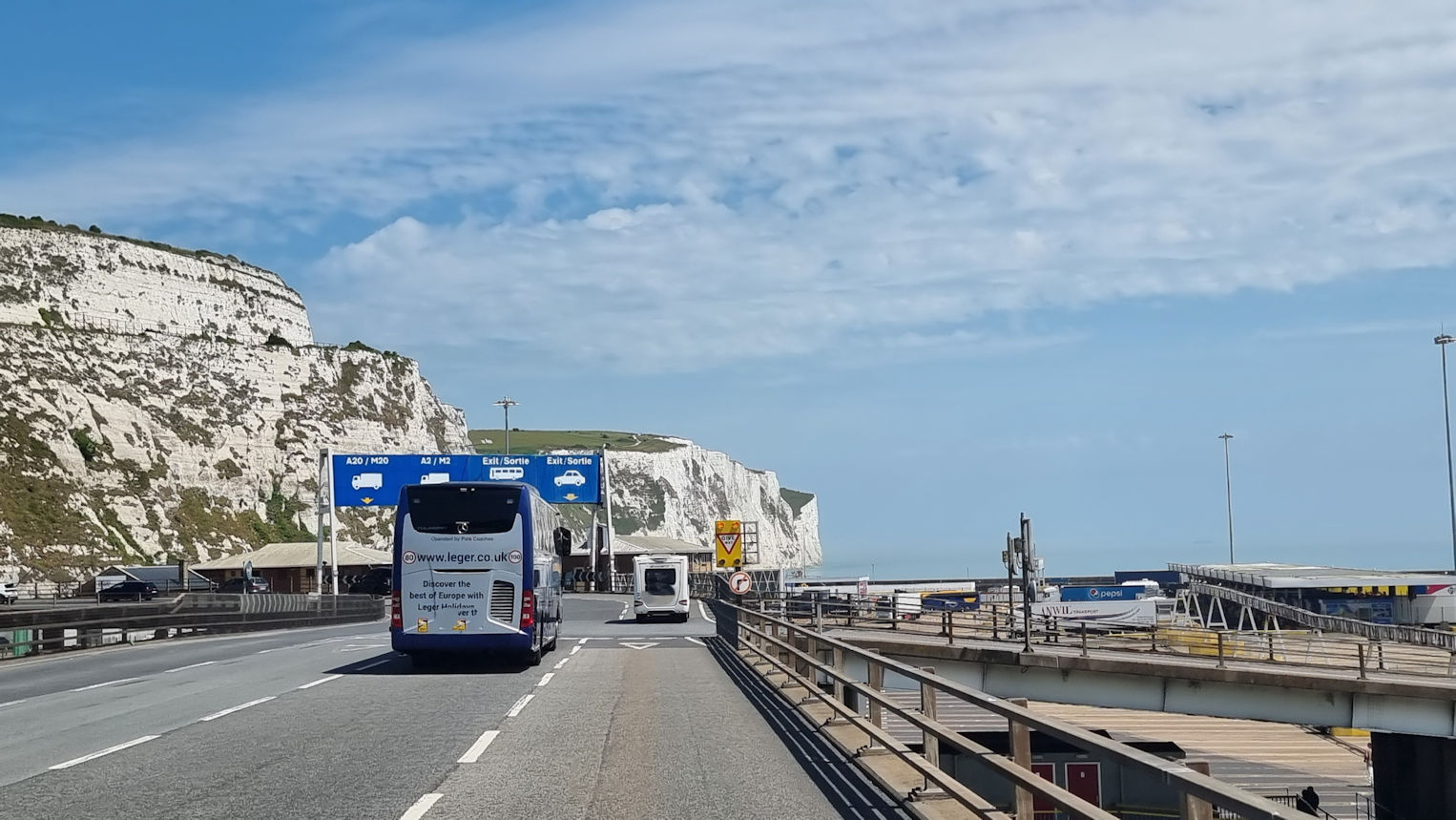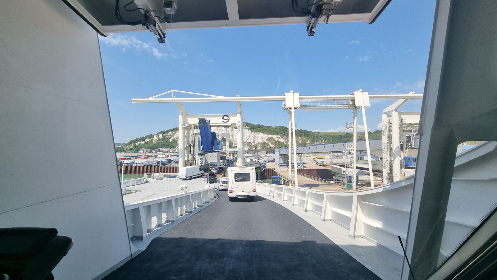 Die Wartezeit ist kurz. Das Boarding verläuft problemlos und wenig später befinden wir uns im Haustierbereich der Liberte….eine wirklich tolle Fähre. Pünktlich um 12 Uhr legen wir ab. Die Überfahrt ist ruhig, es ist sonnig und nach 90 Minuten erreichen wir nach einer lustigen Aufzugfahrt mit der Crew zu unserem Parkdeck und der Diskussion, wer wohl von unseren Fellnasen zuerst verspeist werden wird, Dover mit seinen berühmten Kreidefelsen bei Traumwetter.