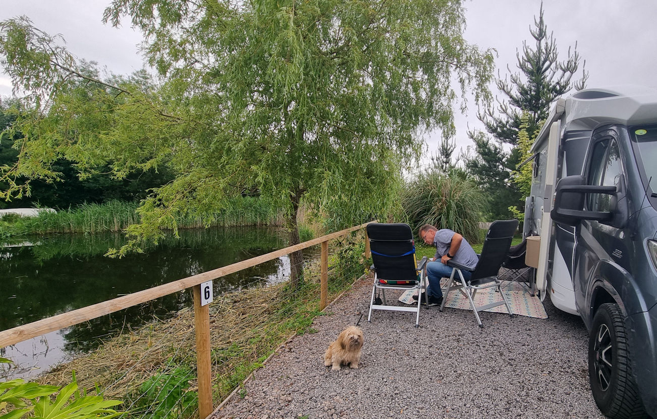 Egal: Ziel ist es nun bis 7 Uhr abends den Stellplatz Ty Coch Farm zu erreichen. Die vorherige Geldautomatensuche brechen wir erfolglos ab und gelangen nach den letzten etwa 3 km fast-Singletrackroad mit Gegenverkehr um etwa halb 7 zu besagtem Stellplatz. Ein netter Check-In geht unserer Parkaktion an Platz 7 voraus. Ein Traumplatz am Teich mit Aussicht auf Blesshuhn, Goldfisch und Reiher.
