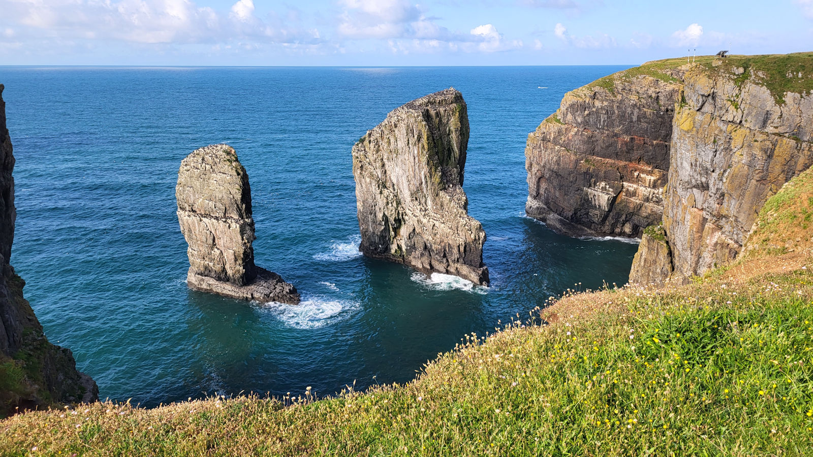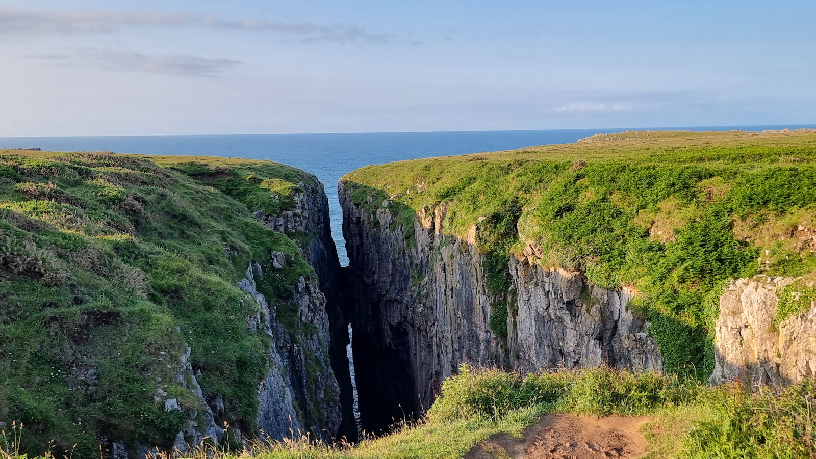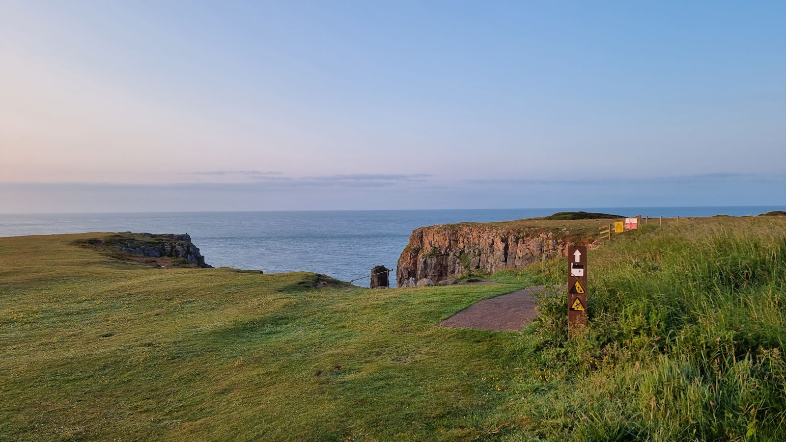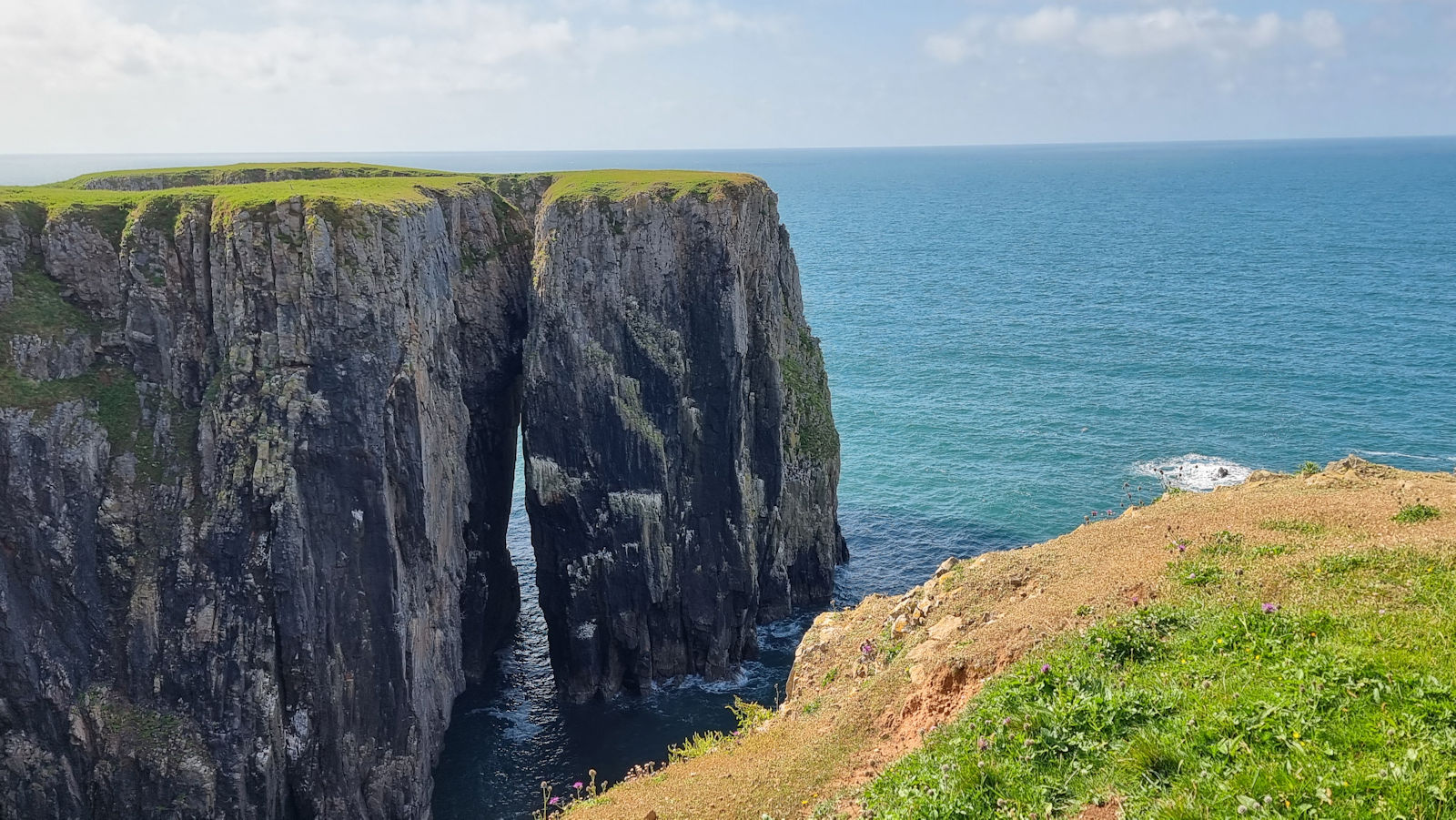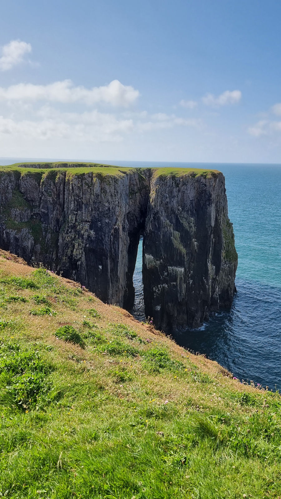 Wir bleiben einige Zeit hier, als ein älterer Herr Ulli anspricht und nach ihren Fotos fragt. Er stellt sich als privater Guide für Naturfotografie vor und hat richtig gute Tipps für diese tolle Küstenregion, dem Pembrokeshire. Mal sehen, was wir davon umsetzen können. Auch berichtet er über die Sage des engen Felseinschnittes Huntsman Gap, eine Felsspalte, die das Pferd des Jägers im Galopp noch rechtzeitig erkannt hatte und absprang. Als der Jäger bemerkte was passiert war, bekam er der Legende nach einen Herzinfarkt und starb. Das Pferd kam mit dem toten Reiter auf der anderen Seite an und brach sich ein Bein.