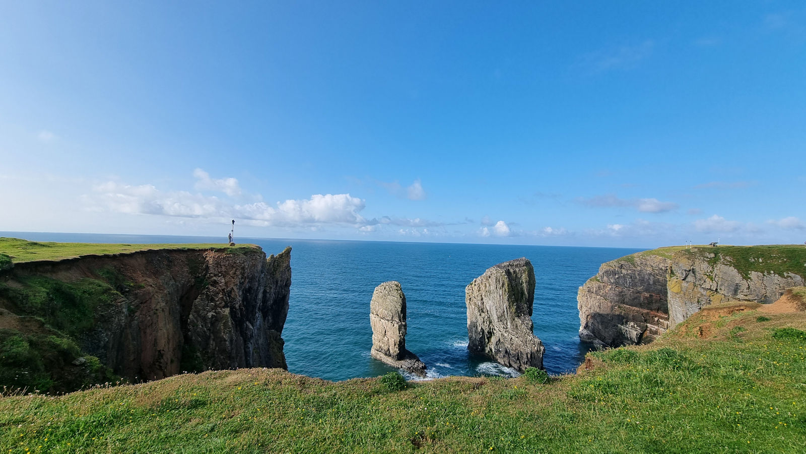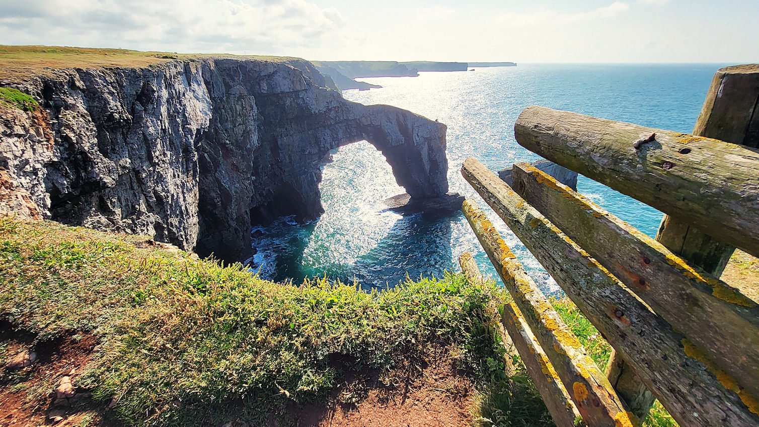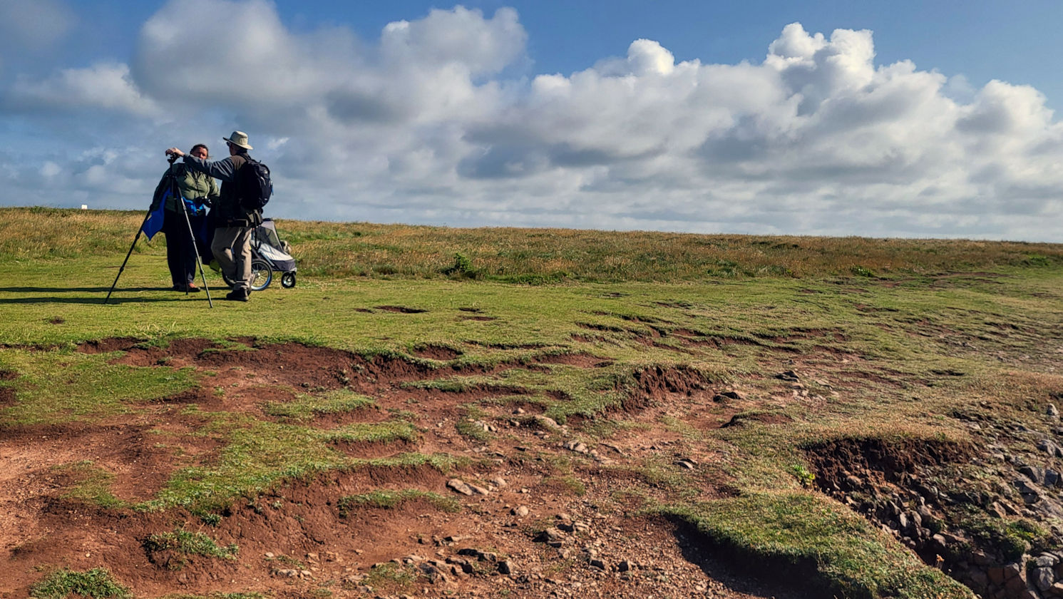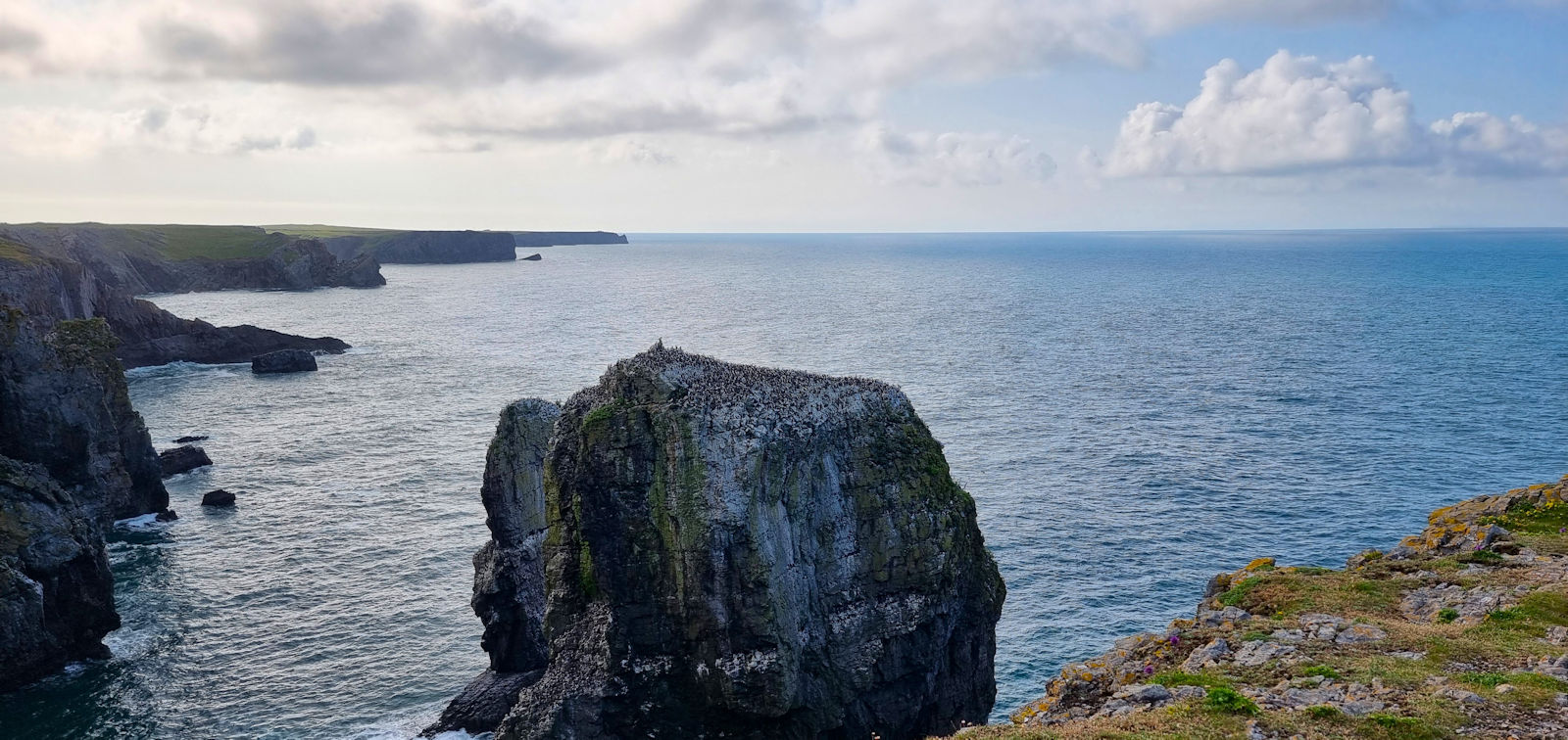 Wir bleiben einige Zeit hier, als ein älterer Herr Ulli anspricht und nach ihren Fotos fragt. Er stellt sich als privater Guide für Naturfotografie vor und hat richtig gute Tipps für diese tolle Küstenregion, dem Pembrokeshire. Mal sehen, was wir davon umsetzen können. Auch berichtet er über die Sage des engen Felseinschnittes Huntsman Gap, eine Felsspalte, die das Pferd des Jägers im Galopp noch rechtzeitig erkannt hatte und absprang. Als der Jäger bemerkte was passiert war, bekam er der Legende nach einen Herzinfarkt und starb. Das Pferd kam mit dem toten Reiter auf der anderen Seite an und brach sich ein Bein.