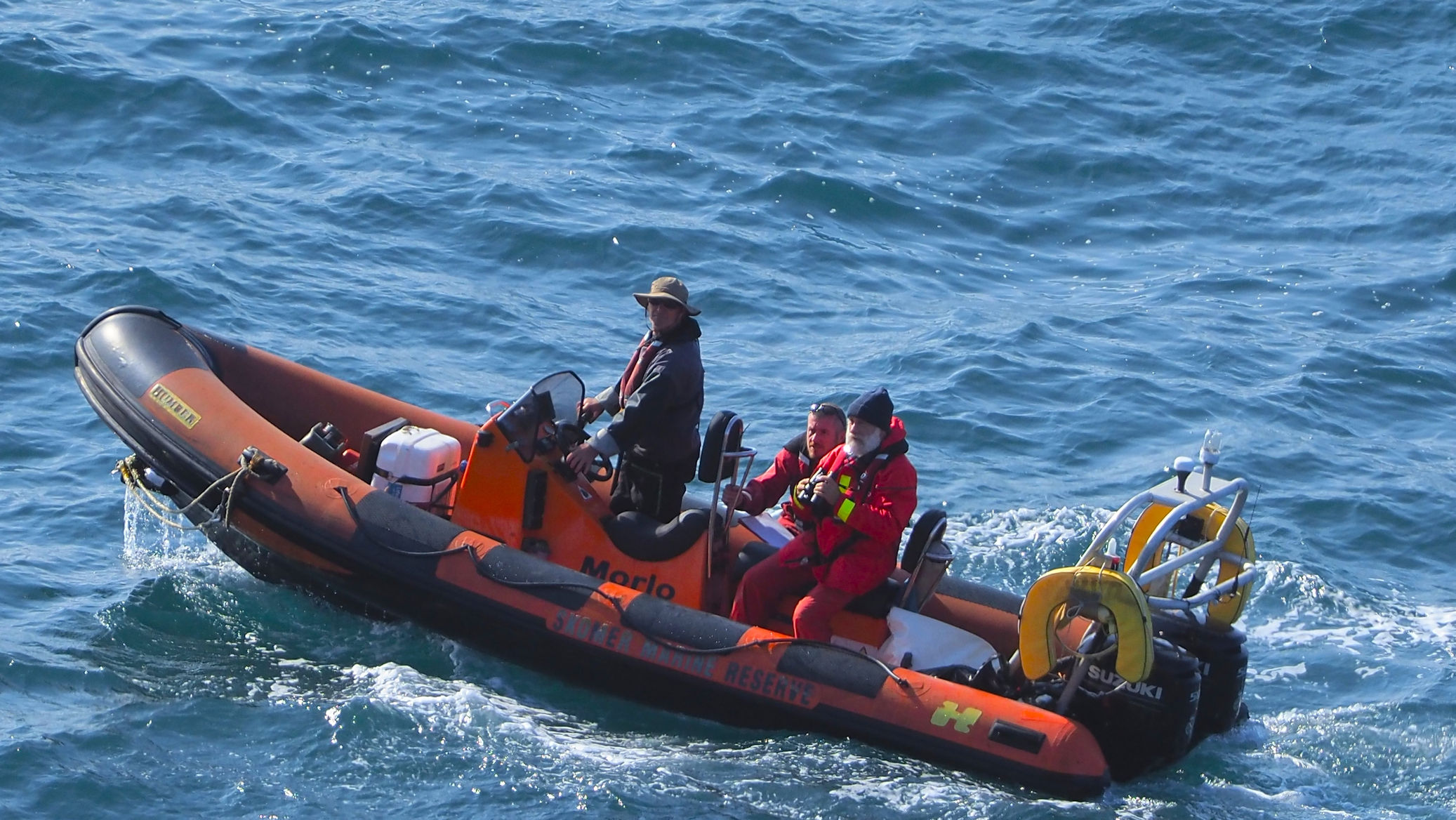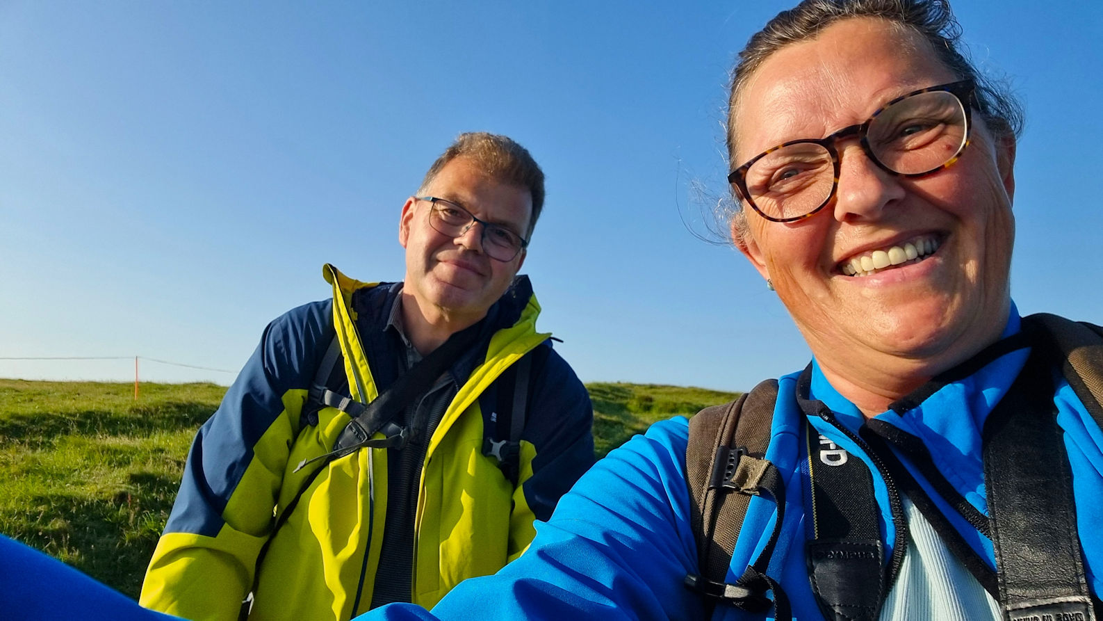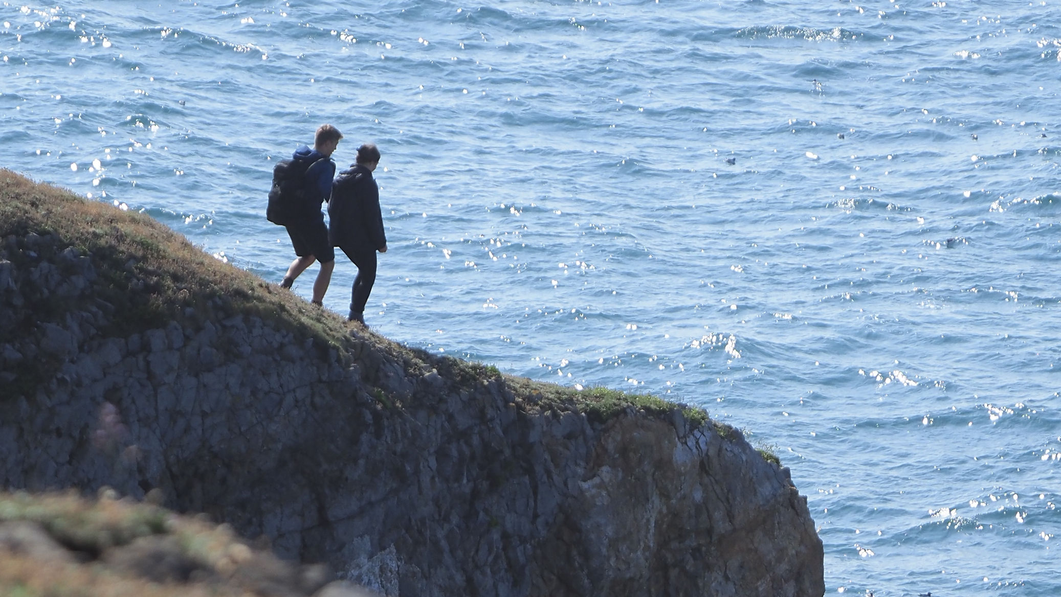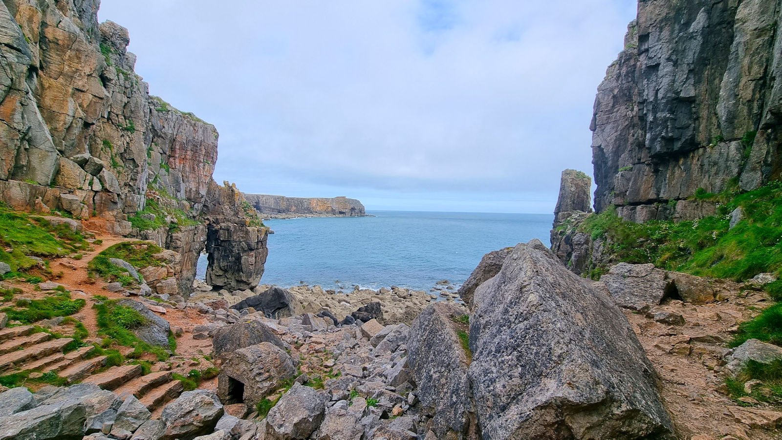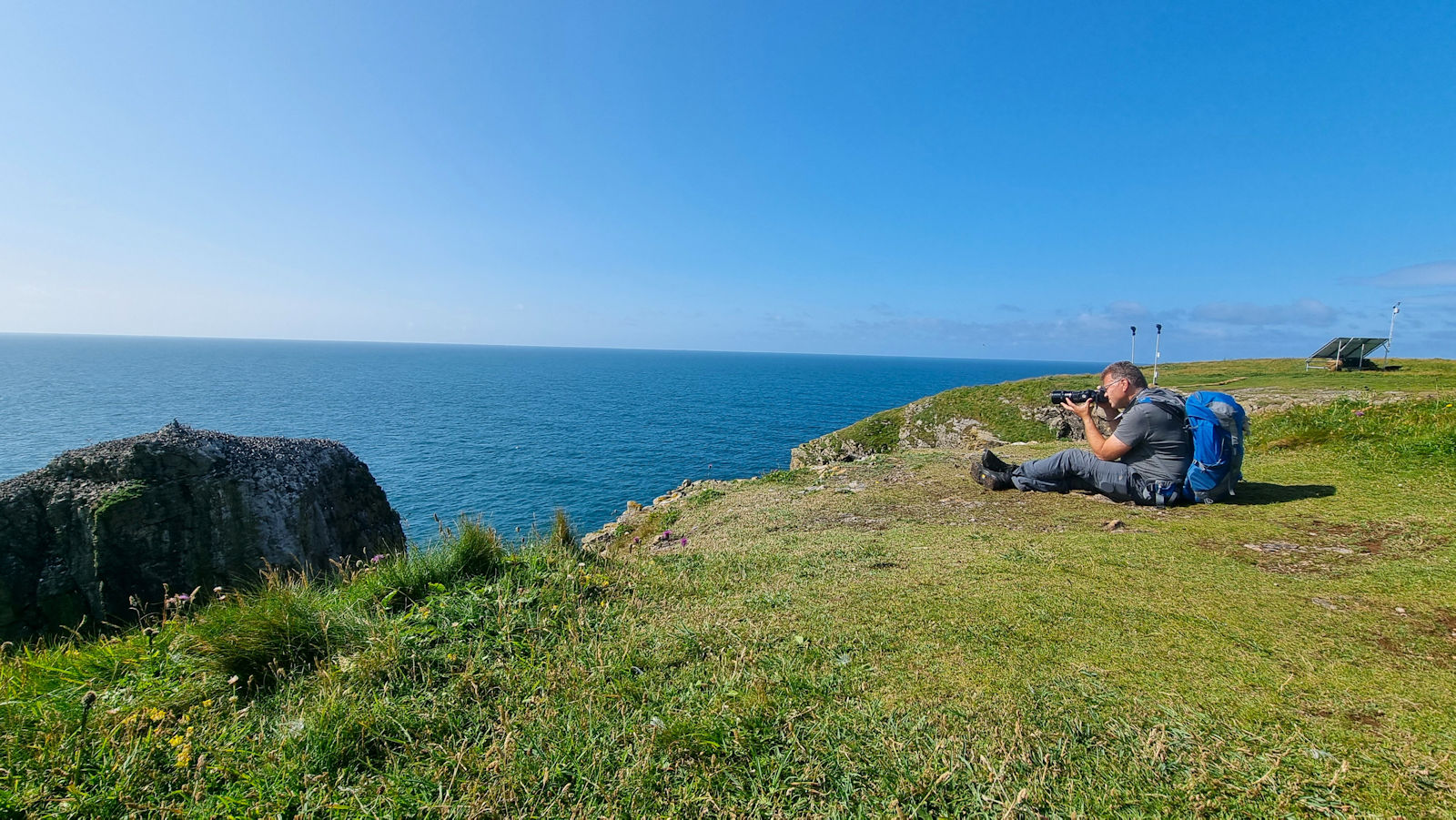 Wir bleiben einige Zeit hier, als ein älterer Herr Ulli anspricht und nach ihren Fotos fragt. Er stellt sich als privater Guide für Naturfotografie vor und hat richtig gute Tipps für diese tolle Küstenregion, dem Pembrokeshire. Mal sehen, was wir davon umsetzen können. Auch berichtet er über die Sage des engen Felseinschnittes Huntsman Gap, eine Felsspalte, die das Pferd des Jägers im Galopp noch rechtzeitig erkannt hatte und absprang. Als der Jäger bemerkte was passiert war, bekam er der Legende nach einen Herzinfarkt und starb. Das Pferd kam mit dem toten Reiter auf der anderen Seite an und brach sich ein Bein.