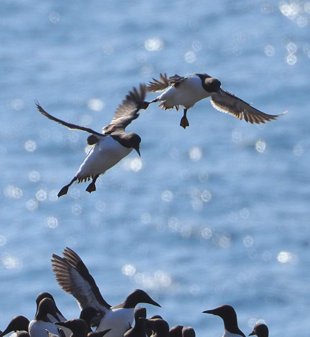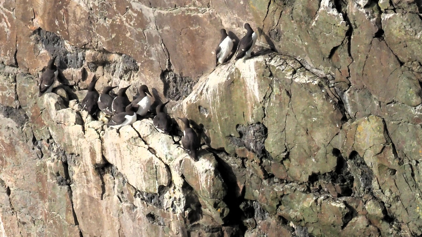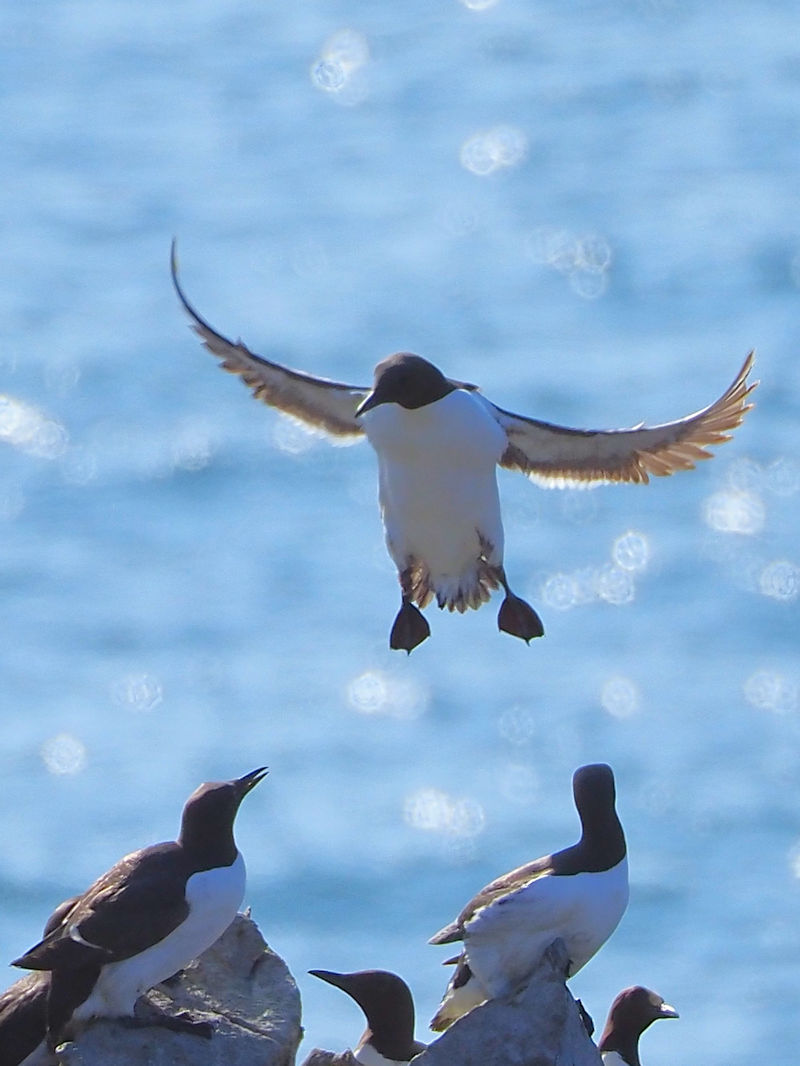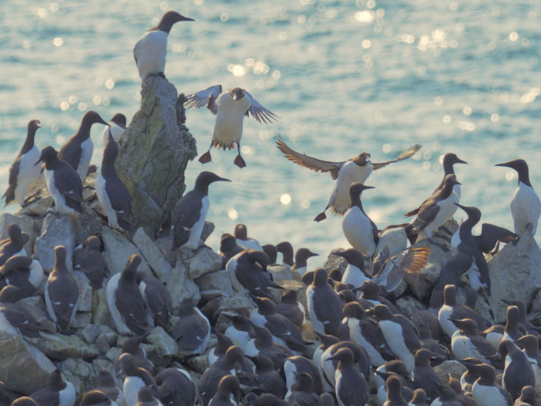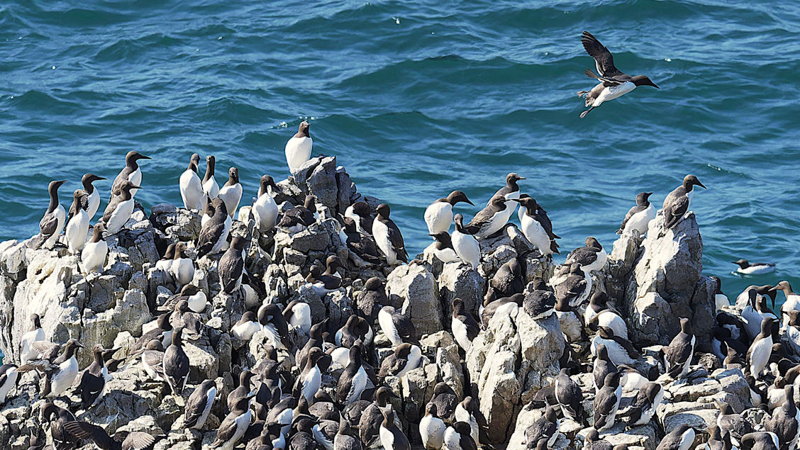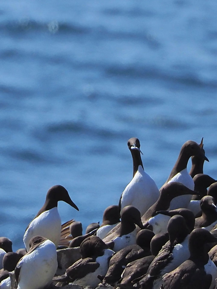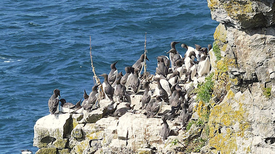 Möwen, Kaninchen und Krähen sind permanent zu sehen. Wir passieren den ein oder anderen ausgemusterten Panzer hier im militärischen Übungsgebiet und sind nach etwa 70 Minuten bei den Vogelfelsen. Hier auf dem Coastal Pfad kann man die vielen Vögel nur riechen, man hört sie aber nicht. Erst etwa 30 Meter bevor die Felsen in die Tiefe stürzen, kommt auch der Ton hinzu und der ist überwältigend schön und laut. Aus verschiedenen Positionen entstehen Bilder dieser wundervollen und jetzt im Frühjahr von Trottellummen stark bevölkerten Felsformationen.
