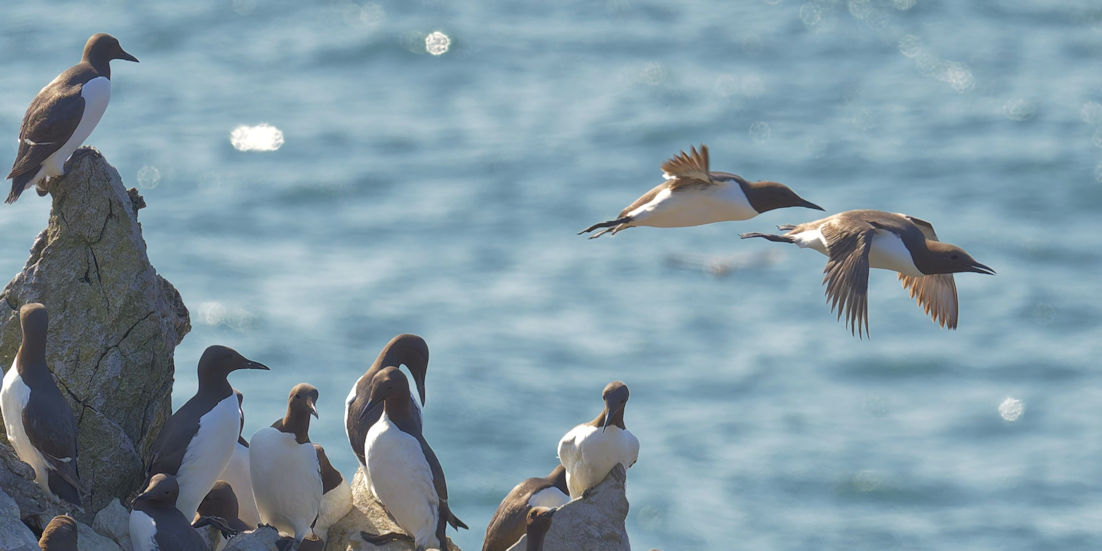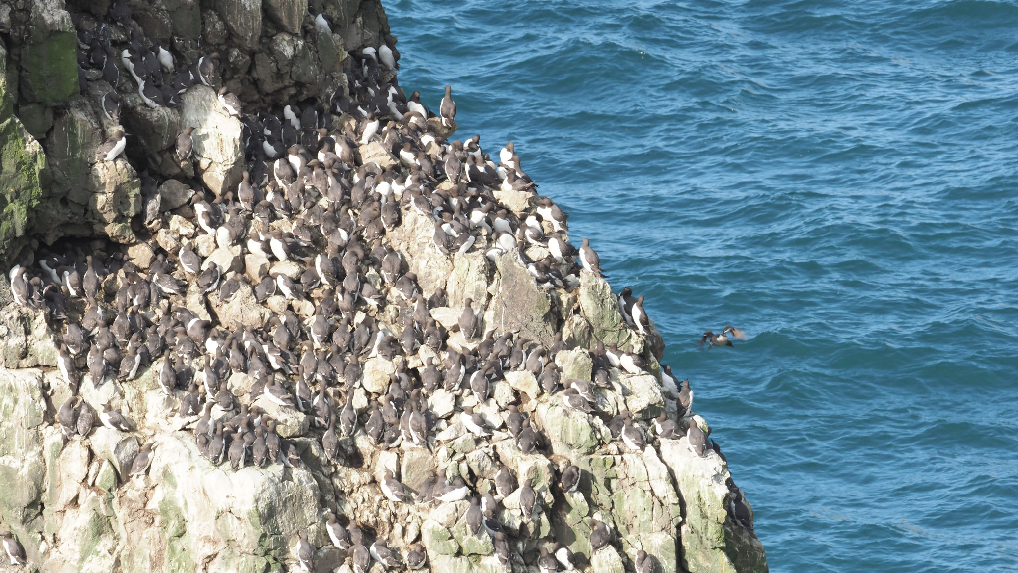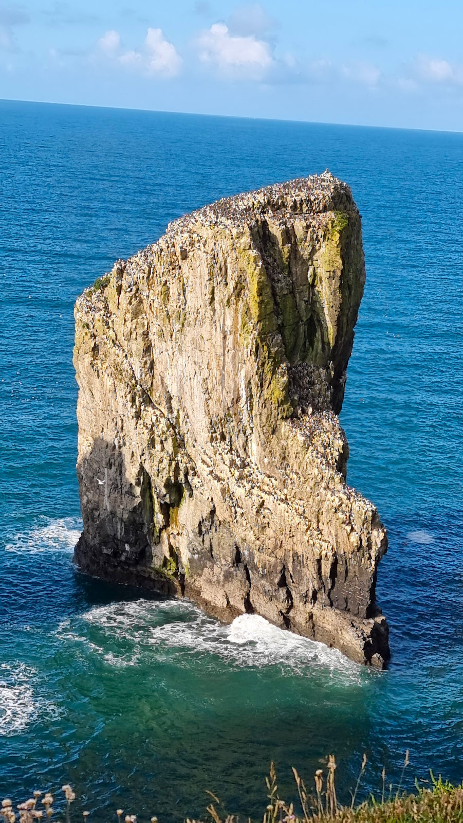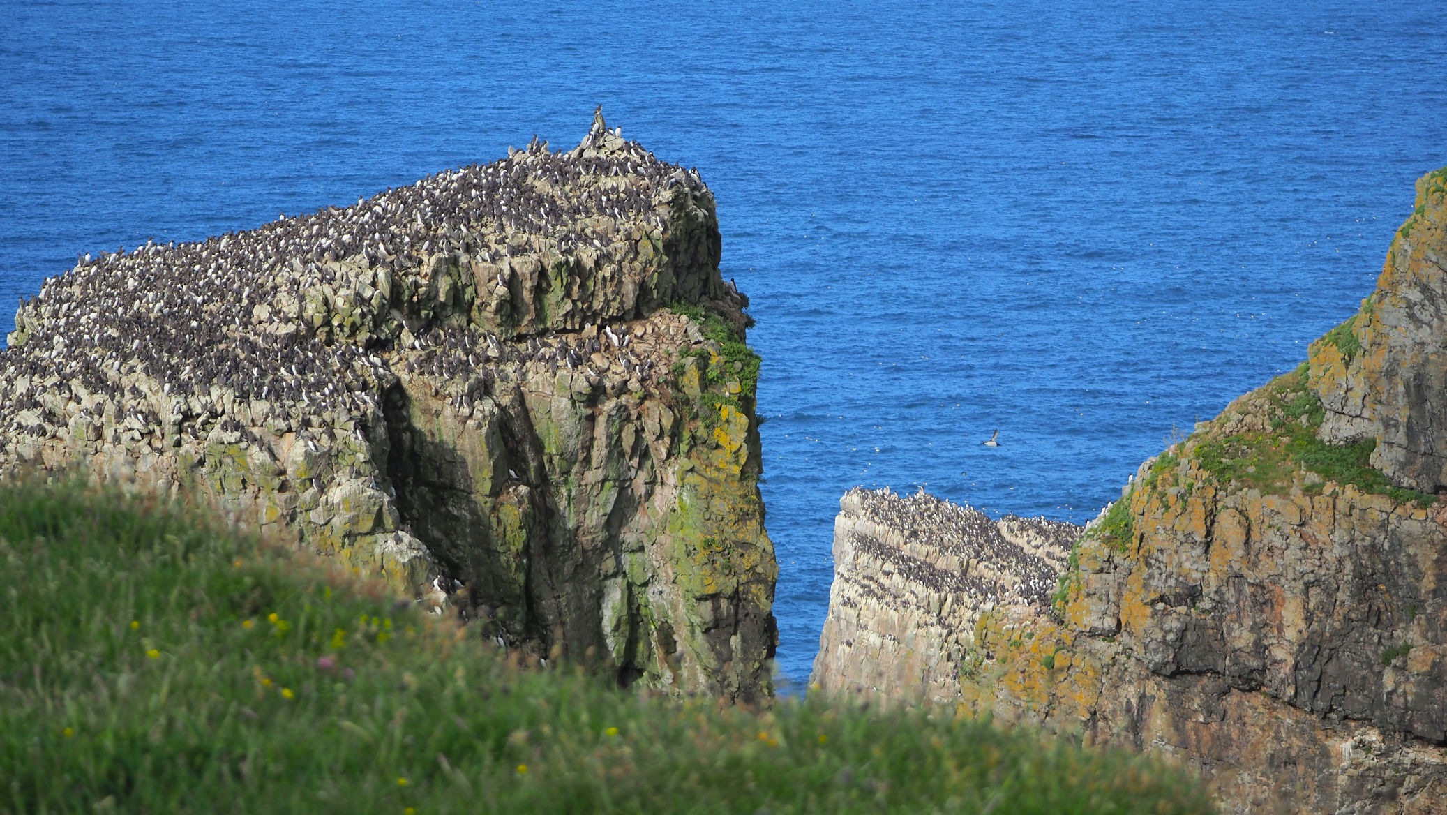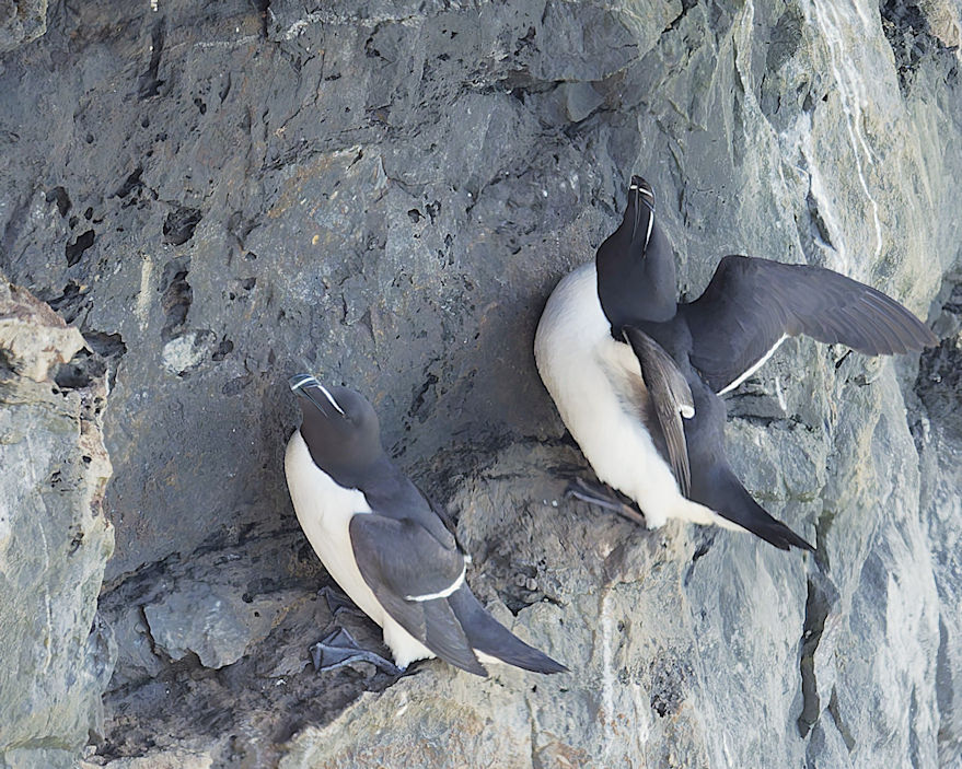 Möwen, Kaninchen und Krähen sind permanent zu sehen. Wir passieren den ein oder anderen ausgemusterten Panzer hier im militärischen Übungsgebiet und sind nach etwa 70 Minuten bei den Vogelfelsen. Hier auf dem Coastal Pfad kann man die vielen Vögel nur riechen, man hört sie aber nicht. Erst etwa 30 Meter bevor die Felsen in die Tiefe stürzen, kommt auch der Ton hinzu und der ist überwältigend schön und laut. Aus verschiedenen Positionen entstehen Bilder dieser wundervollen und jetzt im Frühjahr von Trottellummen stark bevölkerten Felsformationen.