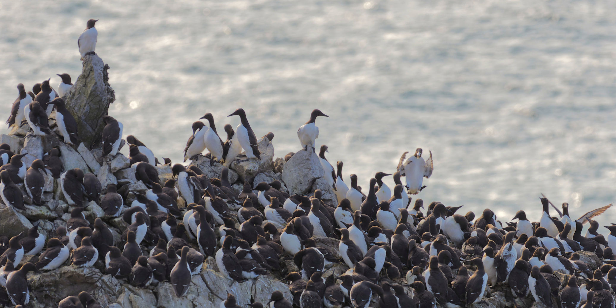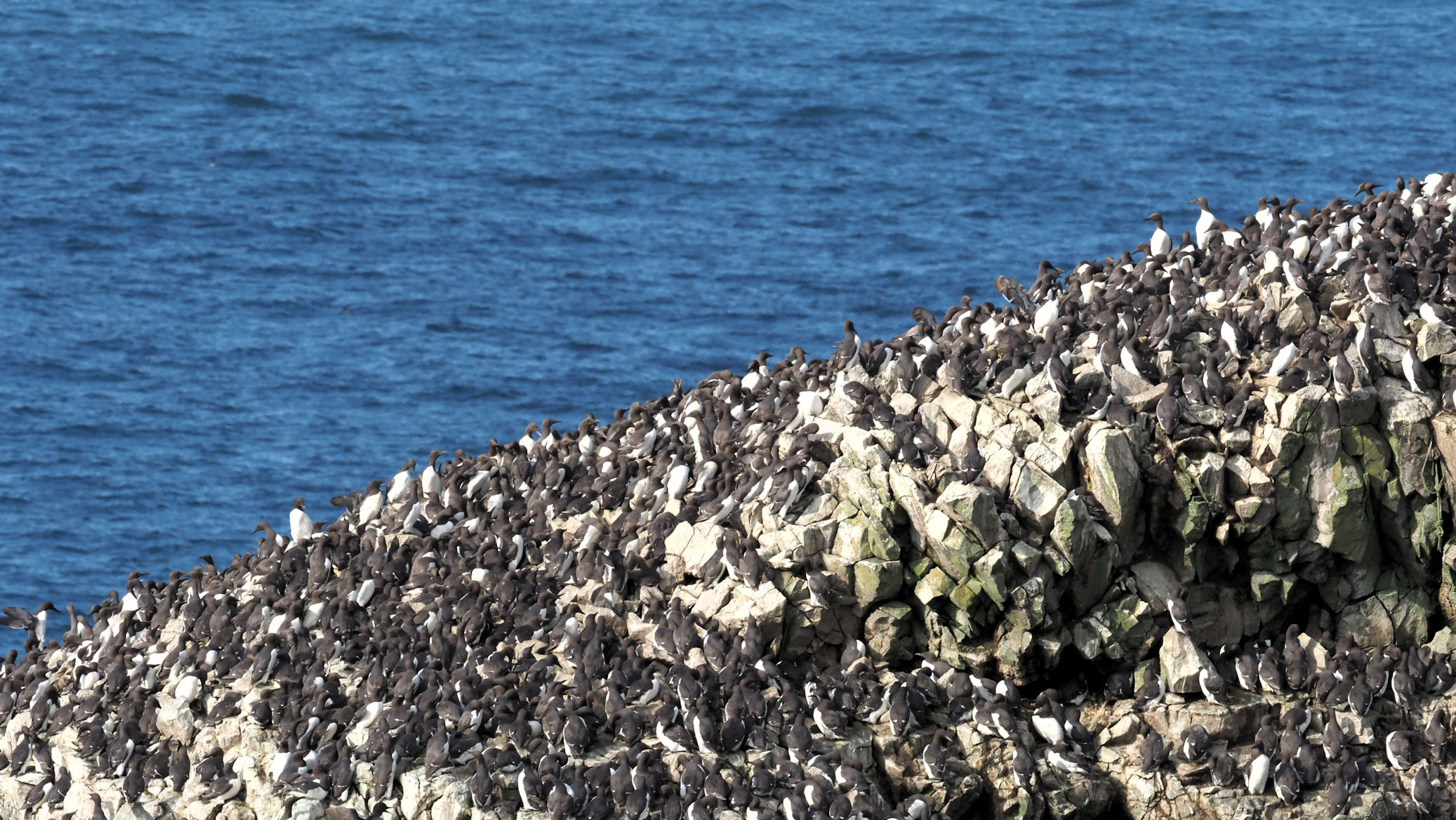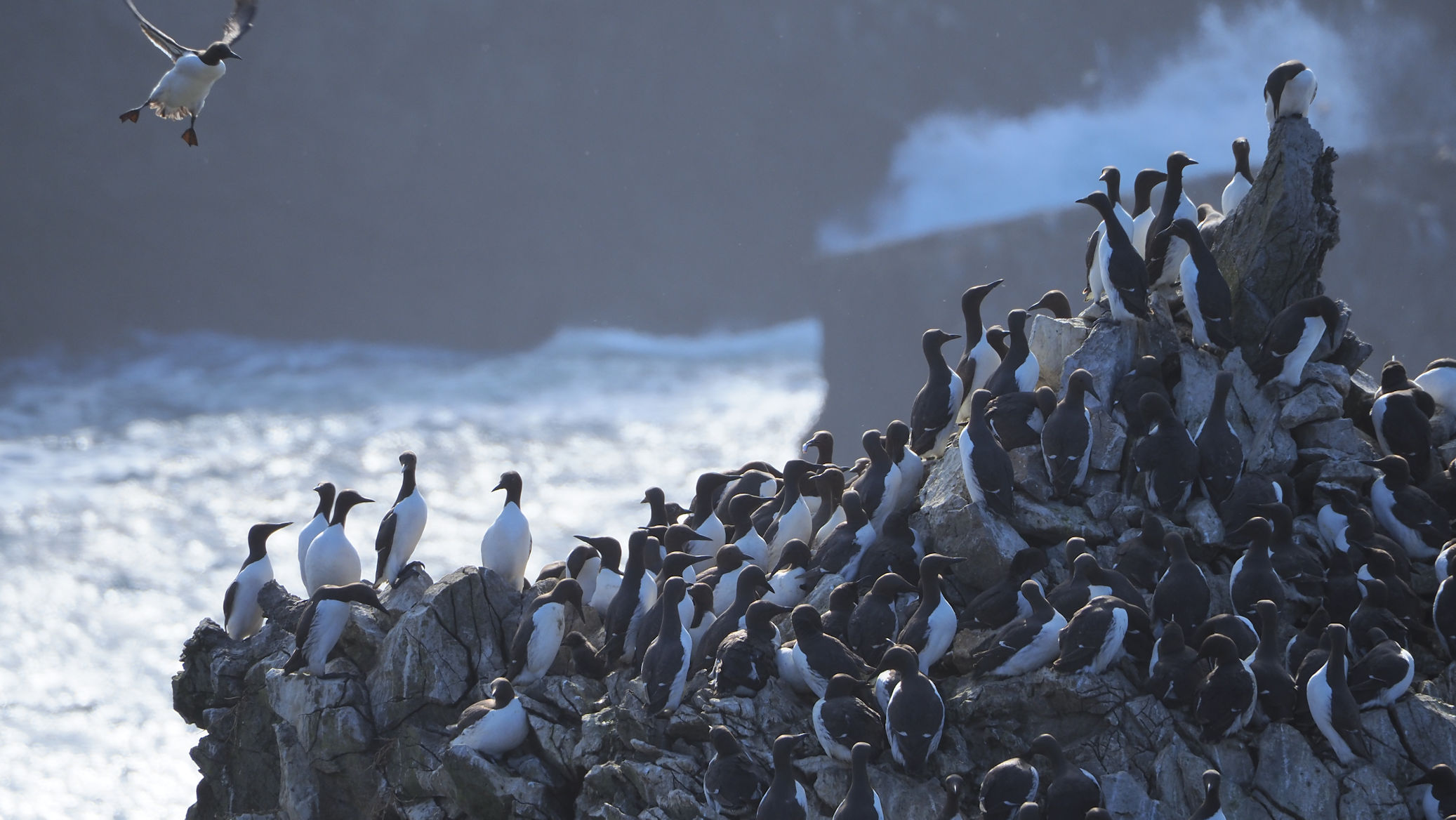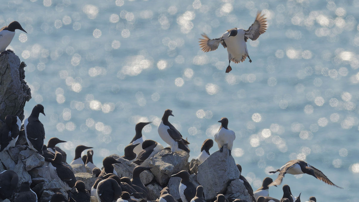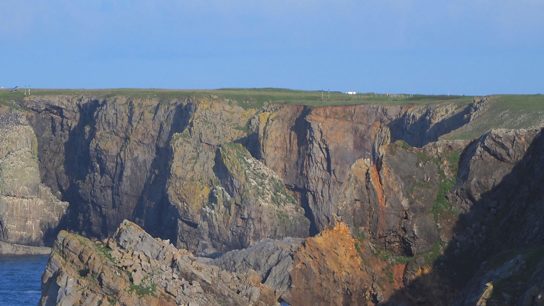 Möwen, Kaninchen und Krähen sind permanent zu sehen. Wir passieren den ein oder anderen ausgemusterten Panzer hier im militärischen Übungsgebiet und sind nach etwa 70 Minuten bei den Vogelfelsen. Hier auf dem Coastal Pfad kann man die vielen Vögel nur riechen, man hört sie aber nicht. Erst etwa 30 Meter bevor die Felsen in die Tiefe stürzen, kommt auch der Ton hinzu und der ist überwältigend schön und laut. Aus verschiedenen Positionen entstehen Bilder dieser wundervollen und jetzt im Frühjahr von Trottellummen stark bevölkerten Felsformationen.