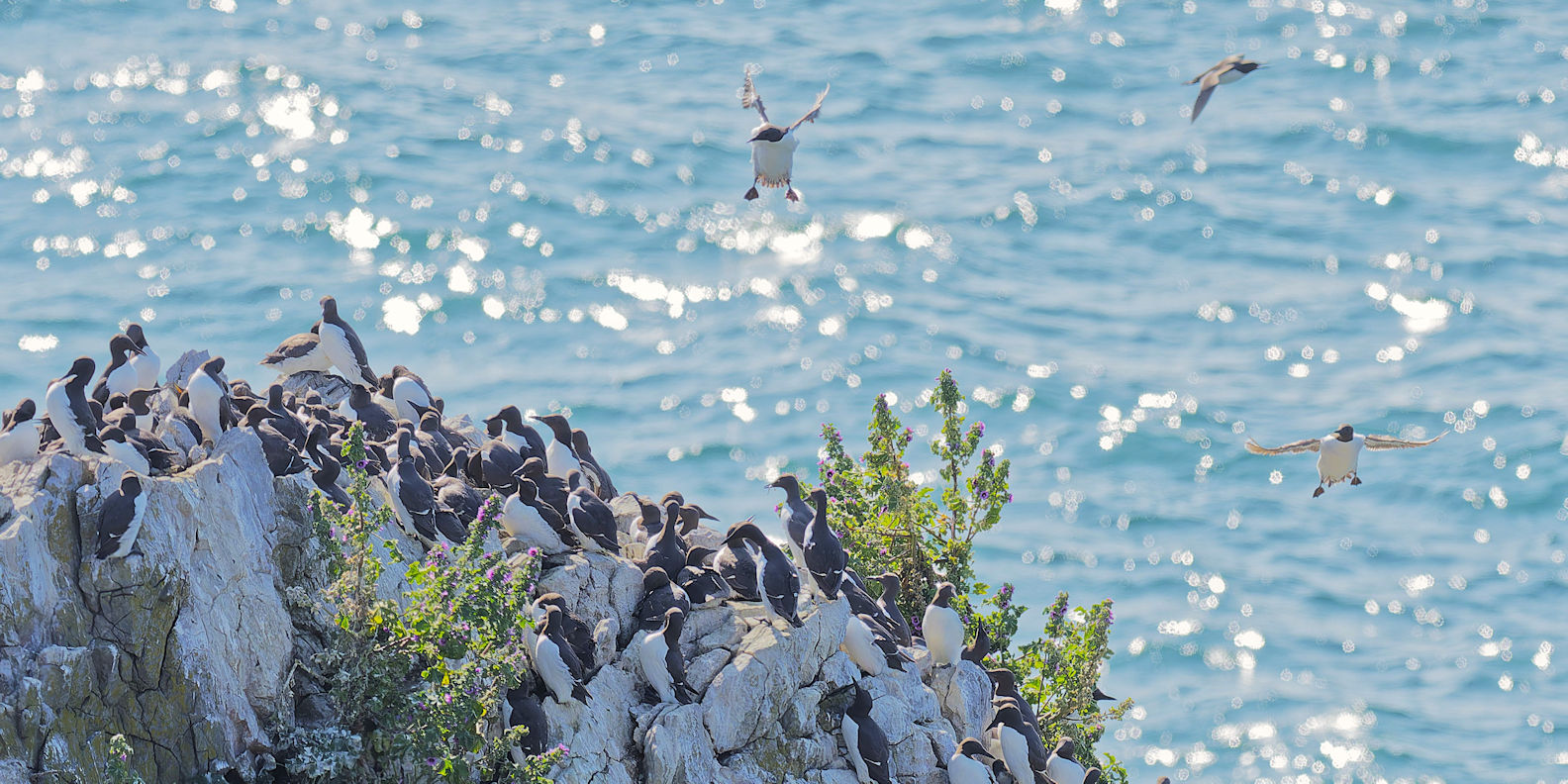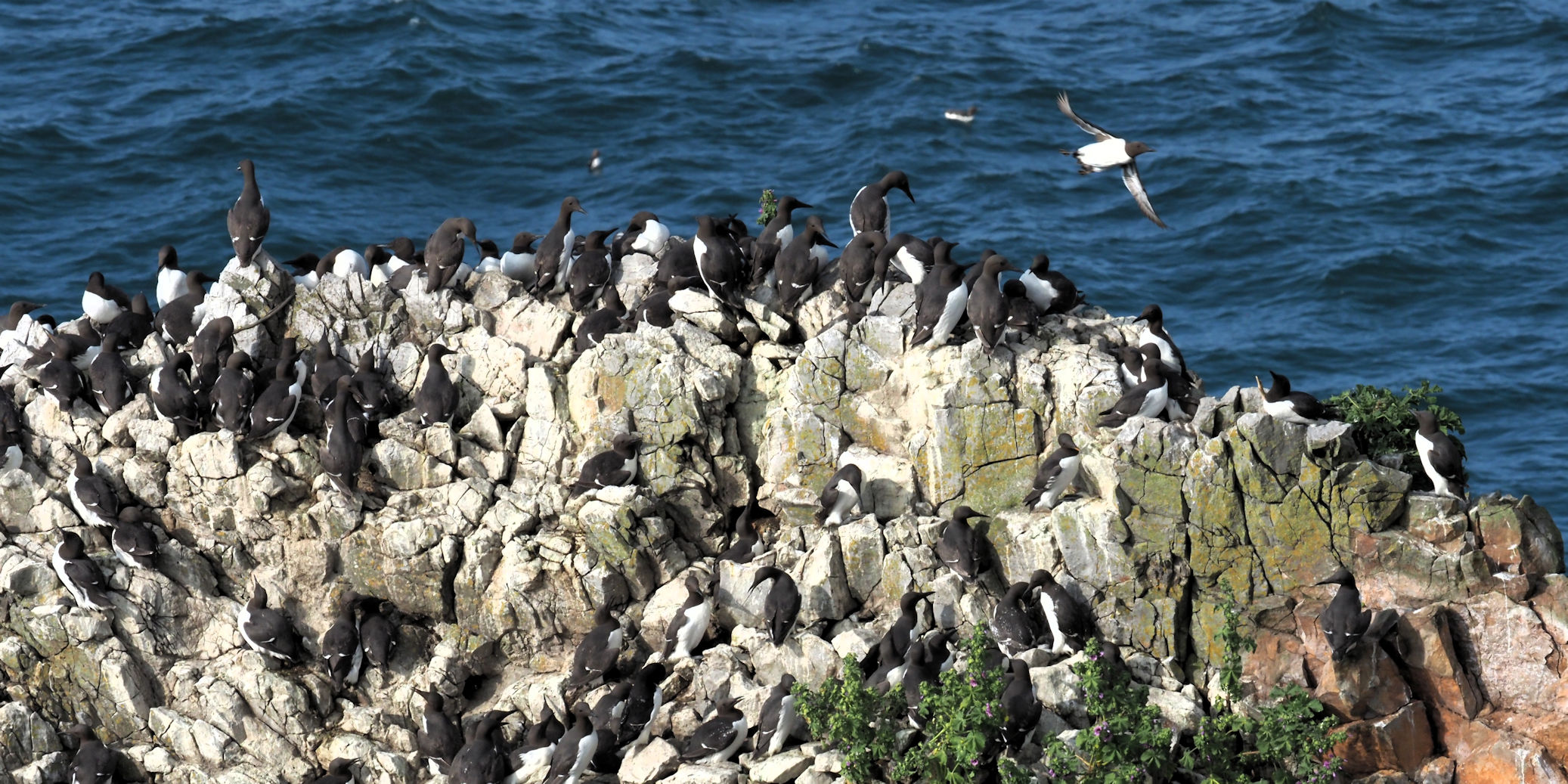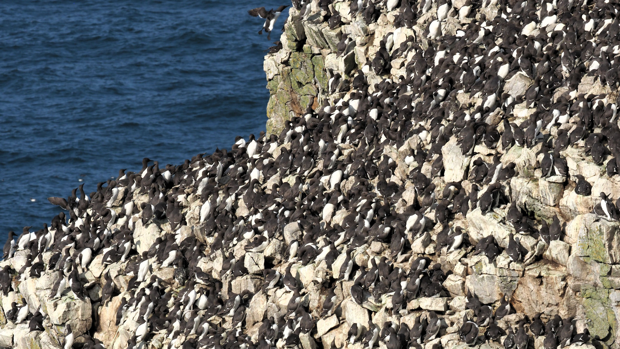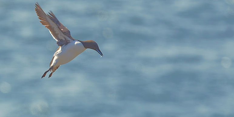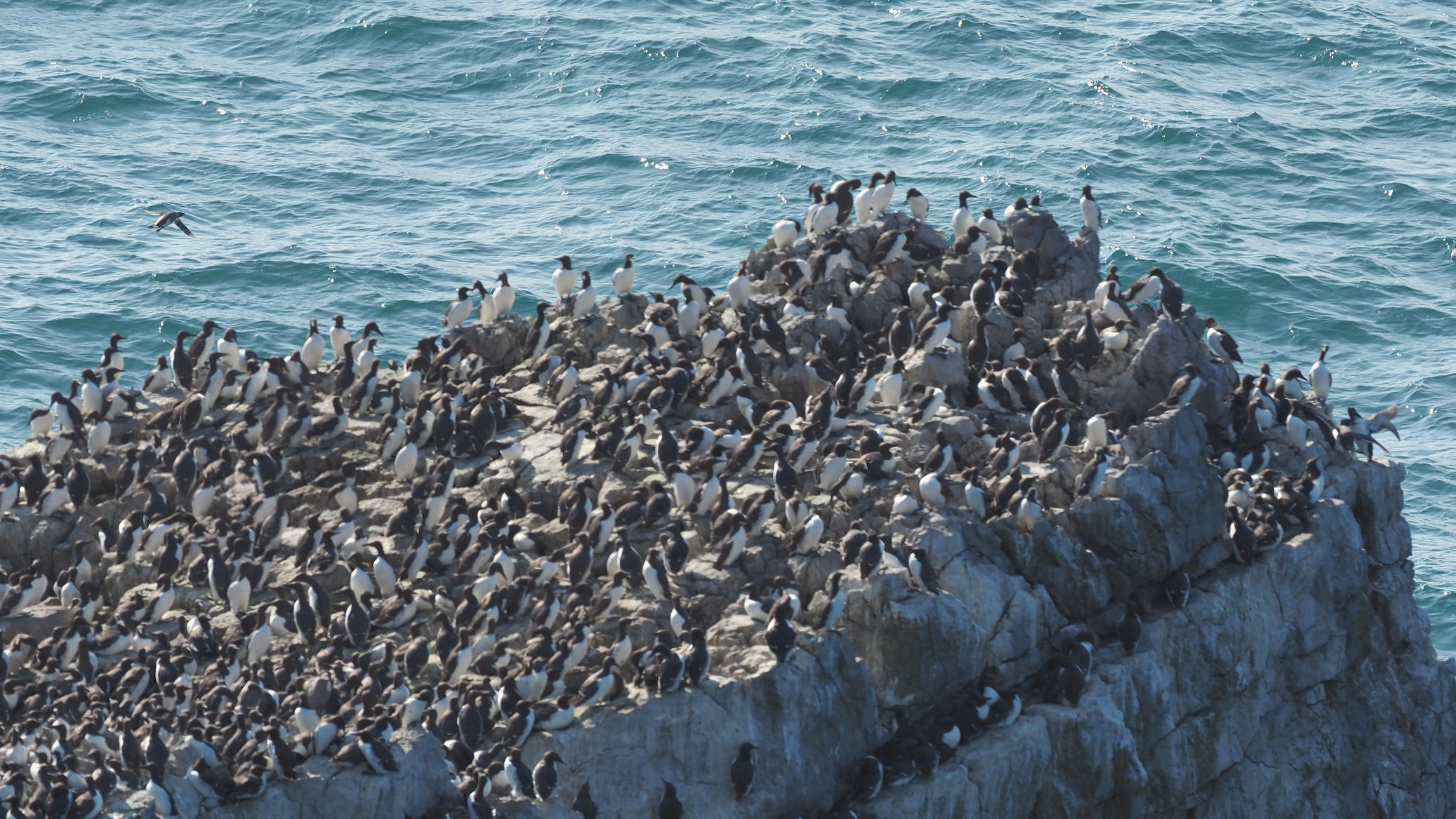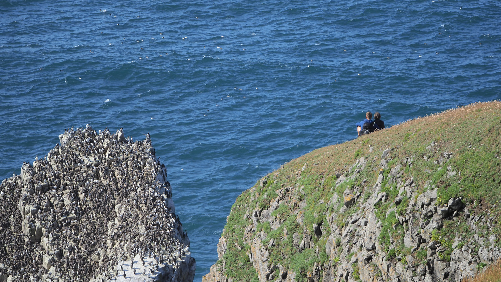 Möwen, Kaninchen und Krähen sind permanent zu sehen. Wir passieren den ein oder anderen ausgemusterten Panzer hier im militärischen Übungsgebiet und sind nach etwa 70 Minuten bei den Vogelfelsen. Hier auf dem Coastal Pfad kann man die vielen Vögel nur riechen, man hört sie aber nicht. Erst etwa 30 Meter bevor die Felsen in die Tiefe stürzen, kommt auch der Ton hinzu und der ist überwältigend schön und laut. Aus verschiedenen Positionen entstehen Bilder dieser wundervollen und jetzt im Frühjahr von Trottellummen stark bevölkerten Felsformationen.