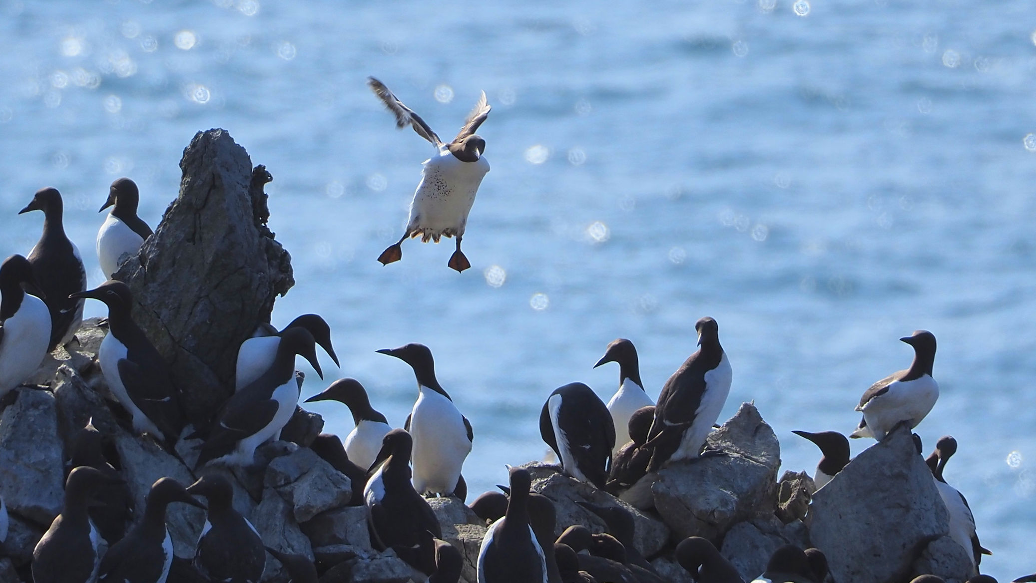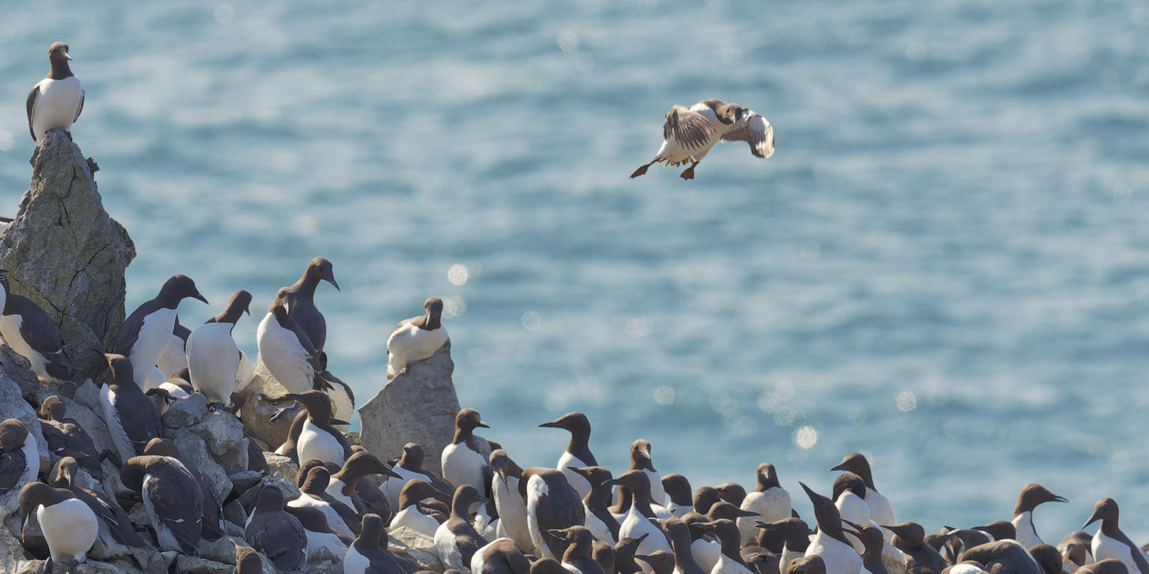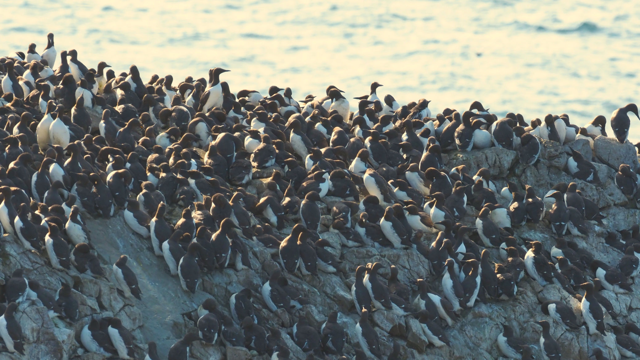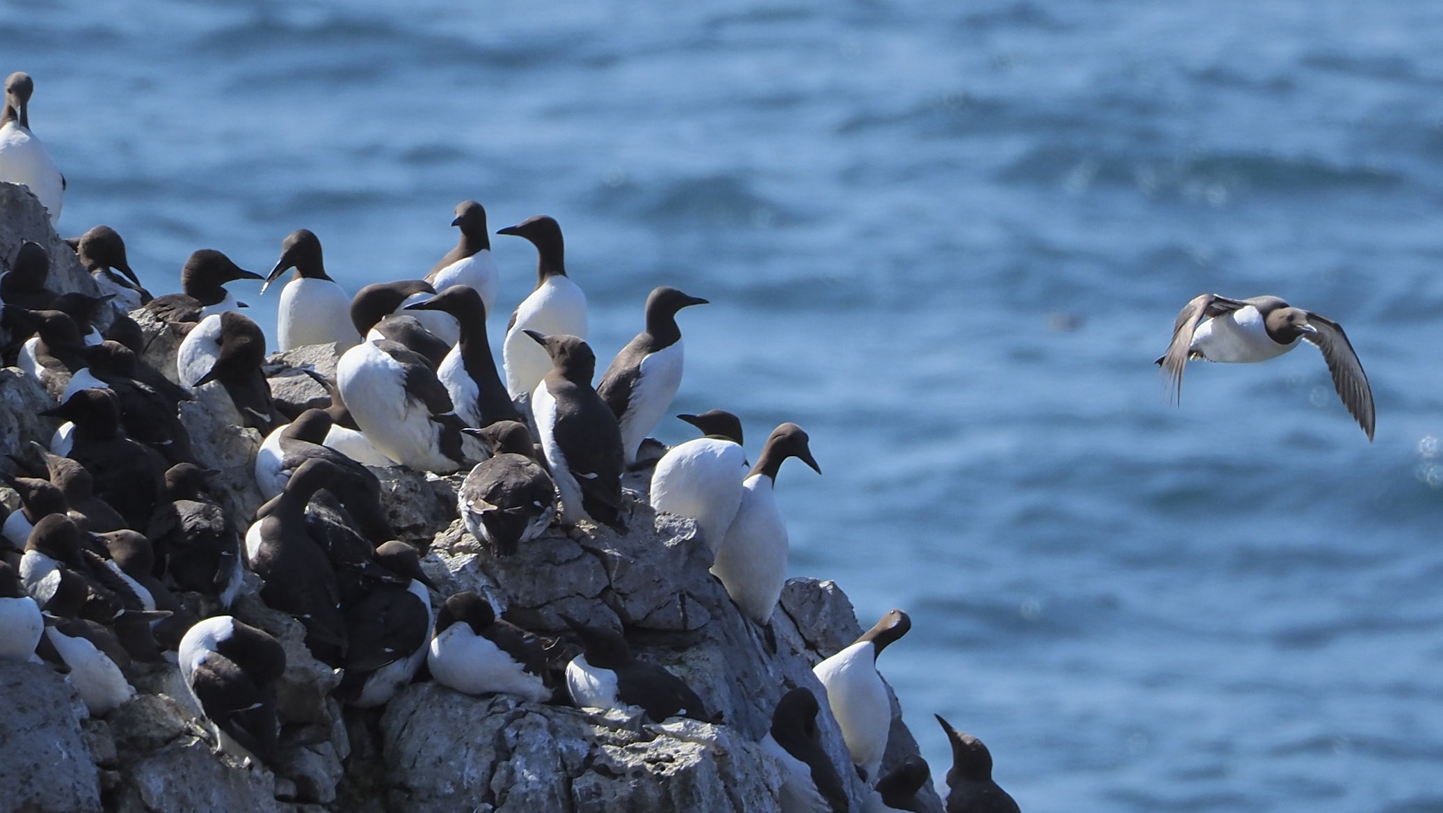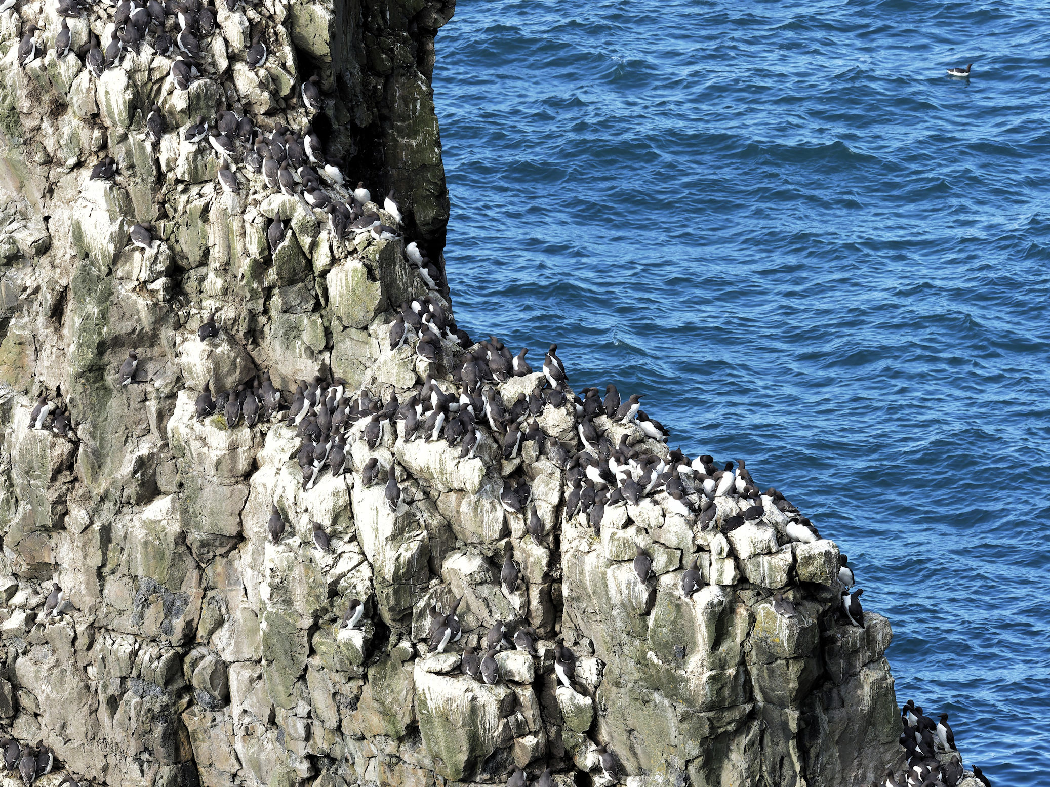 Möwen, Kaninchen und Krähen sind permanent zu sehen. Wir passieren den ein oder anderen ausgemusterten Panzer hier im militärischen Übungsgebiet und sind nach etwa 70 Minuten bei den Vogelfelsen. Hier auf dem Coastal Pfad kann man die vielen Vögel nur riechen, man hört sie aber nicht. Erst etwa 30 Meter bevor die Felsen in die Tiefe stürzen, kommt auch der Ton hinzu und der ist überwältigend schön und laut. Aus verschiedenen Positionen entstehen Bilder dieser wundervollen und jetzt im Frühjahr von Trottellummen stark bevölkerten Felsformationen.
