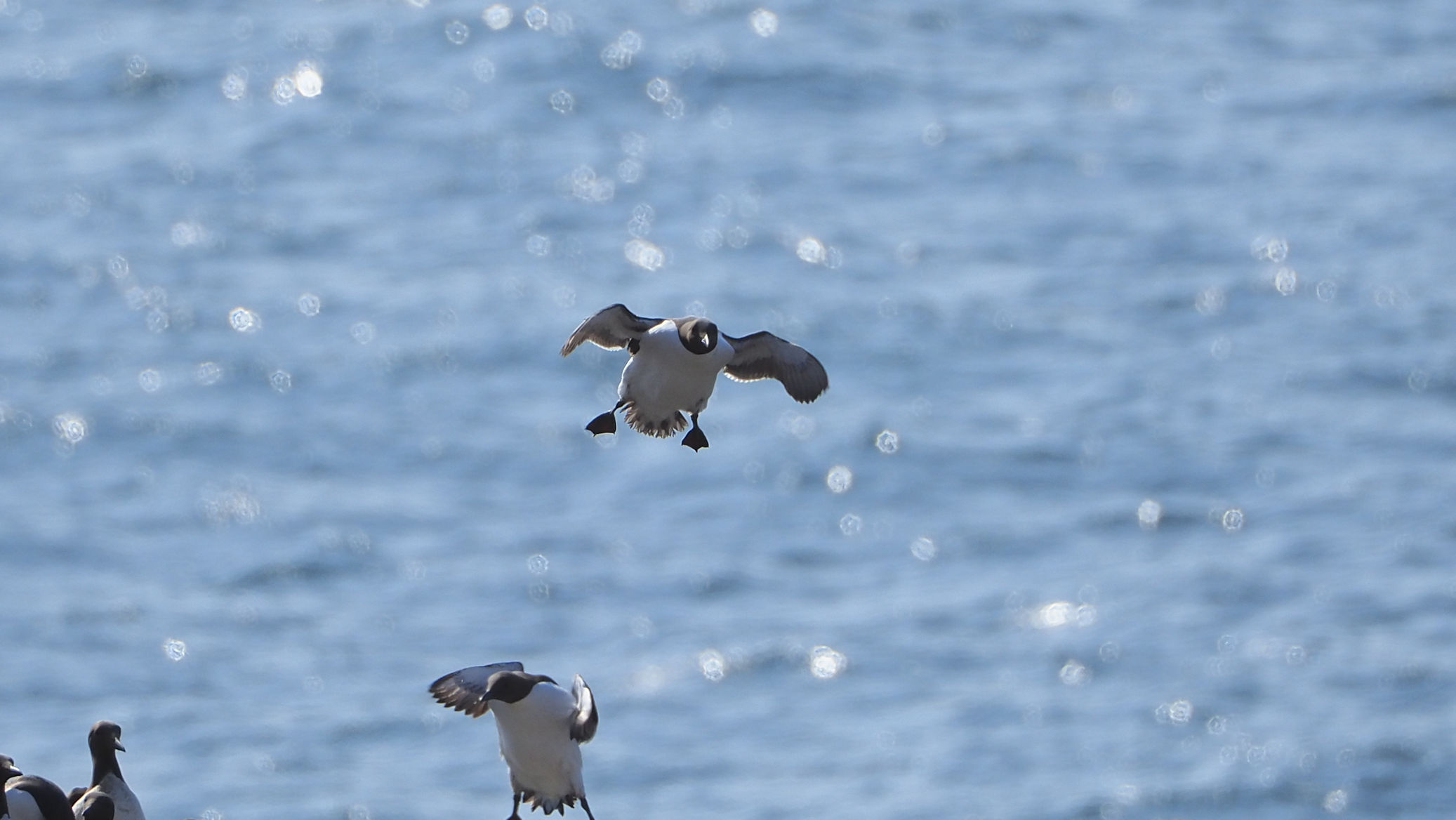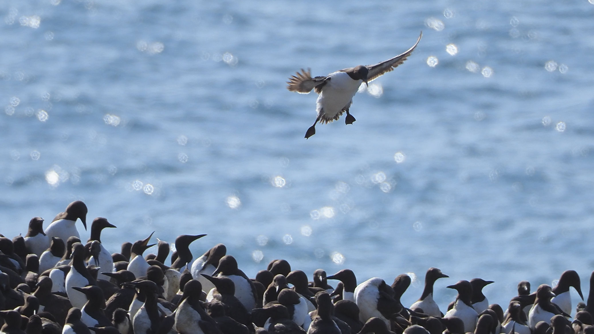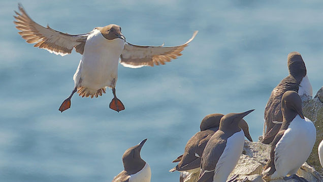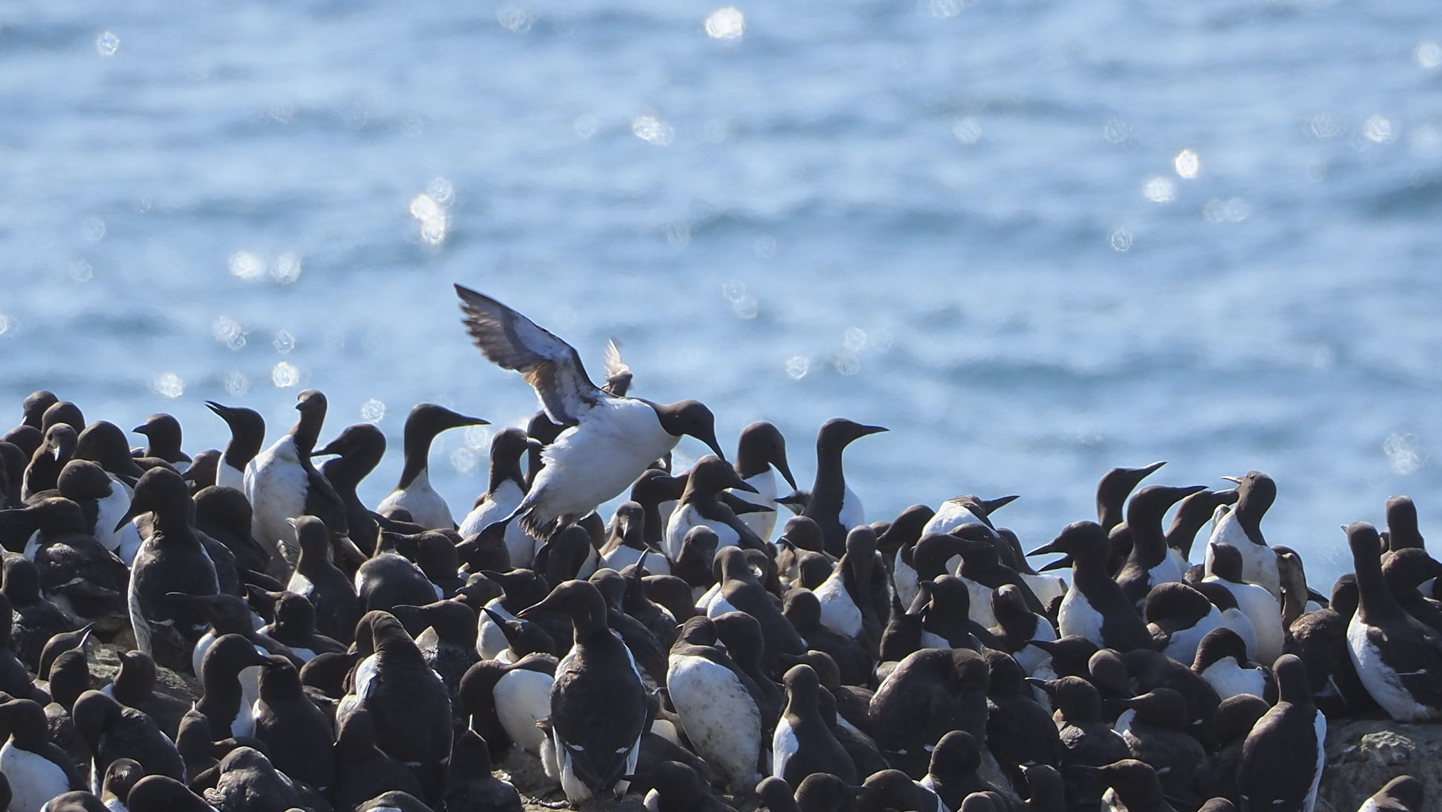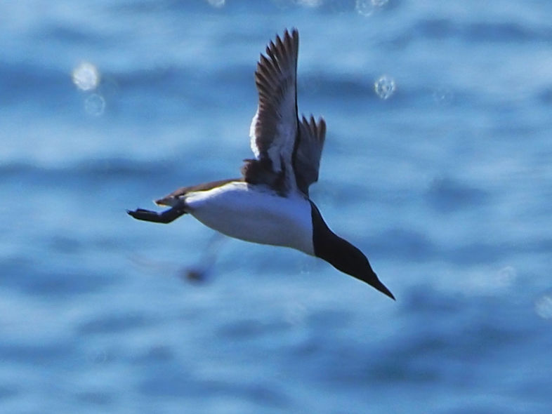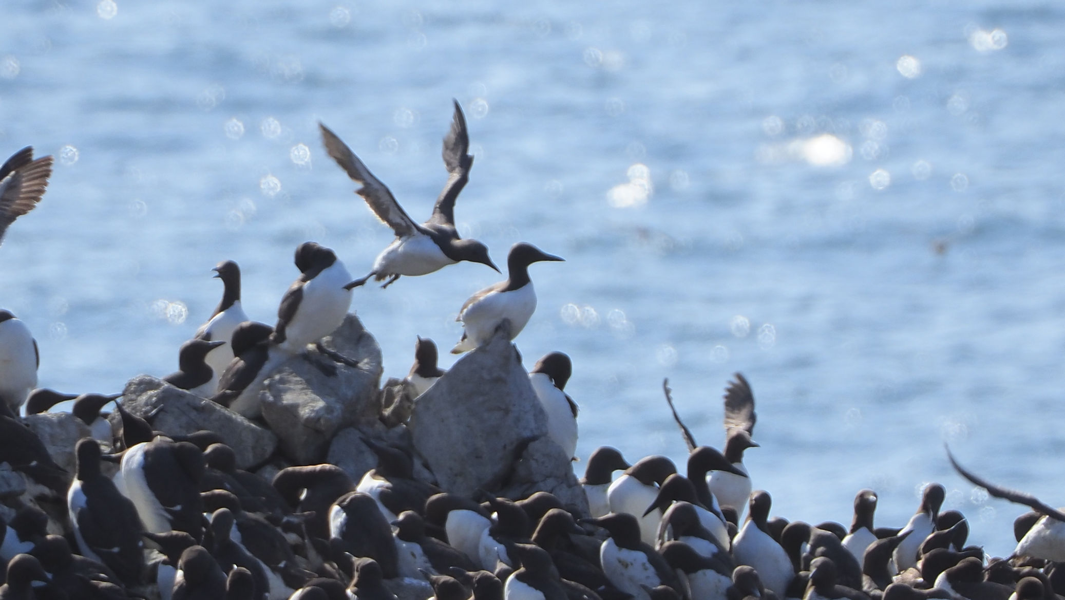 Möwen, Kaninchen und Krähen sind permanent zu sehen. Wir passieren den ein oder anderen ausgemusterten Panzer hier im militärischen Übungsgebiet und sind nach etwa 70 Minuten bei den Vogelfelsen. Hier auf dem Coastal Pfad kann man die vielen Vögel nur riechen, man hört sie aber nicht. Erst etwa 30 Meter bevor die Felsen in die Tiefe stürzen, kommt auch der Ton hinzu und der ist überwältigend schön und laut. Aus verschiedenen Positionen entstehen Bilder dieser wundervollen und jetzt im Frühjahr von Trottellummen stark bevölkerten Felsformationen.