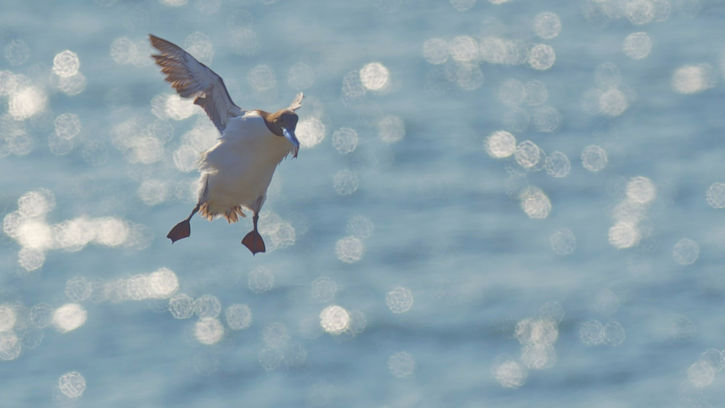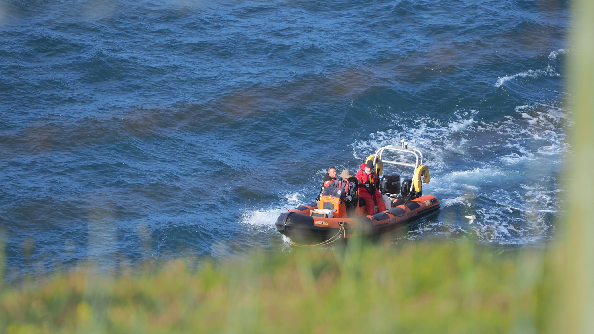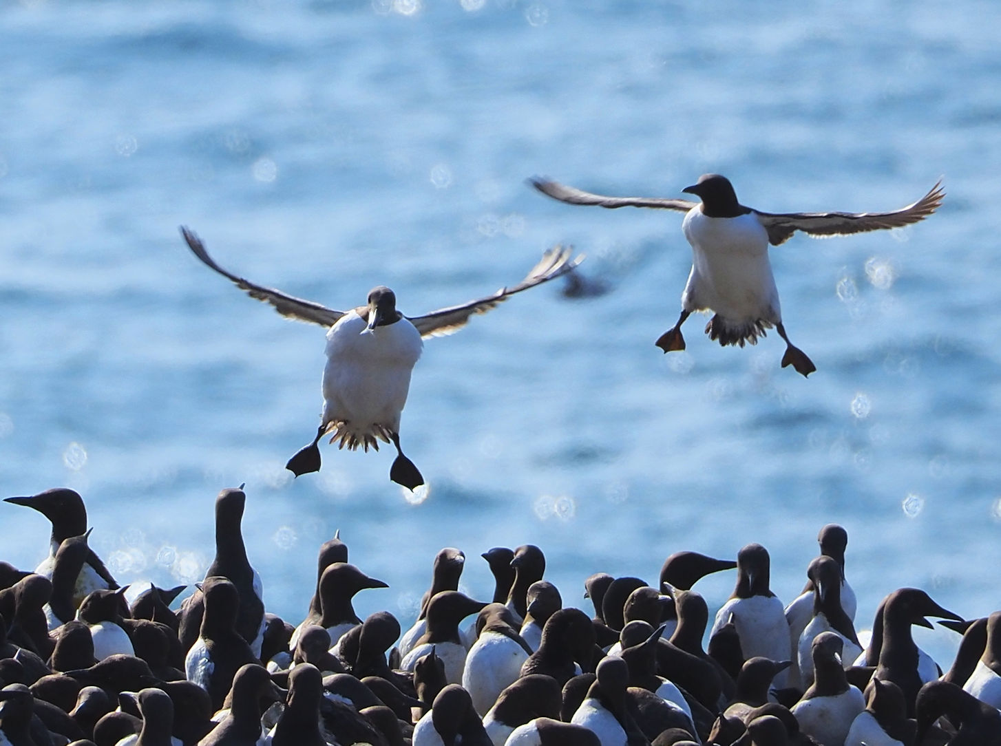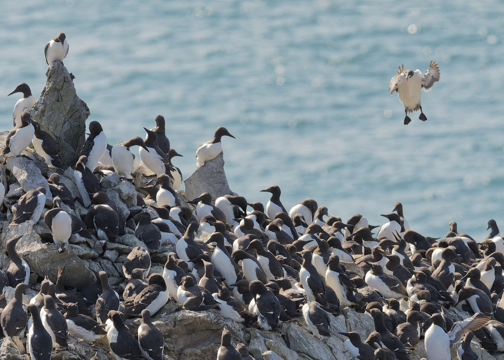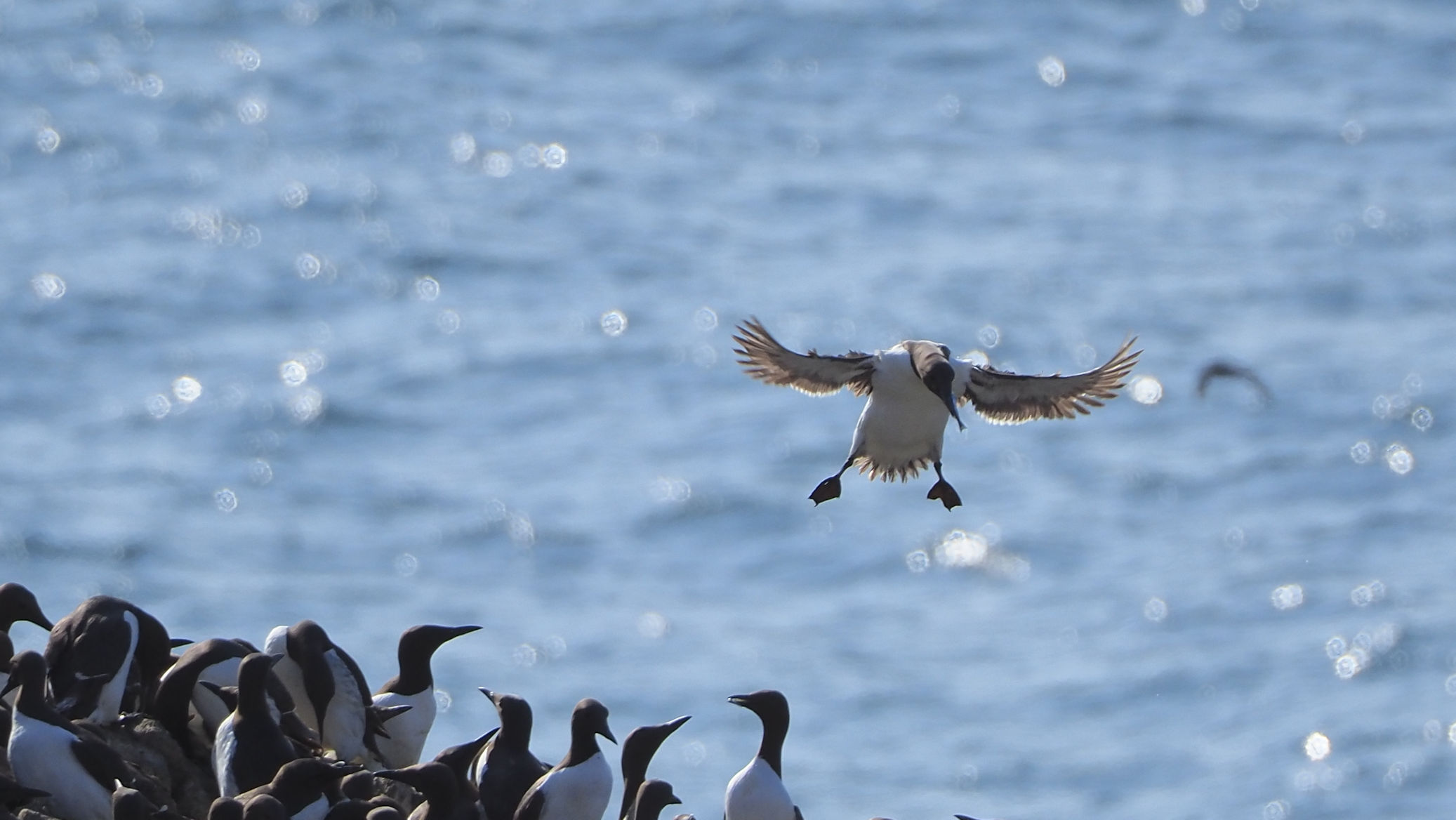 Möwen, Kaninchen und Krähen sind permanent zu sehen. Wir passieren den ein oder anderen ausgemusterten Panzer hier im militärischen Übungsgebiet und sind nach etwa 70 Minuten bei den Vogelfelsen. Hier auf dem Coastal Pfad kann man die vielen Vögel nur riechen, man hört sie aber nicht. Erst etwa 30 Meter bevor die Felsen in die Tiefe stürzen, kommt auch der Ton hinzu und der ist überwältigend schön und laut. Aus verschiedenen Positionen entstehen Bilder dieser wundervollen und jetzt im Frühjahr von Trottellummen stark bevölkerten Felsformationen.