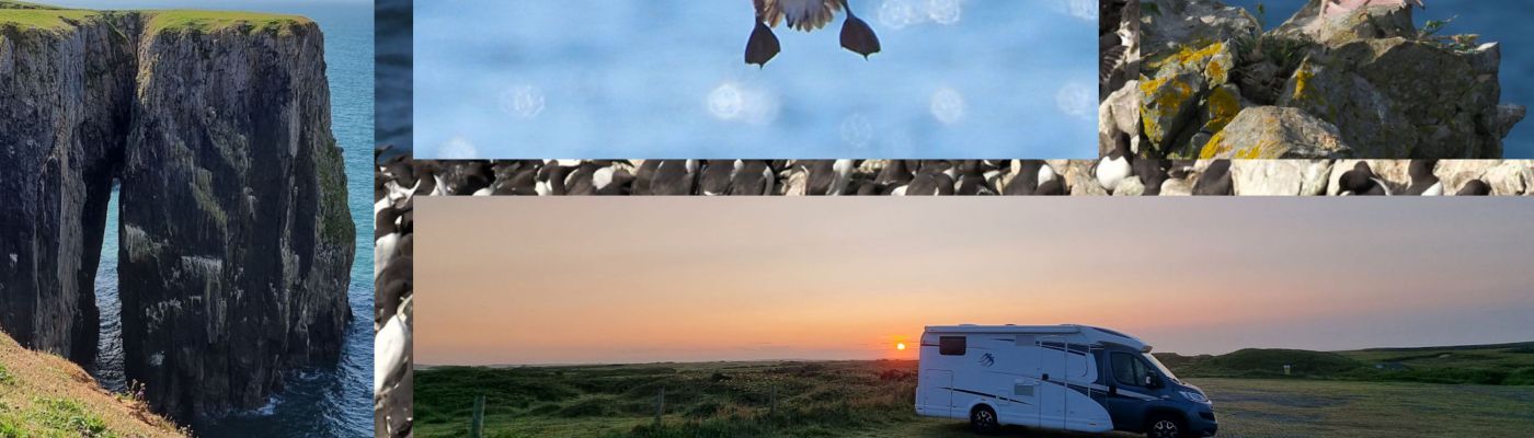 Wir bleiben einige Zeit hier, als ein älterer Herr Ulli anspricht und nach ihren Fotos fragt. Er stellt sich als privater Guide für Naturfotografie vor und hat richtig gute Tipps für diese tolle Küstenregion, dem Pembrokeshire. Mal sehen, was wir davon umsetzen können. Auch berichtet er über die Sage des engen Felseinschnittes Huntsman Gap, eine Felsspalte, die das Pferd des Jägers im Galopp noch rechtzeitig erkannt hatte und absprang. Als der Jäger bemerkte was passiert war, bekam er der Legende nach einen Herzinfarkt und starb. Das Pferd kam mit dem toten Reiter auf der anderen Seite an und brach sich ein Bein.