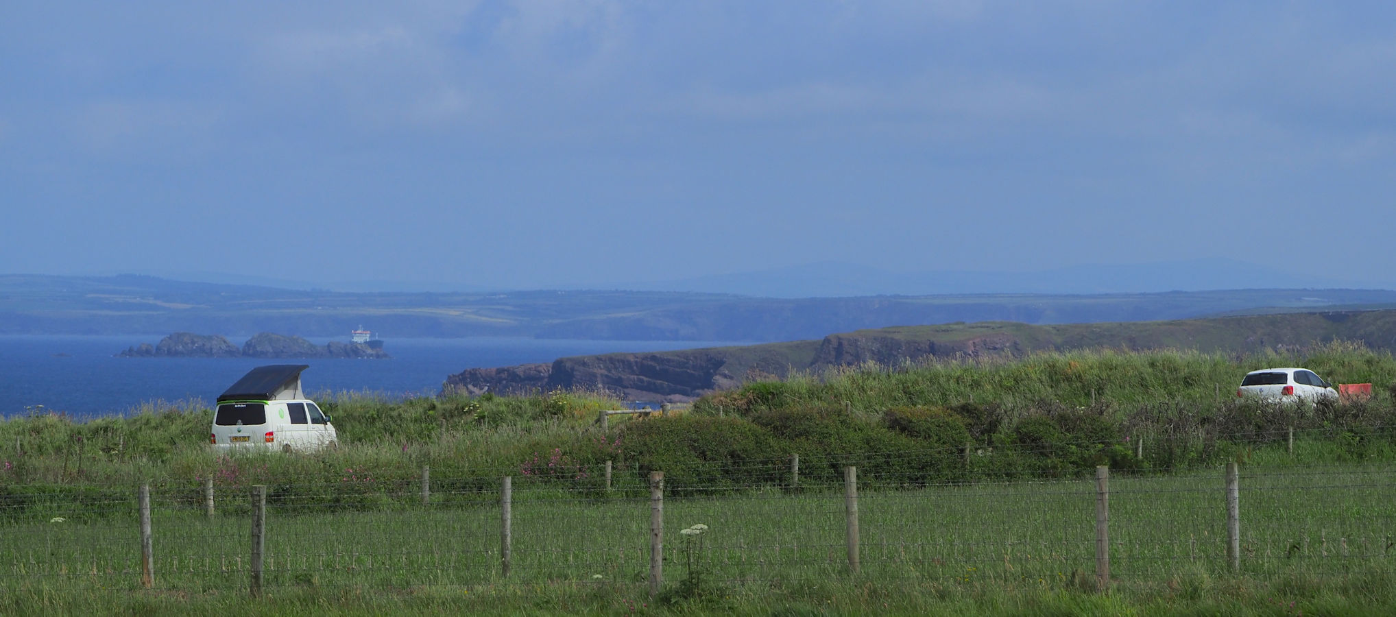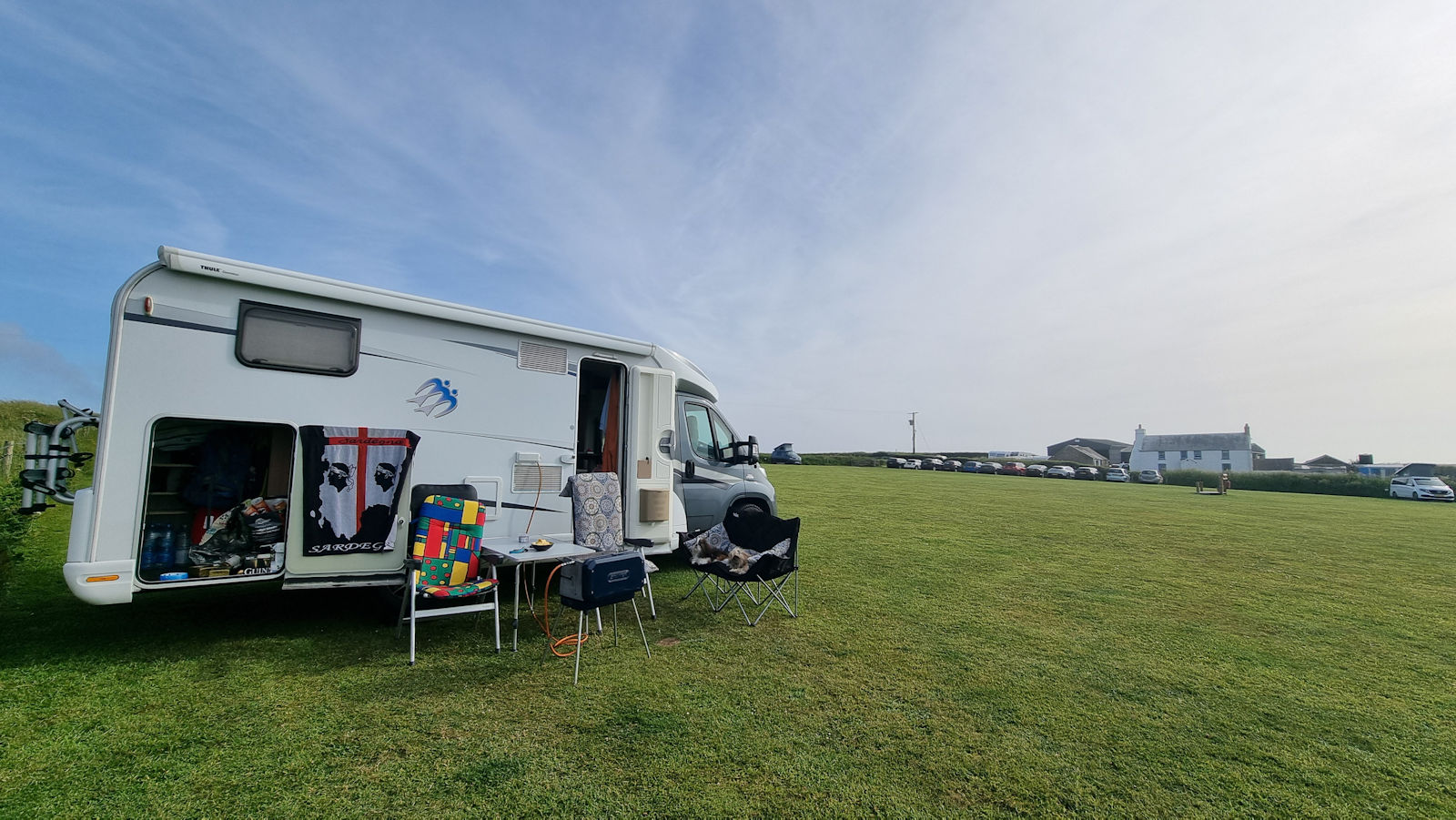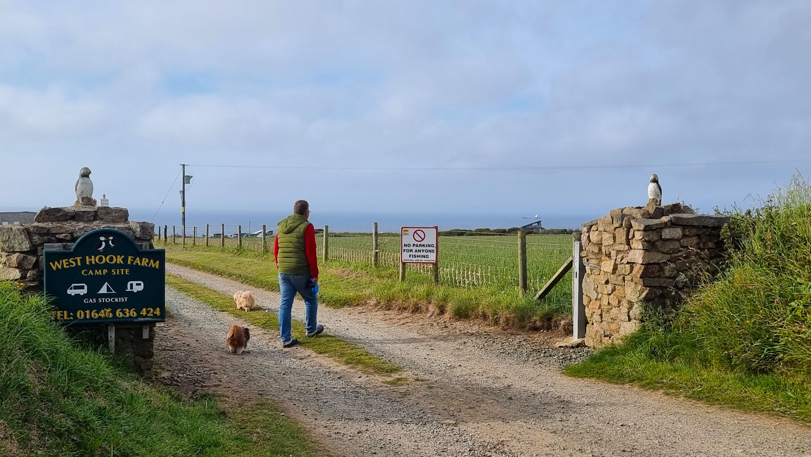 In Marloes stoppen wir bei Camping Foxdale, reservieren den letzten Platz für unsere noch bestehende Lücke vom 20. auf 21. Juni und dann geht es auch schon weiter in Richtung Westhook Farm. Um kurz nach 12 parken wir auf der Wartewiese ein und genießen ein kleines Mittagessen.