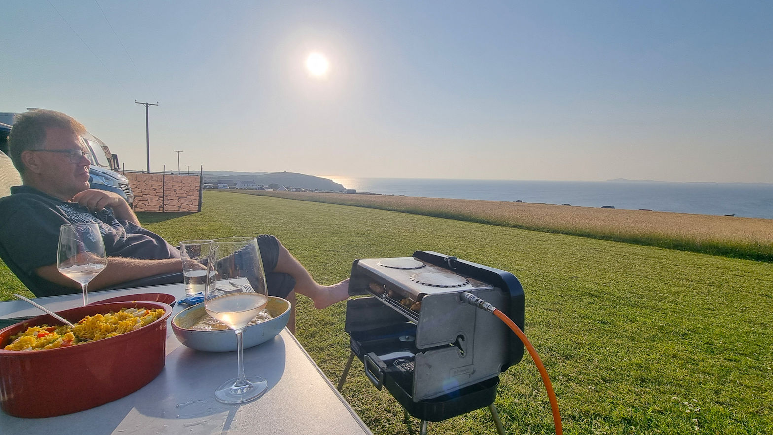 Ab etwa halb 7 sitzen wir dann bei herrlicher Sonne vorm Womo, Ralf berichtet von seinem Skokholmerlebnis und der Grill bräunt so langsam das arabisch eingelegte Hähnchenfilet.