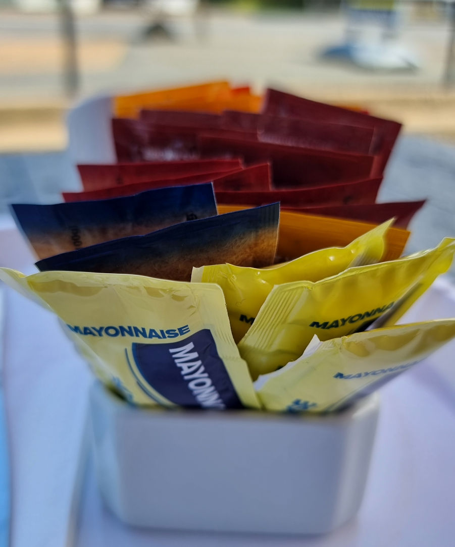 Zu unserem Mittagsburger bekommen wir eine reichhaltige Auswahl an Tütensaucen: Ketchup, Mayo…und auch Brown Sauce.