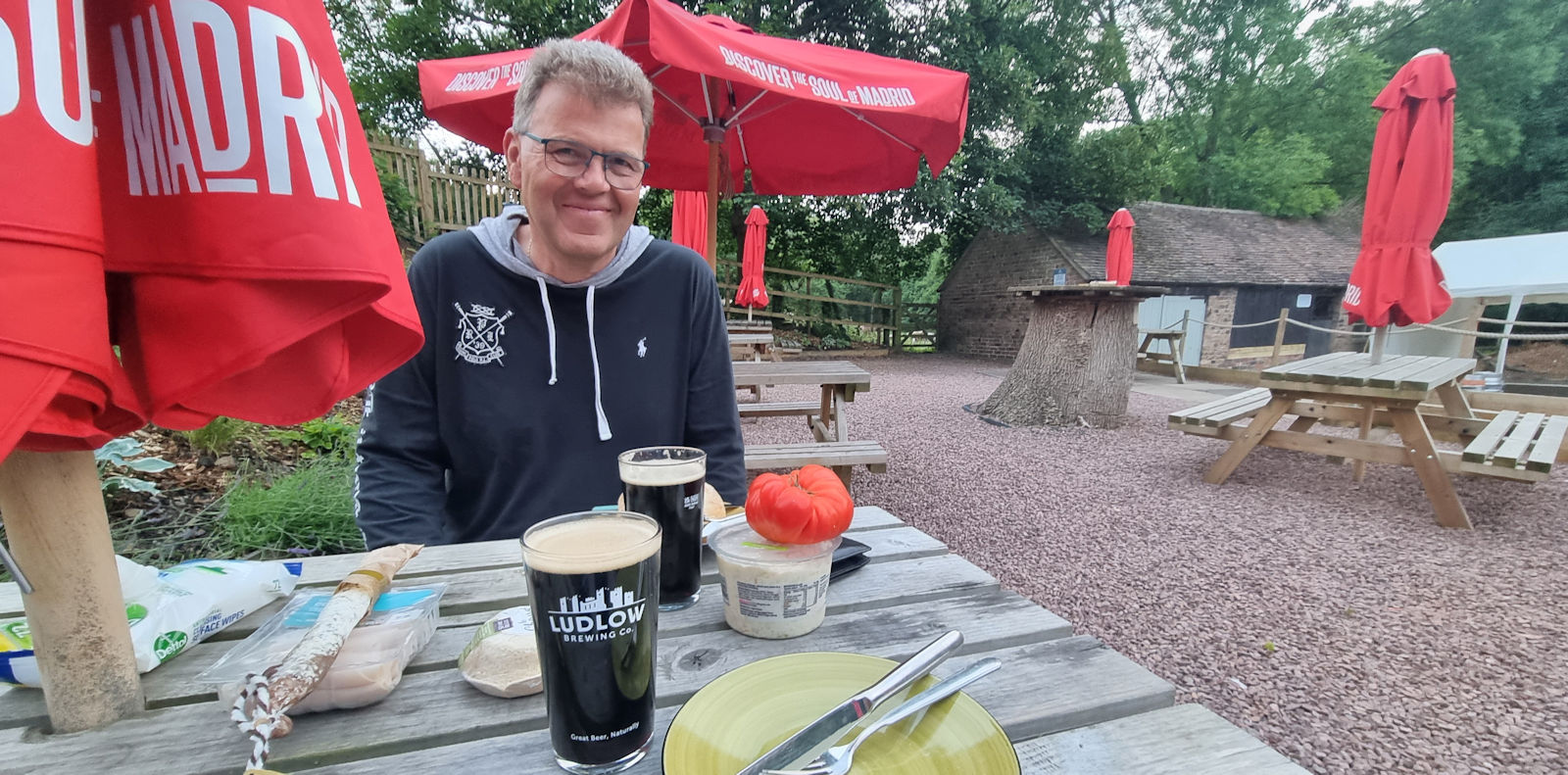Im Pub sind bereits Gäste, der Biergarten ist einladend – hier sitzt auch bereits eine Dame – und so holen wir uns ein leckeres dunkles Ale und ein Tisch im Biergarten ist unser.