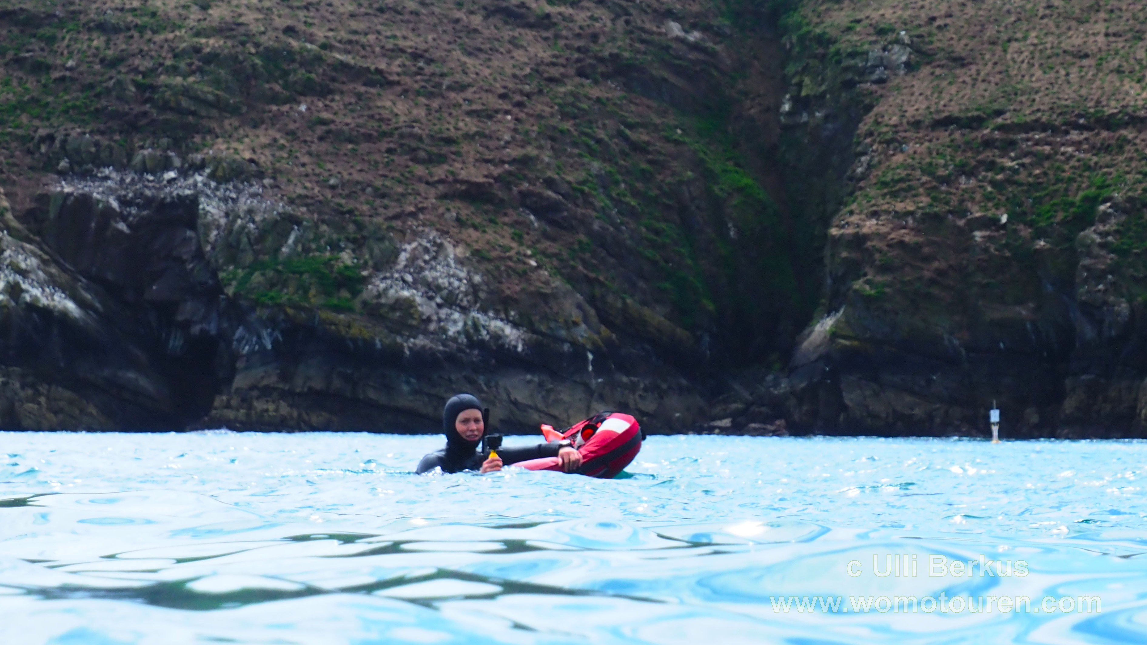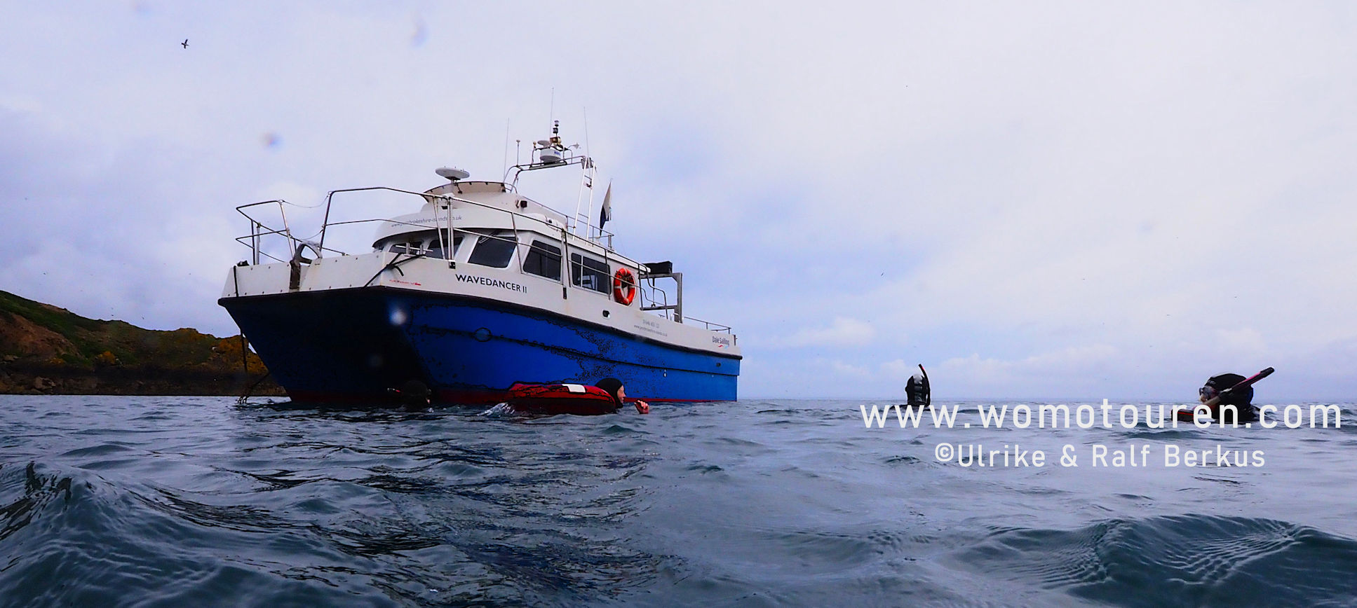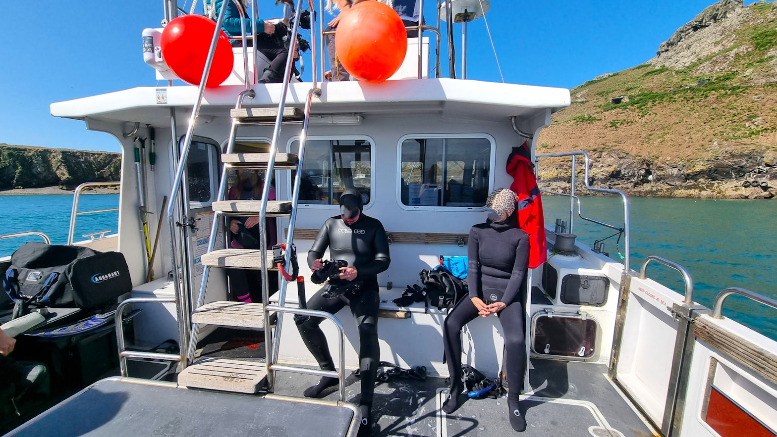 Schon beim Verlassen des Stegs schaukelt es ganz ordentlich. Aber nur 15 Minuten später nach dem Queren der richtig hohen Wellen liegen wir ruhig vor Skomer im North Harbour. Ein bisschen Interview und Briefing für’s Fernsehteam, rein in den Neopren und los geht das gut eine Stunde dauernde Abenteuer. Und was sollen wir dazu sagen….es ist einfach nur traumhaft schön.