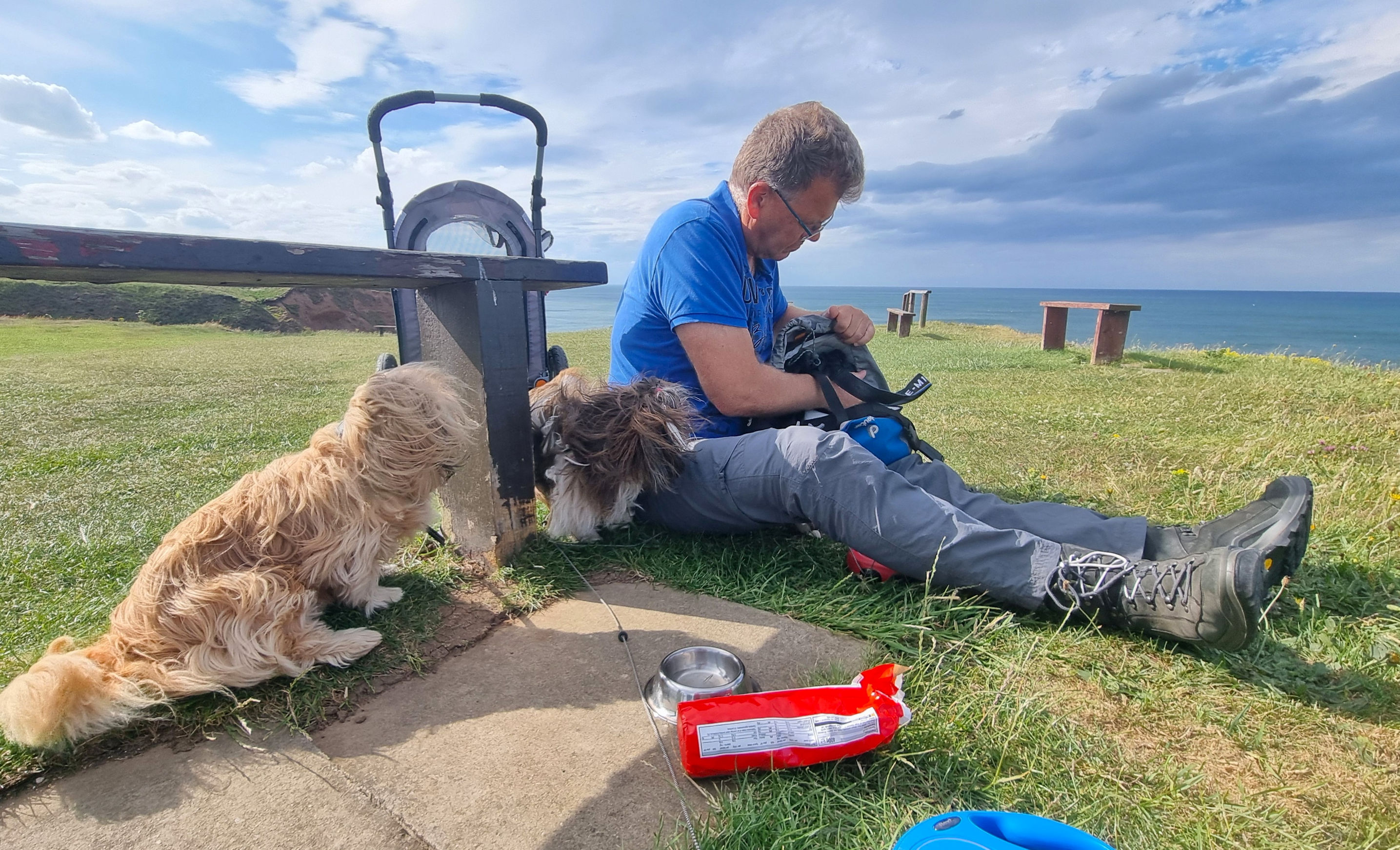 Die Farben am heutigen Nachmittag sind im Moment noch recht trist. Die Küstenlinie ist wunderschön anzusehen und die Fellnasen sind heute etwas faul. So sind wir froh, den Hundetransporter mitgenommen zu haben, auch wenn an der ein oder anderen Stelle ein Fluch über die Lippen dessen kommt, der gerade mit Schieben dran ist.