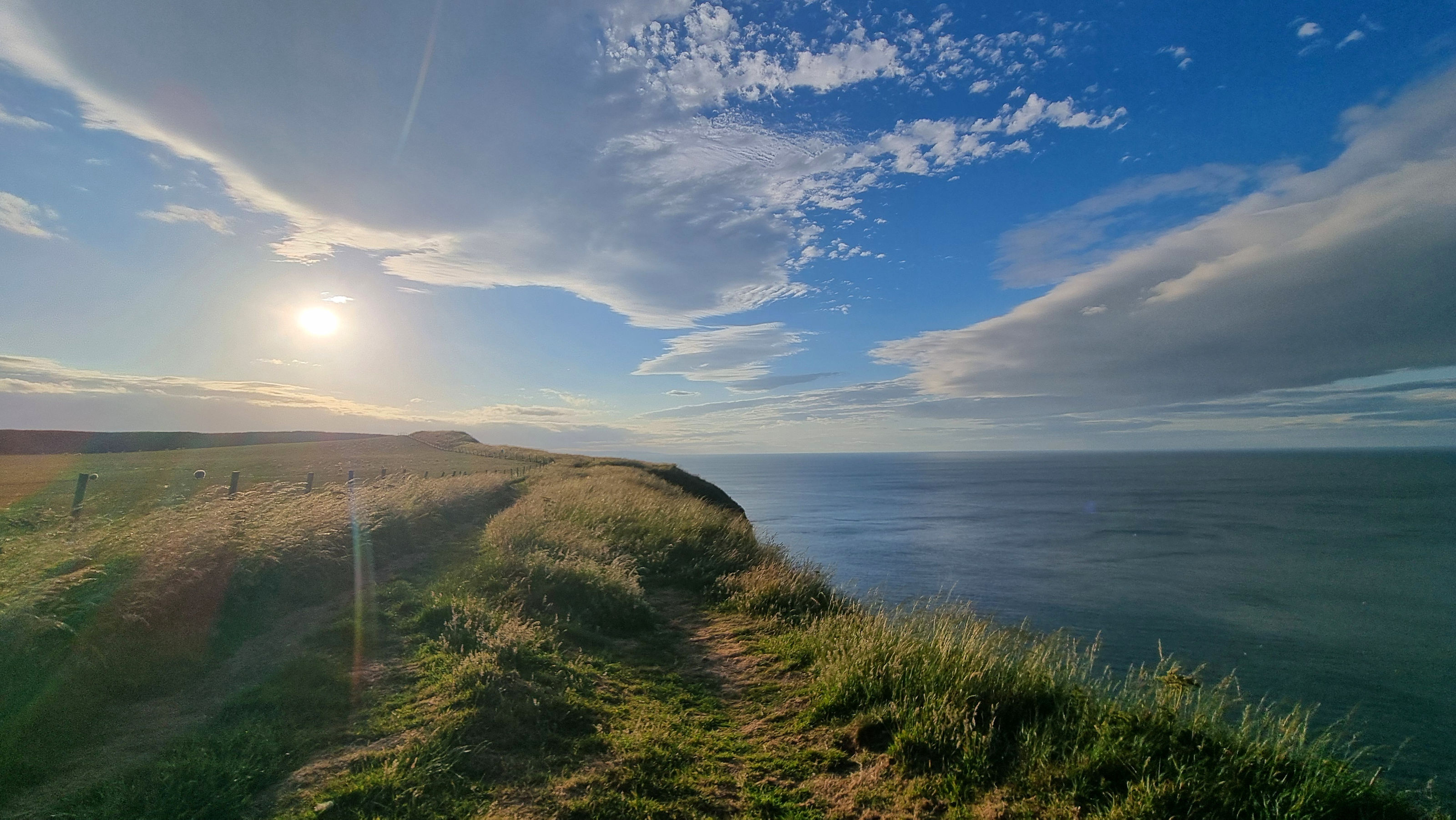 Als wir das kleine, über der Bucht liegende Cafe erreichen, sehen wir, dass es heute geschlossen hat. Ob es tatsächlich nur heute so ist oder aber dauerhaft, lässt sich nicht erkennen. Auch nicht schlimm. Bei einem mitgebrachten Keks und etwas Wasser ist die Pause auch ganz nett. Man merkt, dass die Farben immer intensiver werden und dann hat es die Sonne endlich durch die Wolken geschafft und taucht die Küstenlinie in Zauberlicht.