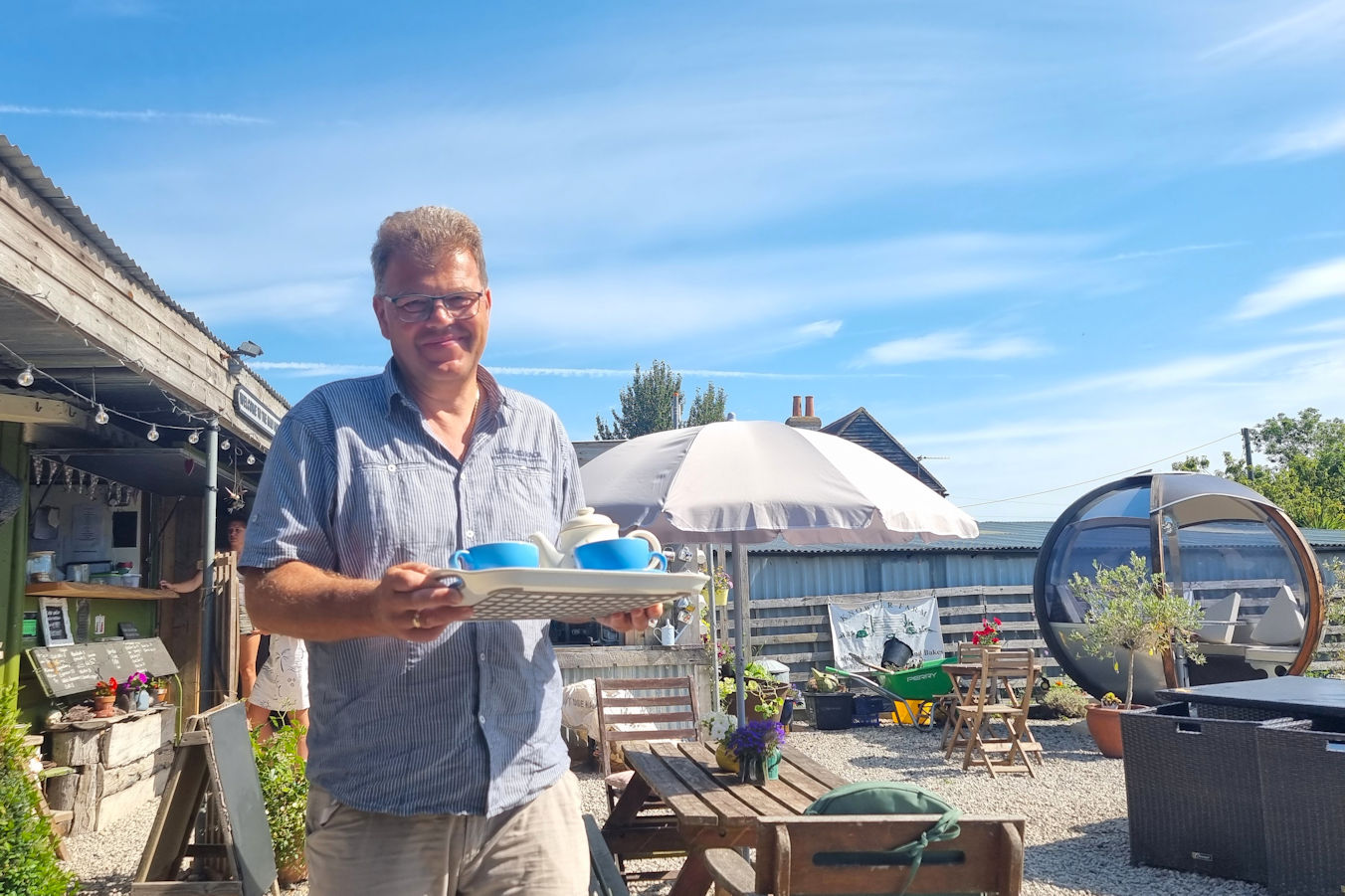 Ulli hält eine kleines Schwätzchen mit einer ältern Dame, die vor ihr an der Reihe ist und mit der Bedienung und entscheidet sich für einen Pott English Breakfast Tea und 2 Stücke Nusskuchen.