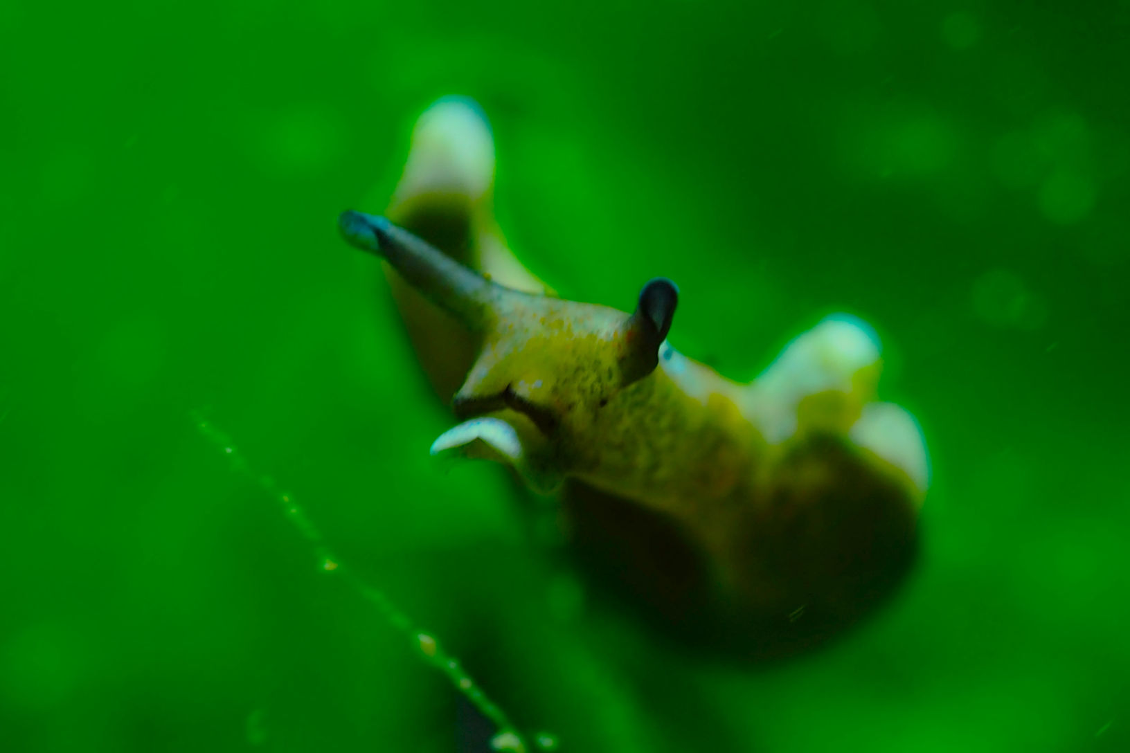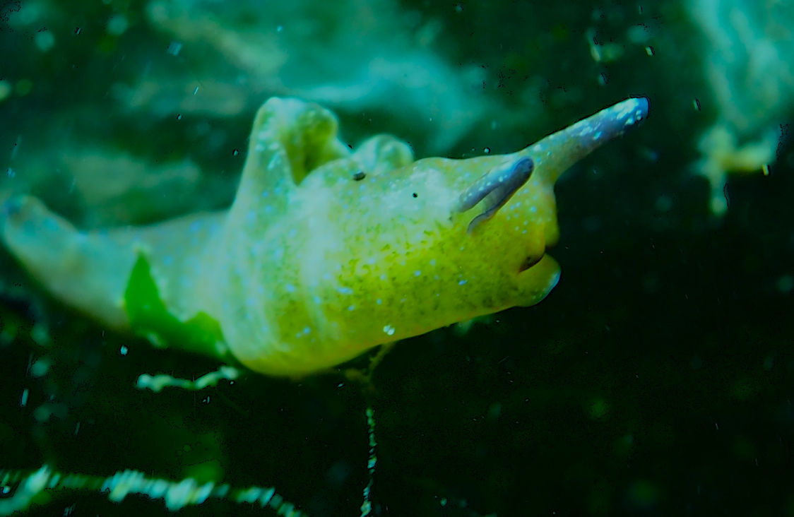 Zum Hochwasser gegen 3 geht es wieder in voller Tauchmontur die etwa 800 Meter zu Fuß zum Tauchplatz Sint Annaland Treppe. Die Sichtweite heute ist eher mäßig, die Strömung scheint nur das zu machen, was sie möchte, nicht was sie eigentlich sollte. Aber das kennen wir ja bereits von anderen Plätzen hier in Zeeland. Der Tauchgang ist in der ersten halben Stunde solala, aber dann finden wir genau das, weshalb wir hier sind: die wahrscheinlich schönste Nacktschnecke Zeelands, eine Tecacera oder zu Niederländisch „Gestibbeld Mosdierslak“. Soooo winzig, aber auch sooooo wunderschön.