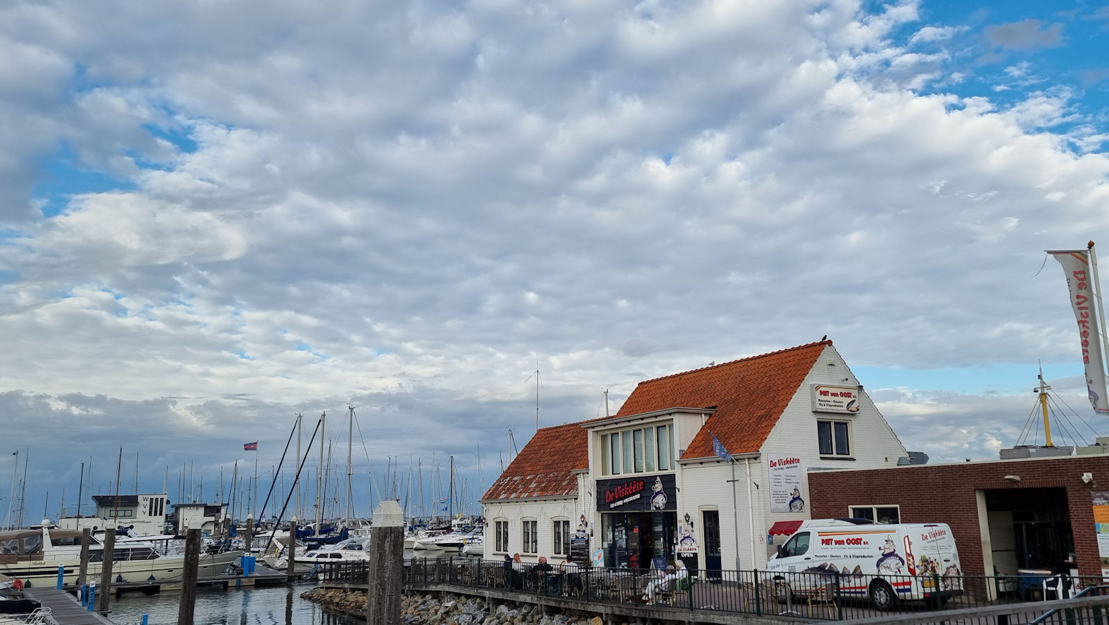 Wir haben uns fast schon für Linda entschieden, buchen aber noch nicht online, da ja morgen auch noch Zeit dafür sein wird. Erst einmal fahren wir nach Yerseke, parken ganz nah an unserem Lieblingslokal, als die Sonnen so ein wenig an den dunklen Wolken vorbei blinzelt. Wir erstehen einen Weißwein und 2 Portionen Seelenkibbeling (auf der Kibbeling-Skala eine glatte 10) und genießen es, wieder hier zu sein.