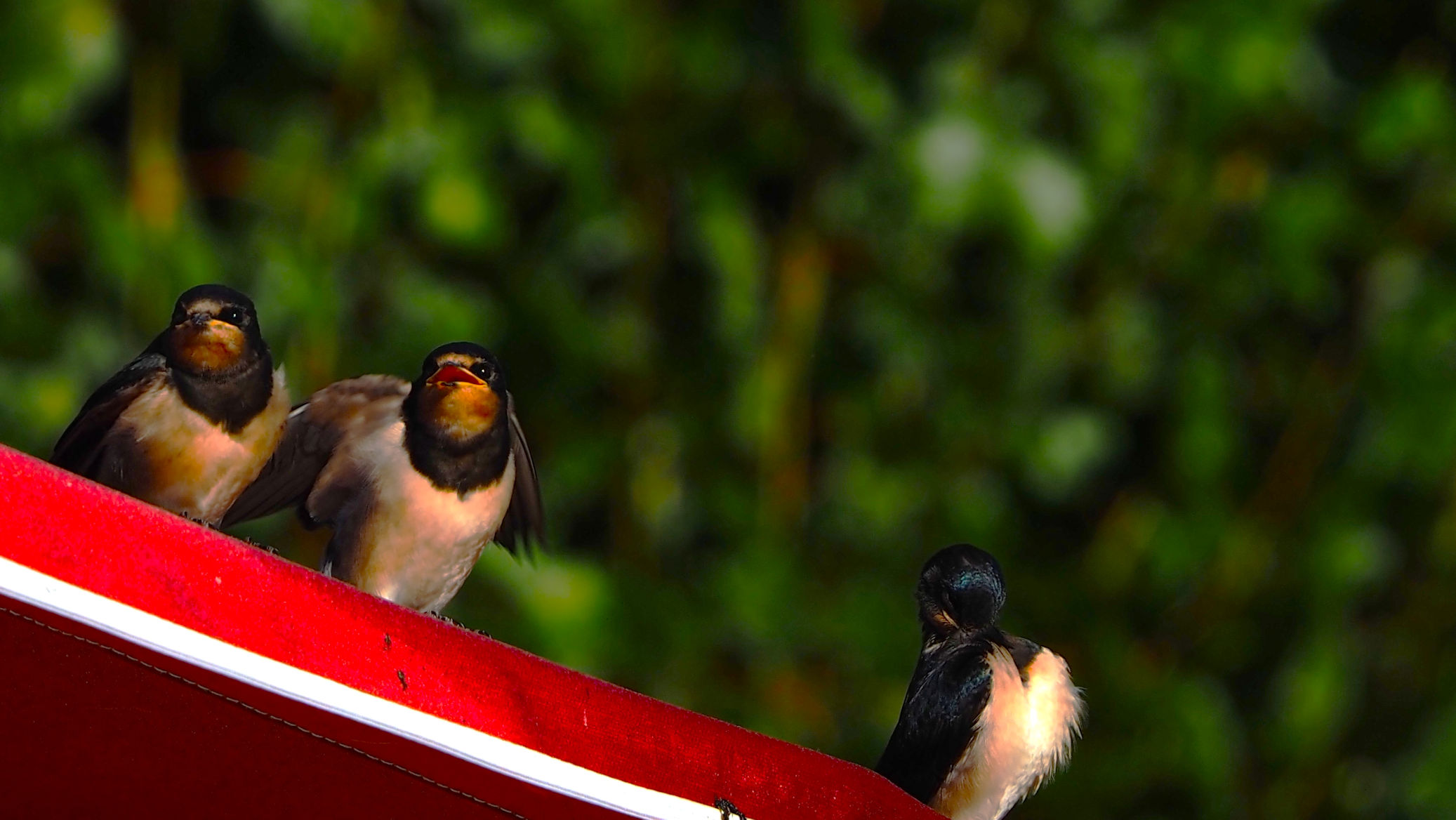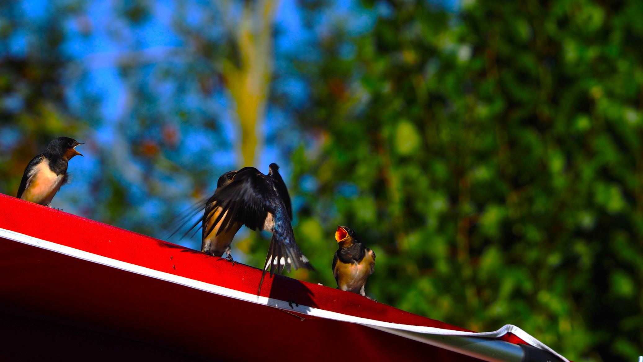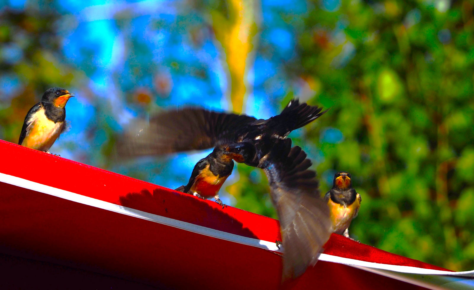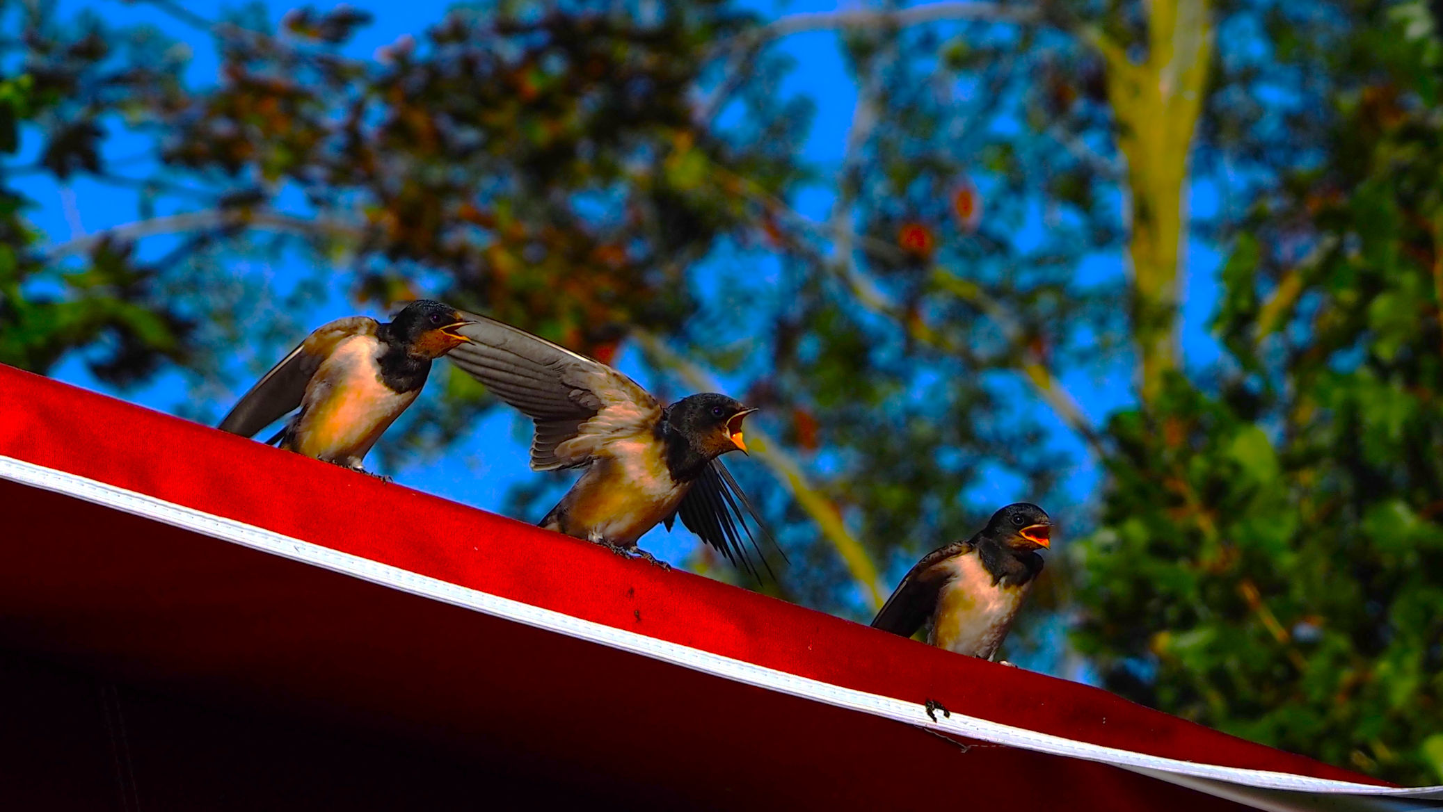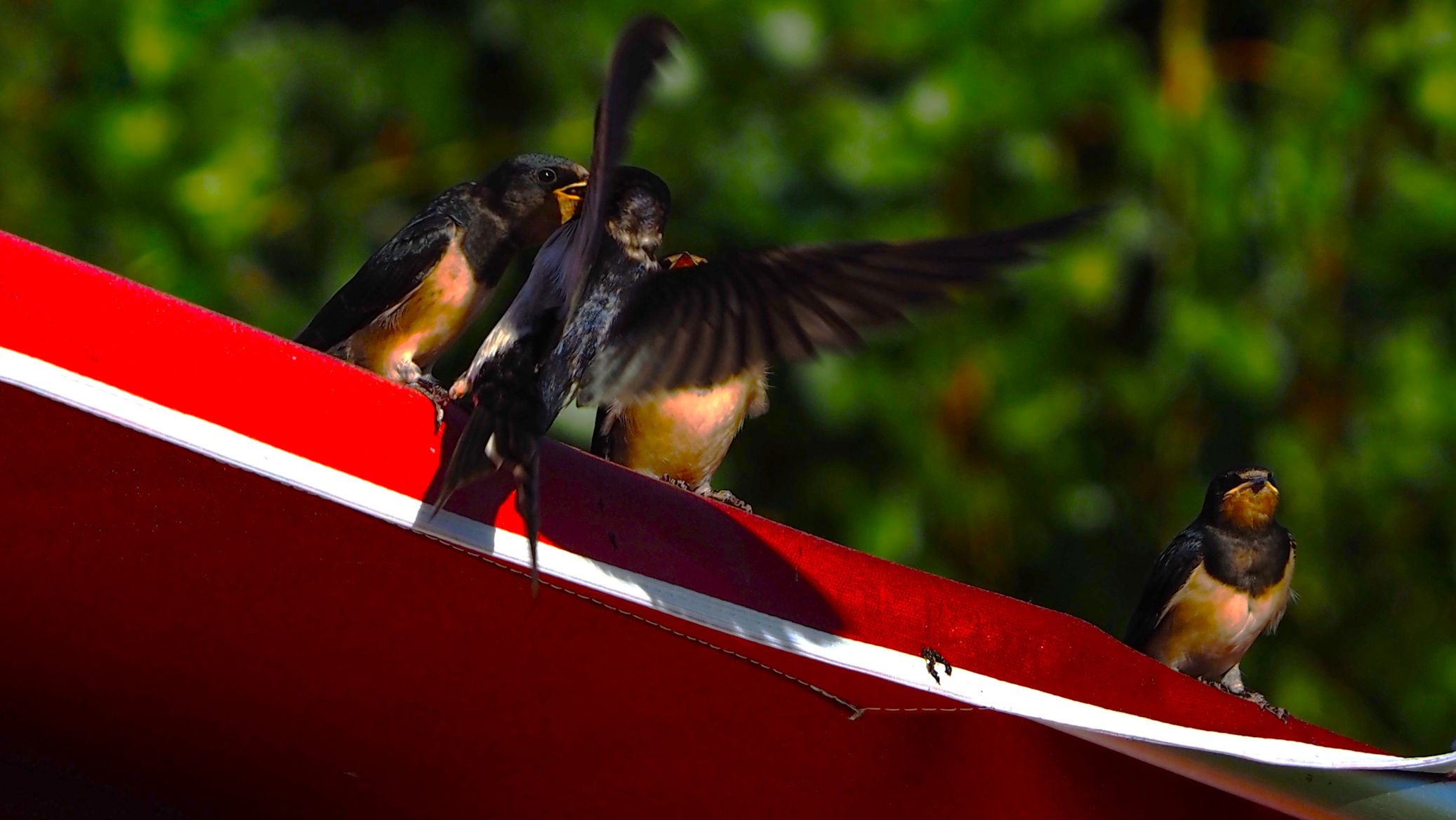 Es war so wunderbar ruhig letzte Nacht, so dass wir ungefähr 12 Stunden geschlafen haben. Der Himmel am heutigen Morgen ist wunderbar blau und es ist so warm vorm Womo, dass wir uns einfach mal in die Sonne setzen. Unterhalten werden wir hierbei von 3 jungen Schwalben, die auf dem Nachbarvorzelt sitzen und sich von ihren Eltern füttern lassen.