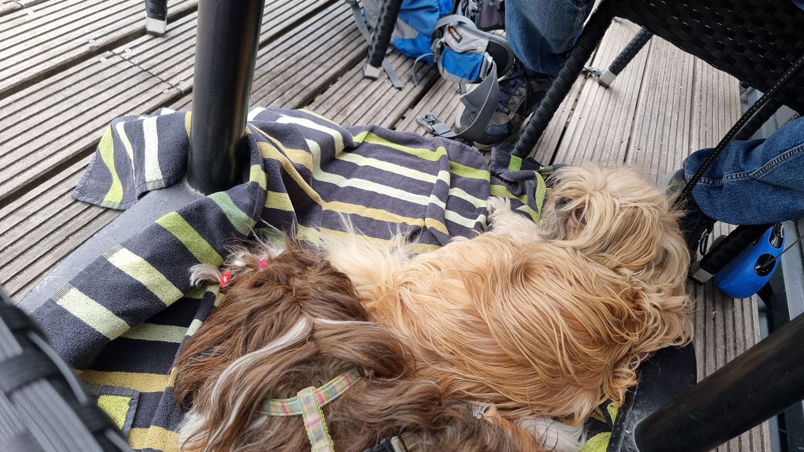 Wir parken neben dem Restaurant Oliegeultje und laufen etwas auf den kleinen Damm hinaus. Unsere Fellnasen genießen die Strecke, die sie nur mit einem Turmfalken, einem Seehund und ein paar Seevögeln teilen müssen.