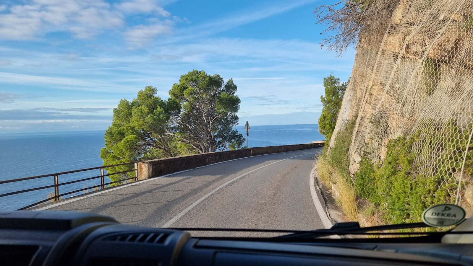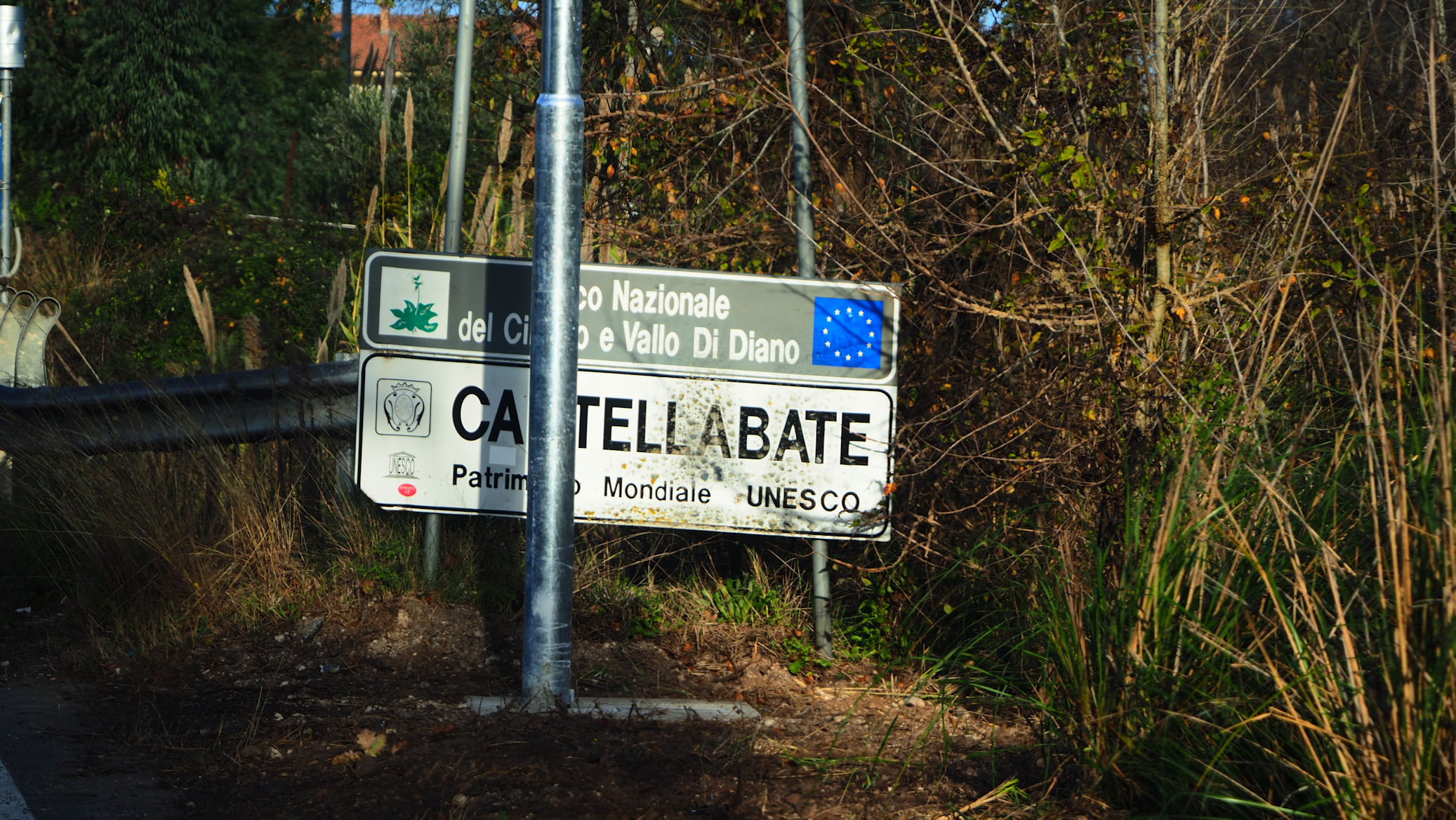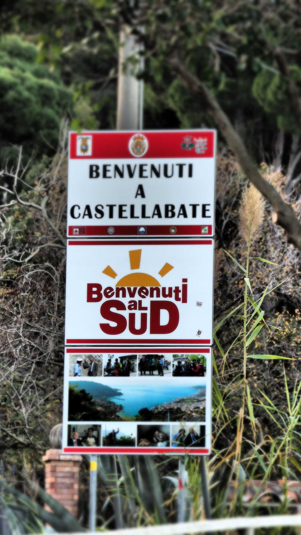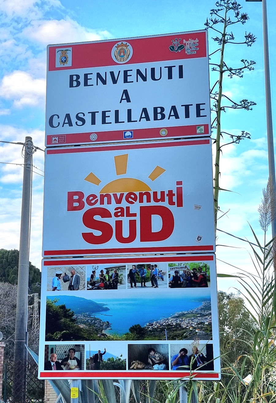 Schon beim ersten Blick aus dem Fenster zeigt sich der Himmel in seiner schönsten Farbe: Blau. Und so sitzen wir nur kurze Zeit später im Womo und sind auf dem Weg ins nahe gelegene Santa Maria di Castellabate, wo es einen freien Parkplatz für Wohnmobile geben soll. Natürlich nicht ohne vorher das Schild des Kinoerfolgs „Benvenuti al Sud“ einer eins zu eins Kopie von „Willkommen bei den Schti`s“ zu fotografieren.