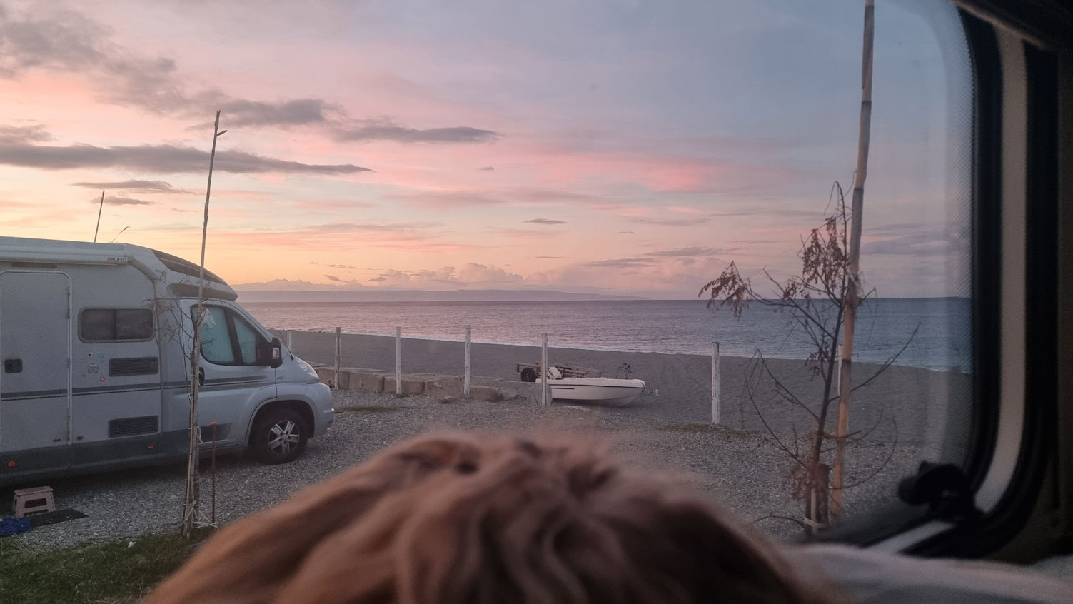 Dann lieber doch wieder zurück zu dem Platz, von dem wir heute morgen weggefahren sind. Der hat offen, man steht am Meer und es gibt eine Bar. Und so parken wir um kurz vor 4 dort wieder ein. Die Sonne lächelt leicht durch die dicken Wolken und die Farben am Himmel sind traumhaft schön. Im Abendlicht gehen wir mit den Fellnasen am Strand entlang und beschließen den Abend mit einem Barbesuch, gefolgt von einer Lieferung von 2 Pizzen einer Pizzeria um die Ecke.