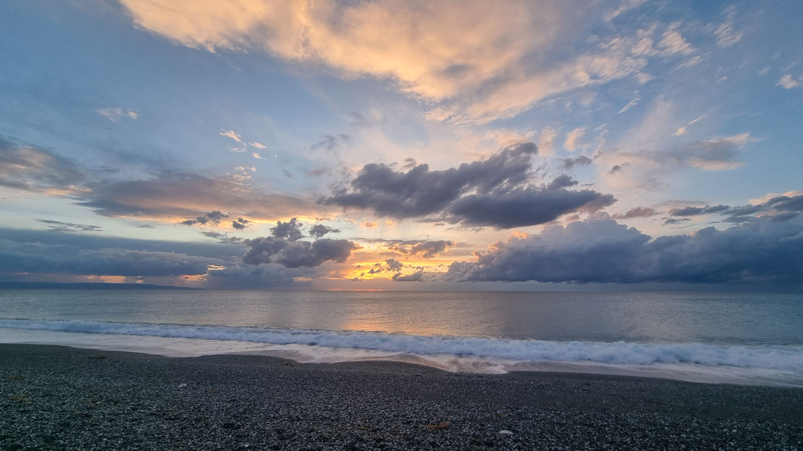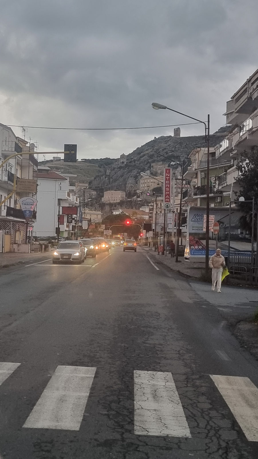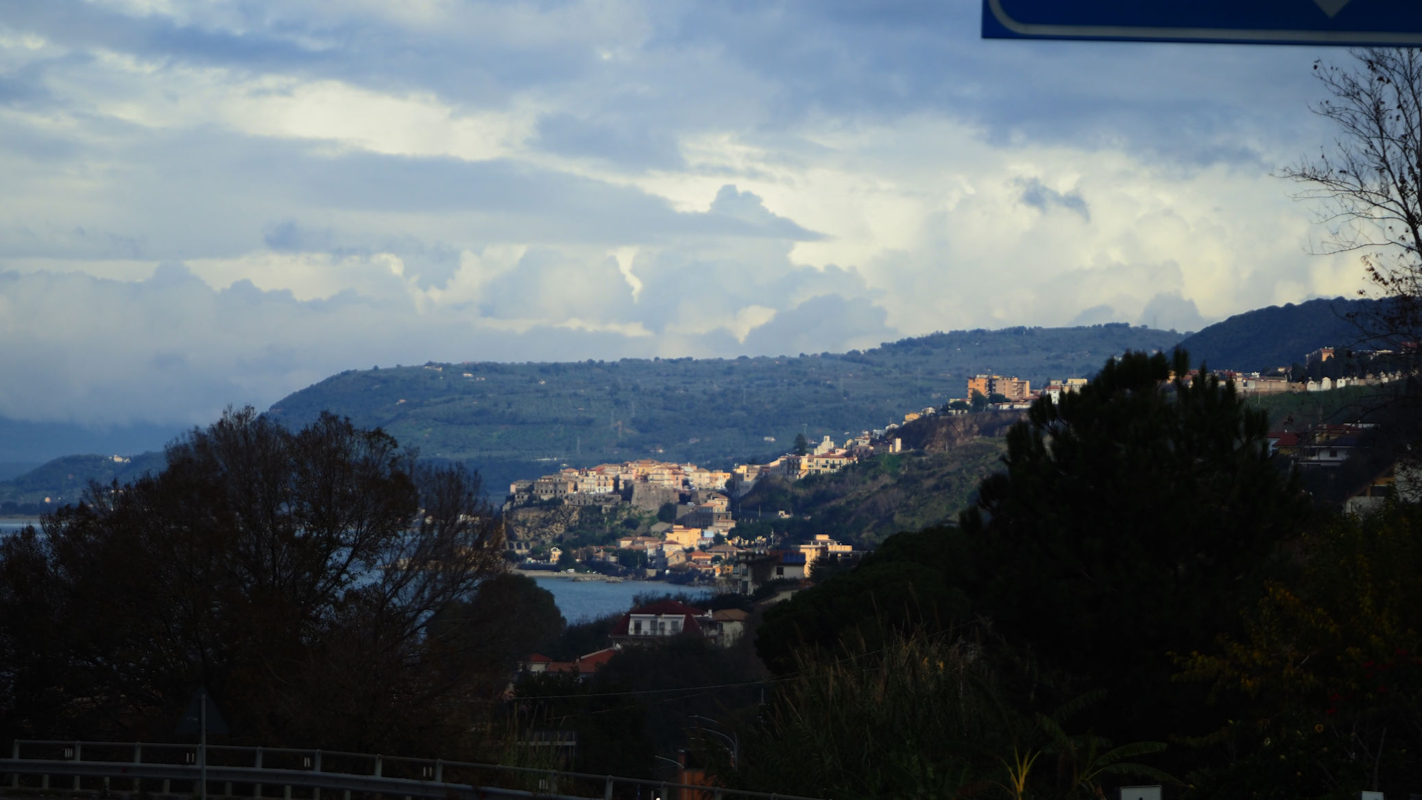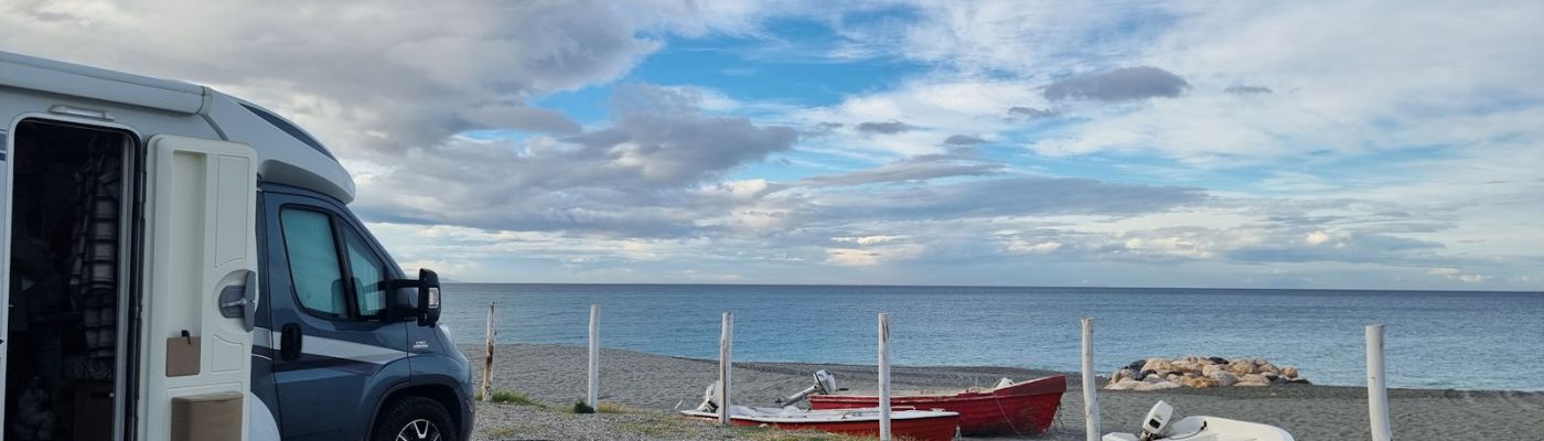 Und so sind wir gegen halb 2 wieder unterwegs in Richtung Küste, von der wir gekommen sind, denn in Richtung Sizilien ist heute den ganzen Tag Regen gemeldet. Wir fahren parallel zum Meer und die großen, schwarzen Wolken scheinen neben uns herzuziehen.