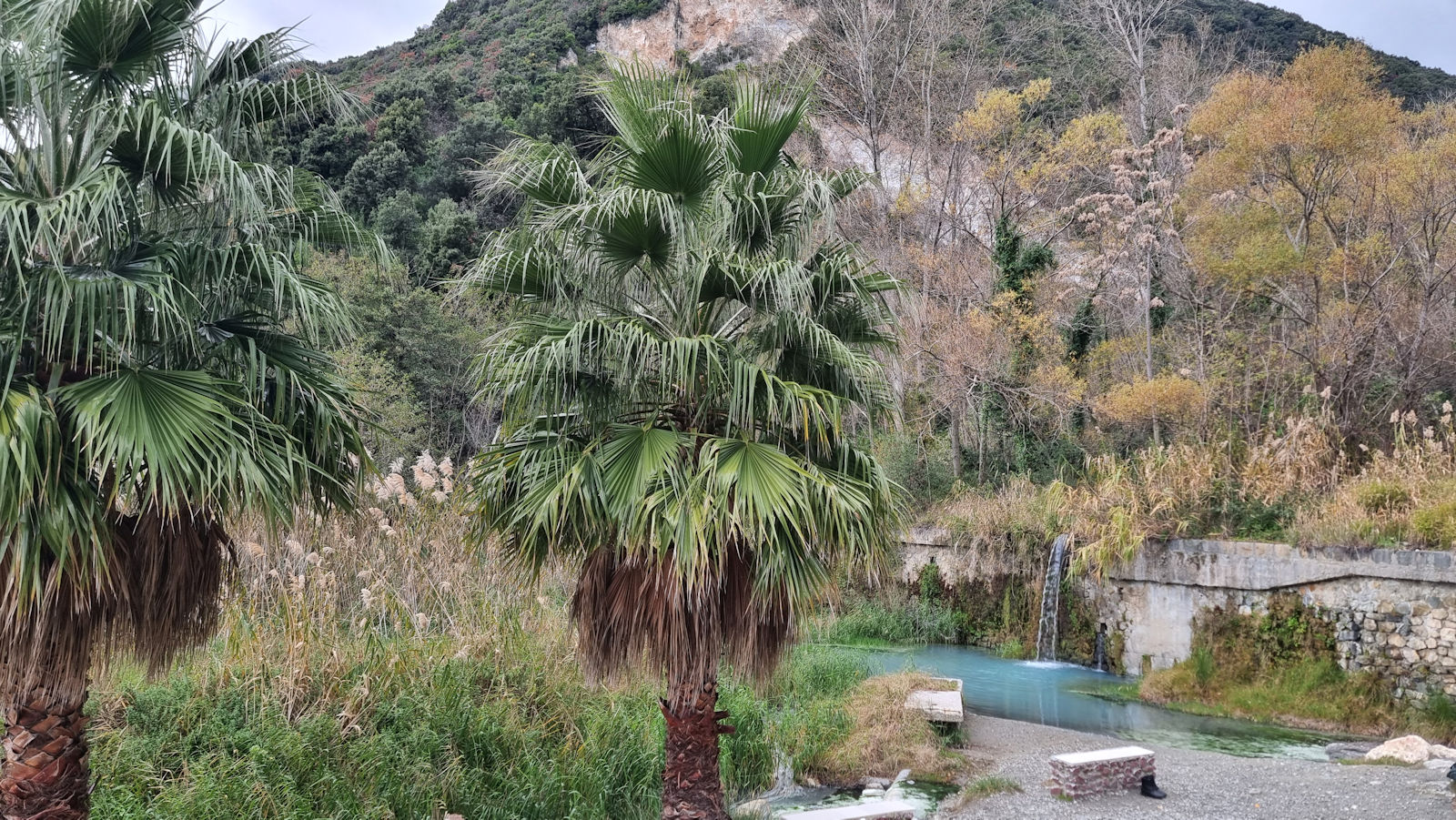 Wir verlassen den Stellplatz kurz danach mit dem Ziel Thermalbecken in Caronte. Der Parkplatz dort ist voll. Leider auch mit Mobilen, die garantiert keine Toilette an Bord haben und wo man sich beim Hundegassi um die Ecke dieser Fahrzeuge immer die Frage stellt: war das wirklich ein Hund?