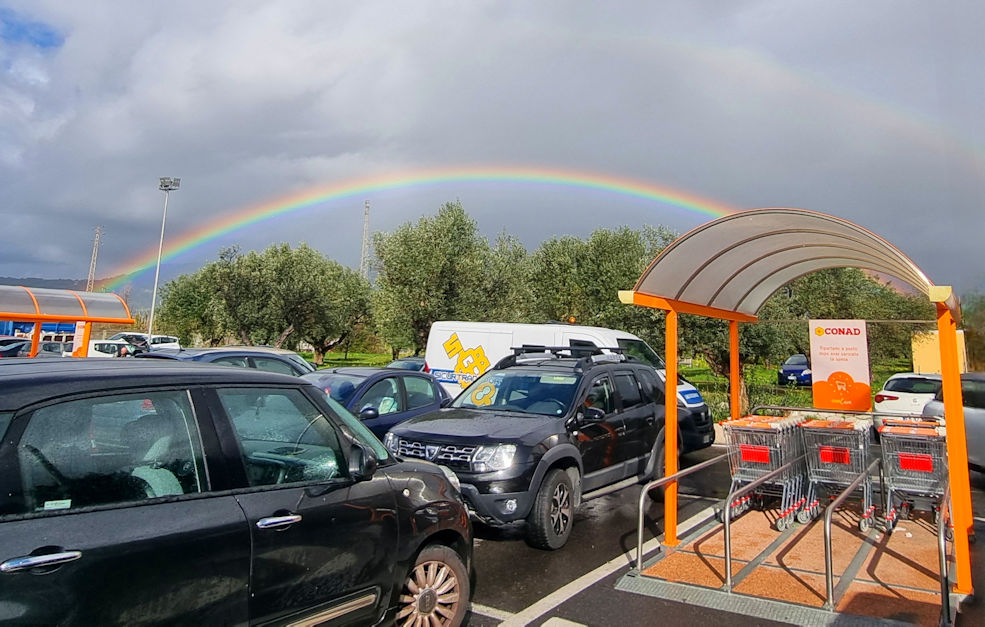 Es ist für uns so abstoßend, dass wir umgehend weiter in Richtung Tropea fahren. Vorher noch ein kurzer Stop in einem Conad und hier öffnet der Himmel am heutigen Tag zum ersten Mal seine Schleusen. Was aber folgt ist ein wundervoller Regenbogen.