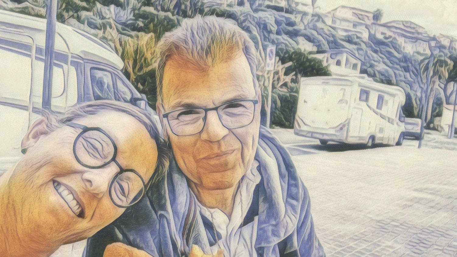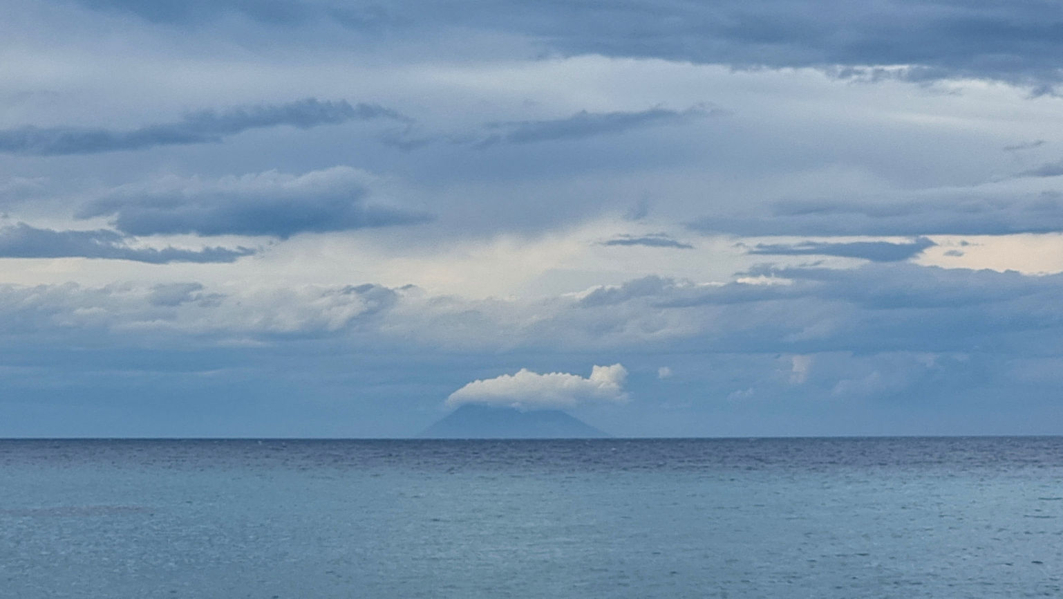 Aber heute morgen geht es der Dame wieder gut und so sitzen wir gegen halb 9 in der kleinen Bar am Stellplatz und genießen Cappuccino und Cornetto. Vor uns im Meer ist der Stromboli zu sehen.
