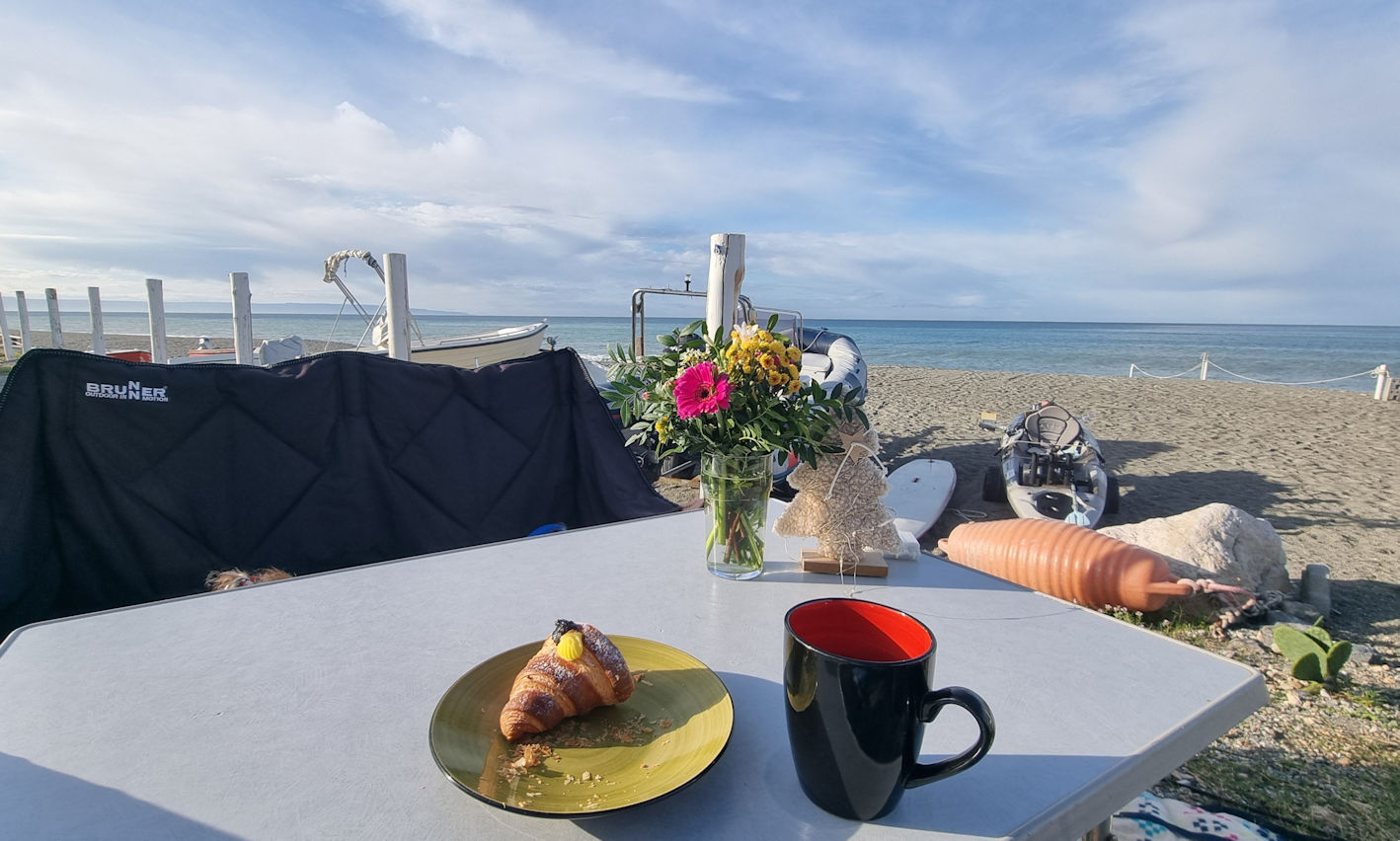 Jetzt gegen halb 9 hat es schon ca. 17 Grad, perfekt also für ein Frühstück vorm Womo. Es gibt duftenden Bialetti und Cormetti aus der Bar. Man hält ein Weihnachtsschwätzchen hier, winkt frohe Weihnachten zu weiterentfernt parkenden Nachbarn und genießt einfach diesen wundervollen Morgen.