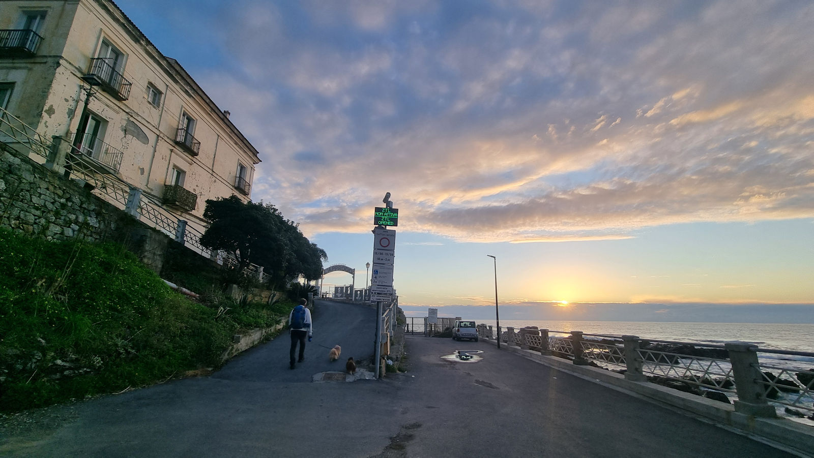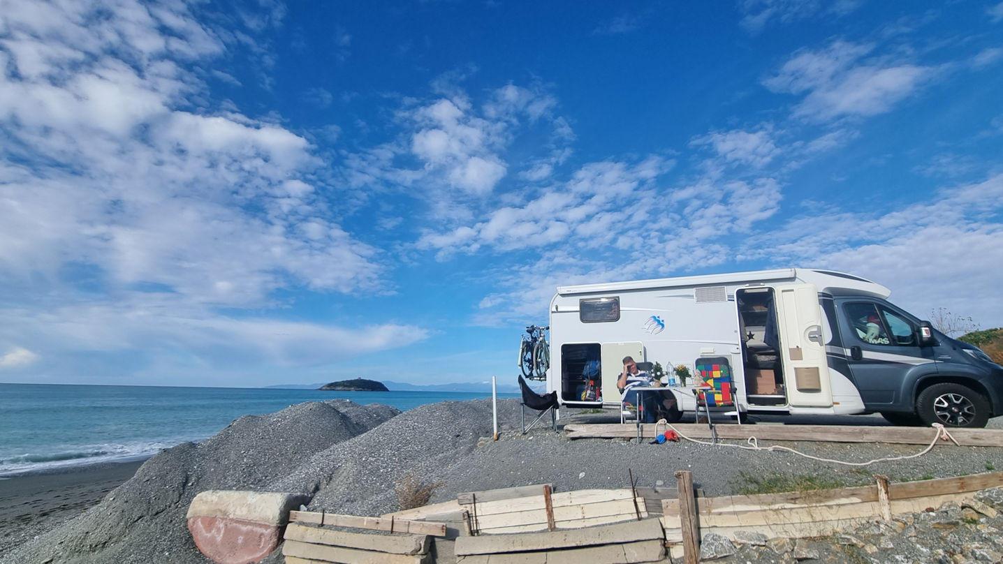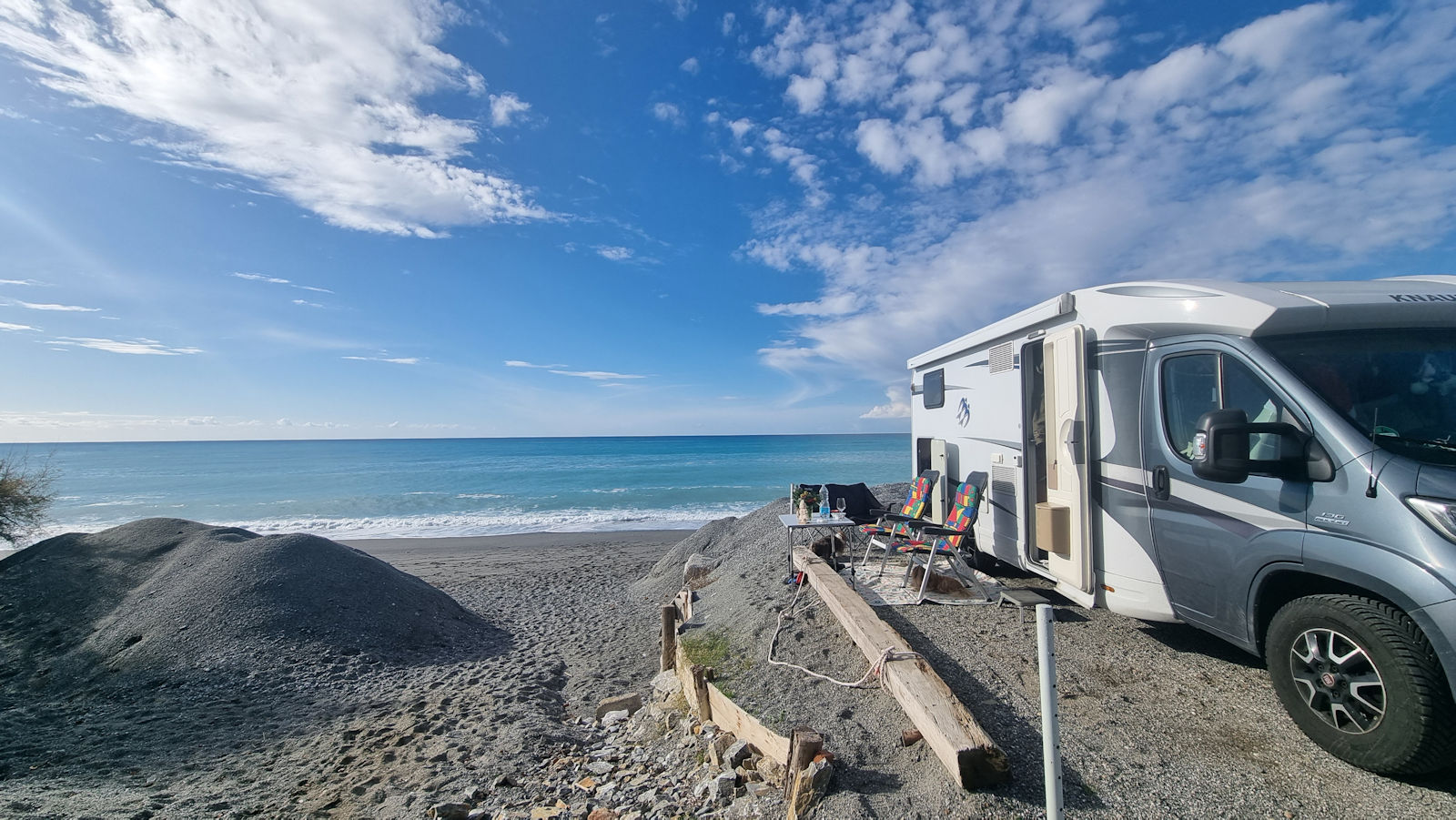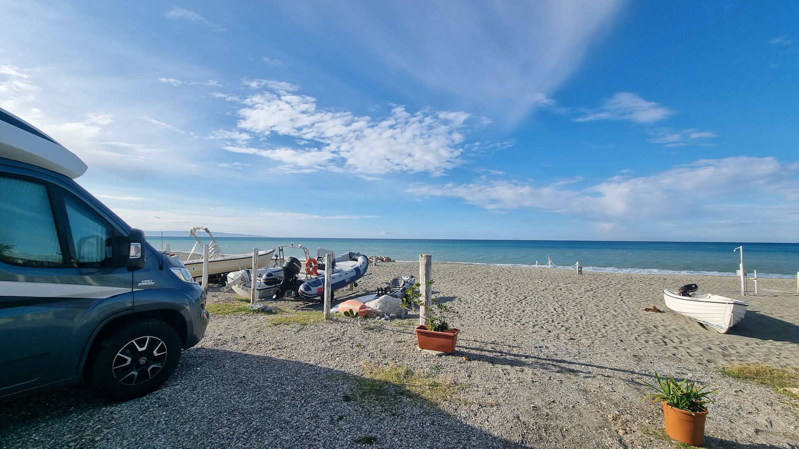 Die Küste hier ist unerwartet schön und wir haben versucht, sie für Euch ein wenig im Bild festzuhalten. Nach etwa 1,5 Stunden Fahrt biegen wir direkt vor einem italienischen Wohnmobil auf den kleinen Stellplatz am Meer ab. Hier parken lediglich ein deutscher Campingbus und ein italienisches Womo. Die Deutschen grüßen nicht, aber das hatten wir ja bereits vor ein paar Tagen, die Italiener hingegen wünschen Auguri, buon Natale.