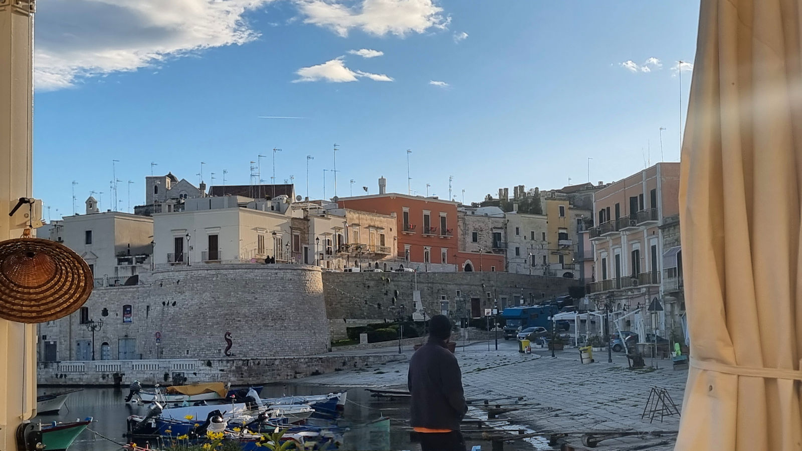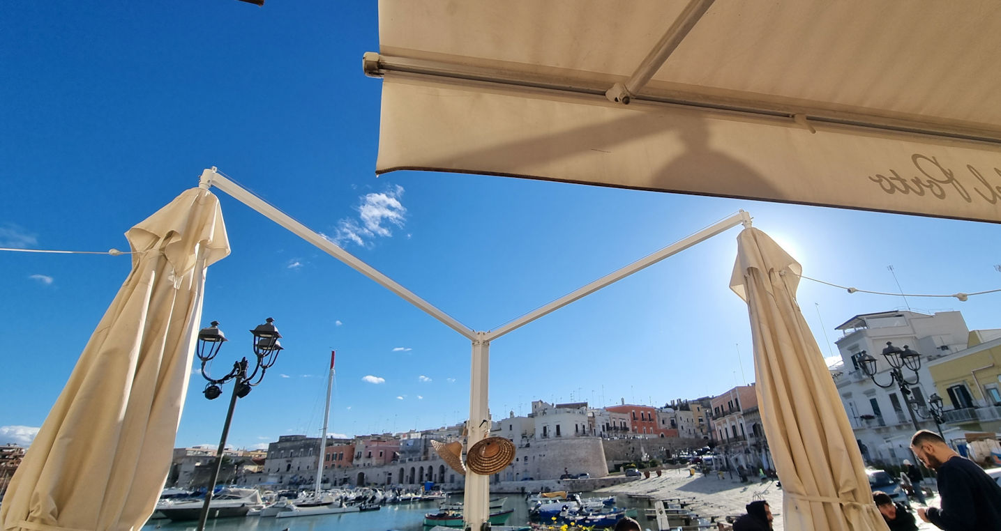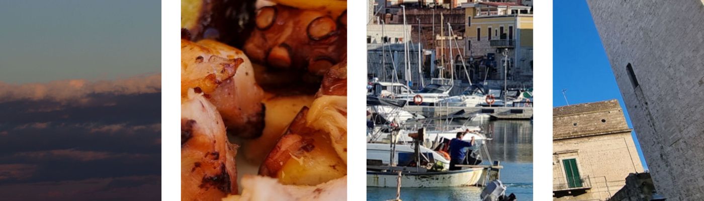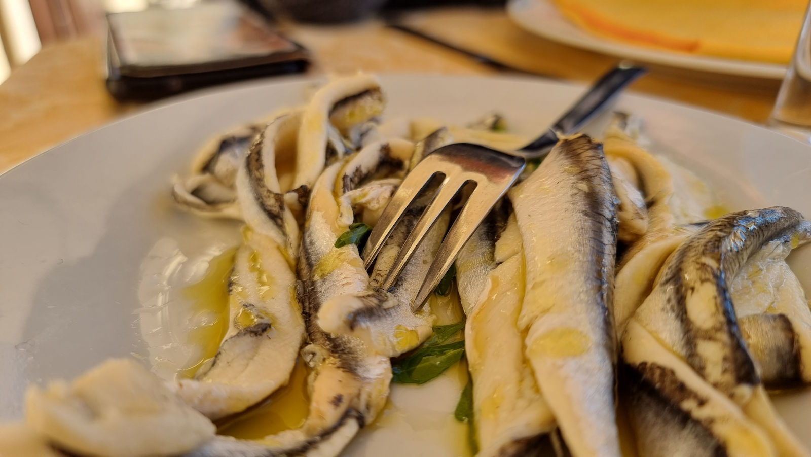 Als wir dann aber am Hafen um die Ecke biegen, sind wir plötzlich in einer anderen Welt. Hier gibt es Bars und Restaurants, zauberhafte, kleine Fischerboote liegen in der Bucht und über der Festungsmauer liegt eine schöne, alte Stadt. Eine Trattoria liegt in der Sonne. Die ältere Dame ist sehr nett und schnell hat sie einen Tisch für uns gedeckt. Es folgt ein Schälchen Wasser für die Fellnasen und dann geht unsere Bestellung auf den Weg. Alici sollen es sein und Oktopus mit Kartoffeln, danach Spaghettone mit Meeresfrüchten und Paccheri mit Krebsfleisch.