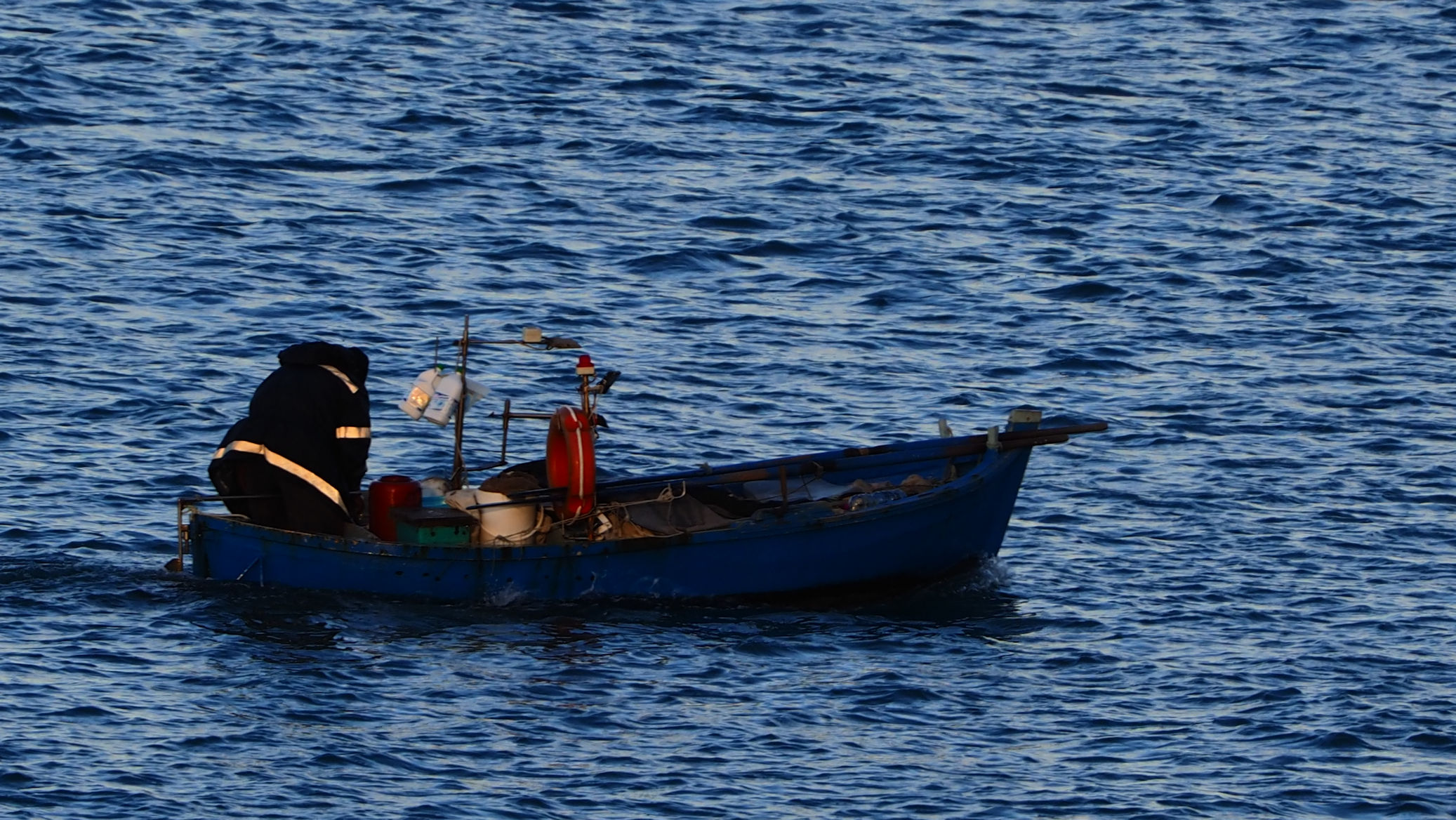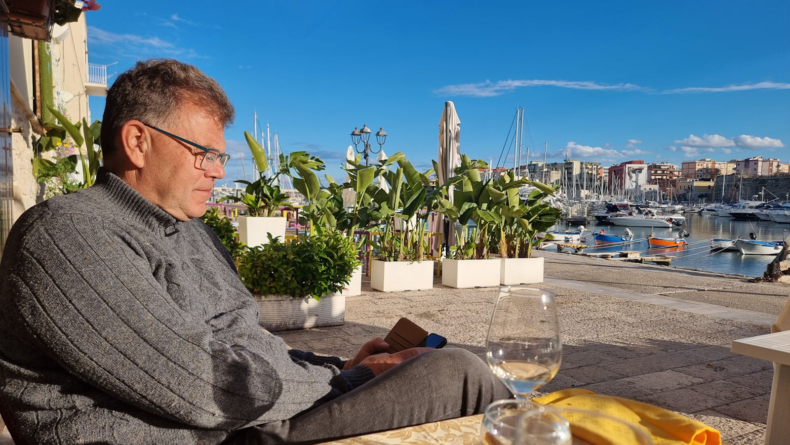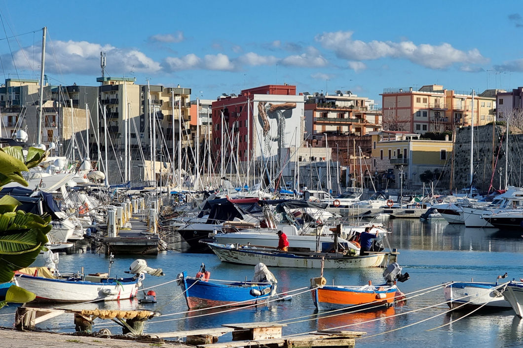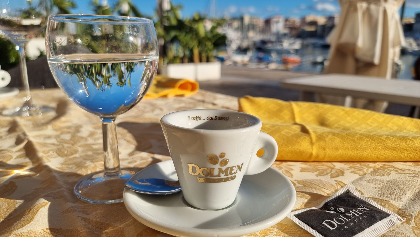 Als wir dann aber am Hafen um die Ecke biegen, sind wir plötzlich in einer anderen Welt. Hier gibt es Bars und Restaurants, zauberhafte, kleine Fischerboote liegen in der Bucht und über der Festungsmauer liegt eine schöne, alte Stadt. Eine Trattoria liegt in der Sonne. Die ältere Dame ist sehr nett und schnell hat sie einen Tisch für uns gedeckt. Es folgt ein Schälchen Wasser für die Fellnasen und dann geht unsere Bestellung auf den Weg. Alici sollen es sein und Oktopus mit Kartoffeln, danach Spaghettone mit Meeresfrüchten und Paccheri mit Krebsfleisch.