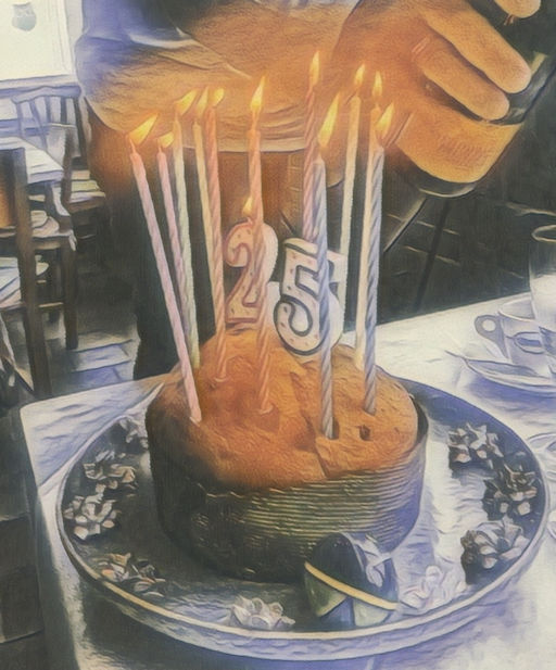 Ein Schokopanettone dient als Träger für die „25“ in Kerzenform und ein paar höheren Kerzen, präsentiert auf einem schönen Keramikteller mit silberfarbenen Schleifchen. Wir überreichen den beiden ihr kleipnes Präsent zu Klängen von Hotel California, einem der Lieder der beiden. Ob da ein Tränchen in Robertos Auge blinkt, wir wissen es nicht, aber die beiden sind doch sehr gerührt und freuen sich sehr. Und wir uns auch…