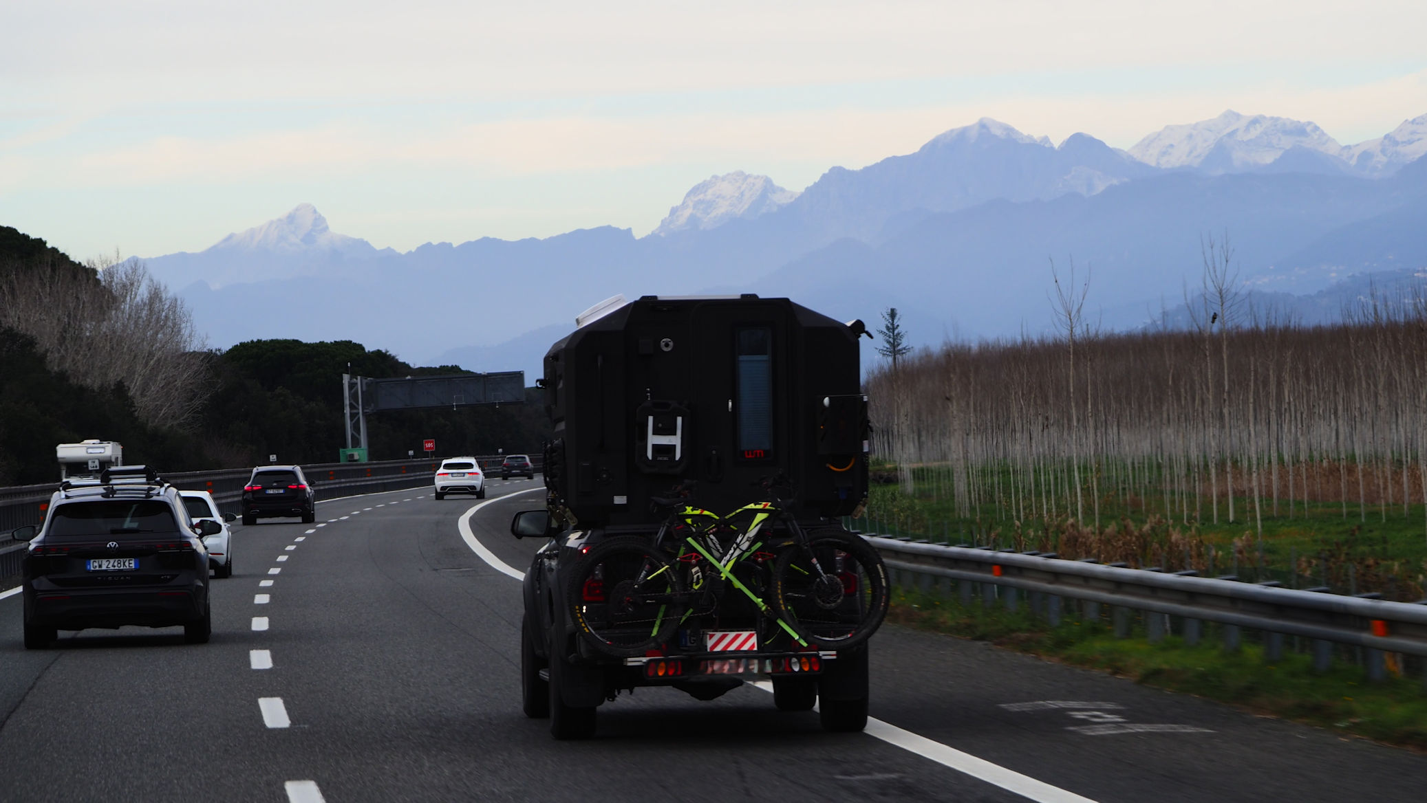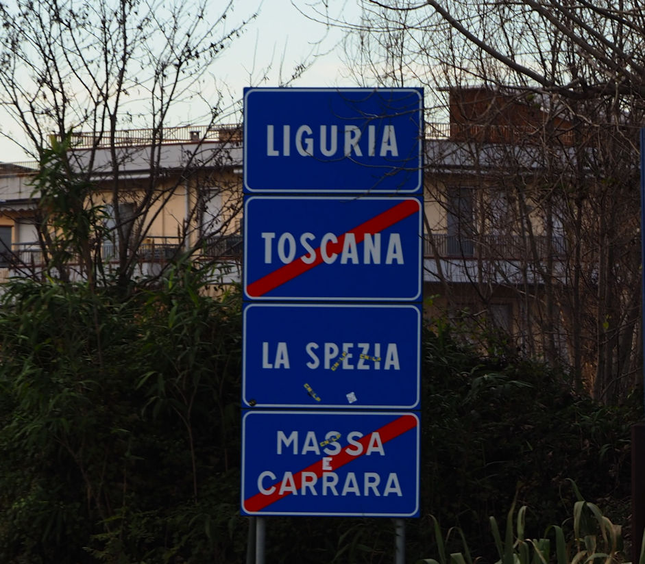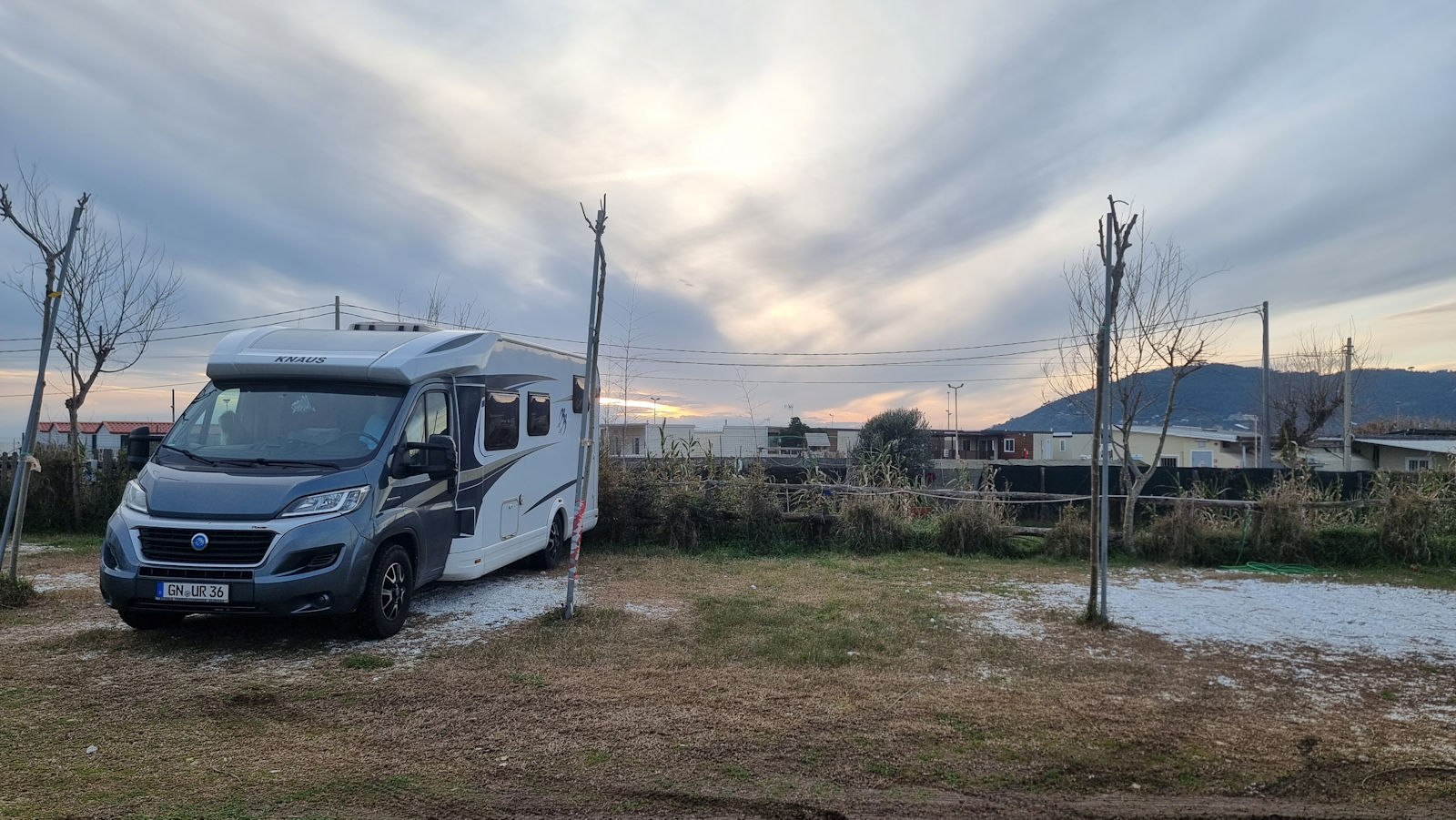 Und weiter geht es in Richtung Sonne. An den schneebedeckten Carrarabergen ist es dann soweit. Hier hat es blauen Himmel und auch etwas Ähnliches wie Sonnenuntergang. Und so parken wir wenig später auf einem Wohnmobilstellplatz am Ende des Marina di Carrara Strandes ein.