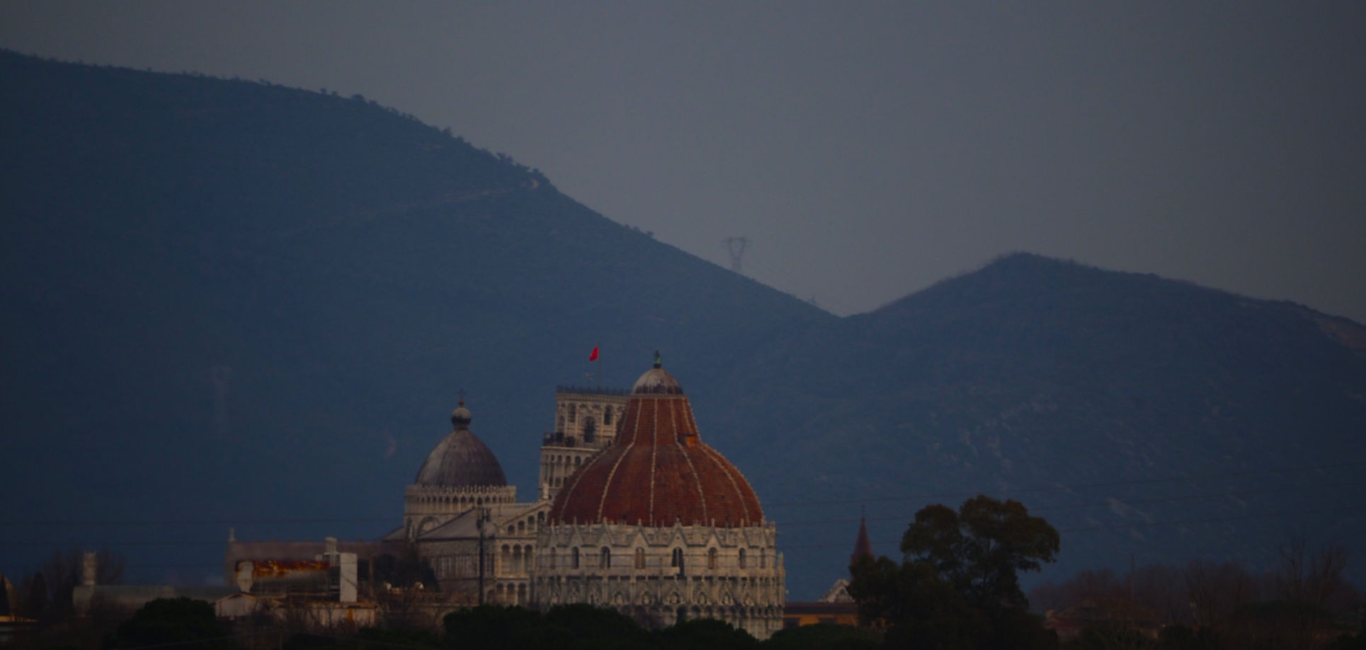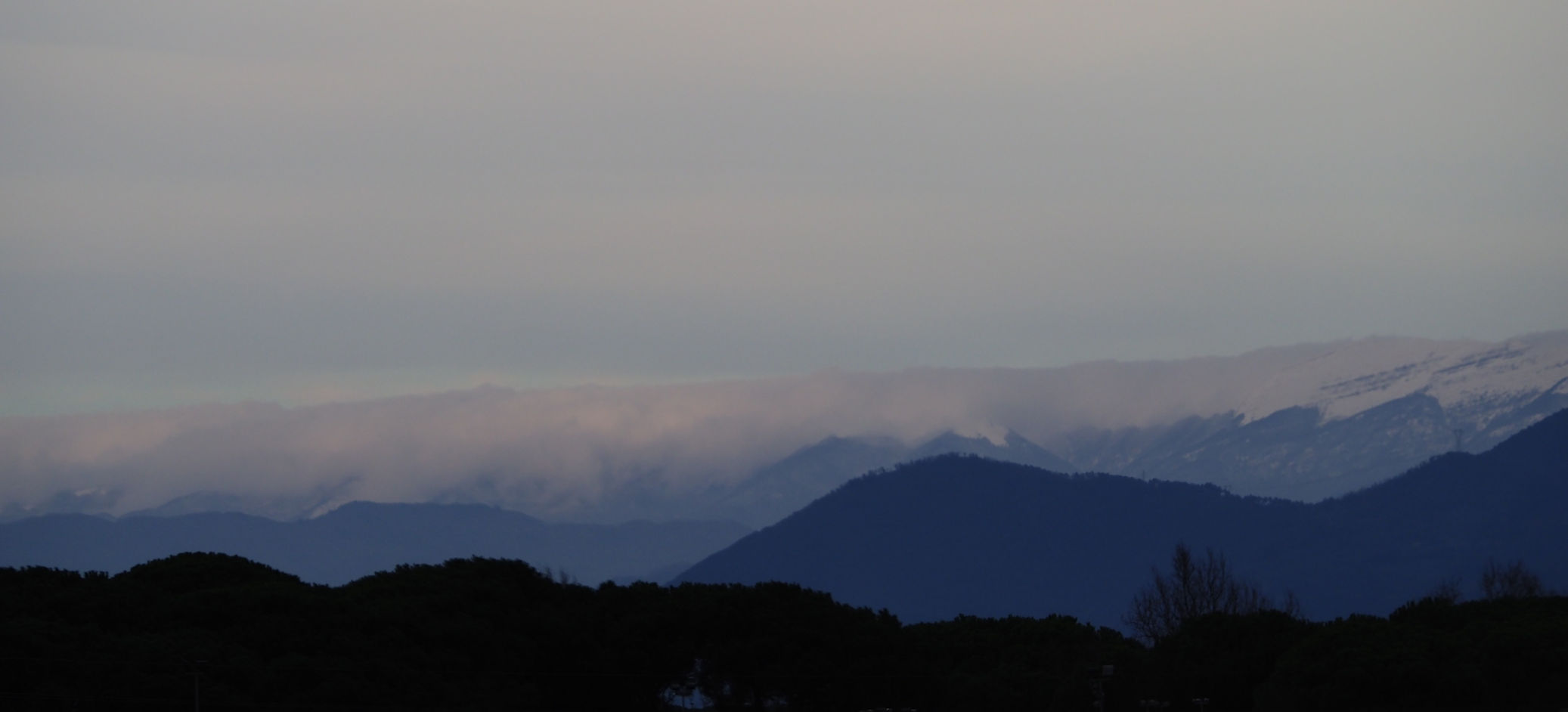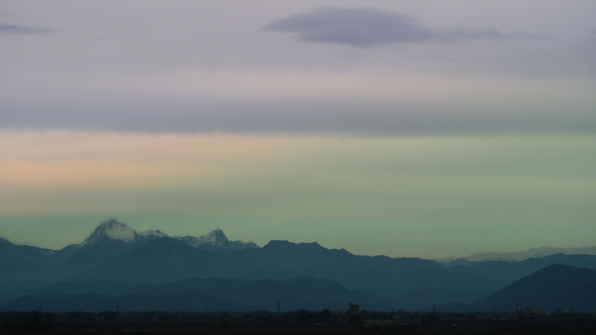 Und weiter geht es in Richtung Sonne. An den schneebedeckten Carrarabergen ist es dann soweit. Hier hat es blauen Himmel und auch etwas Ähnliches wie Sonnenuntergang. Und so parken wir wenig später auf einem Wohnmobilstellplatz am Ende des Marina di Carrara Strandes ein.