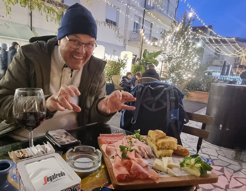 Defi ist am heutigen Abend nicht da. Sie ist im neuen Lokal REDS und hilft ihren beiden Jungs in deren neu eröffneten Bar, denn am heutigen Abend ist dort Full House. Das Wiedersehen mit Nonna ist wunderschön. Irgendwie hat sie sich gar nicht verändert und unser Abendessen, natürlich wie immer betreut von Massimo, ist einfach nur lecker. Es gibt gemischte Vorspeisen vom Buffet, danach Risotto ai Funghi Porcini und schließlich Coniglio con le Patate Aroste….