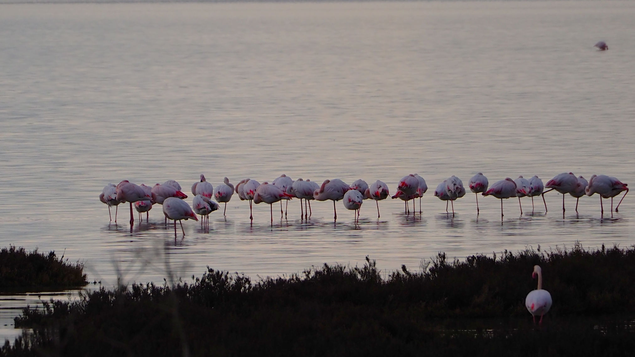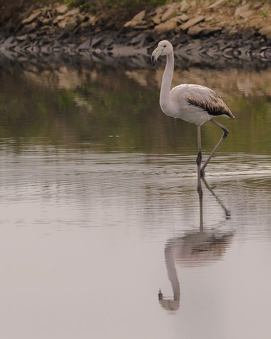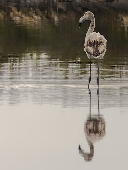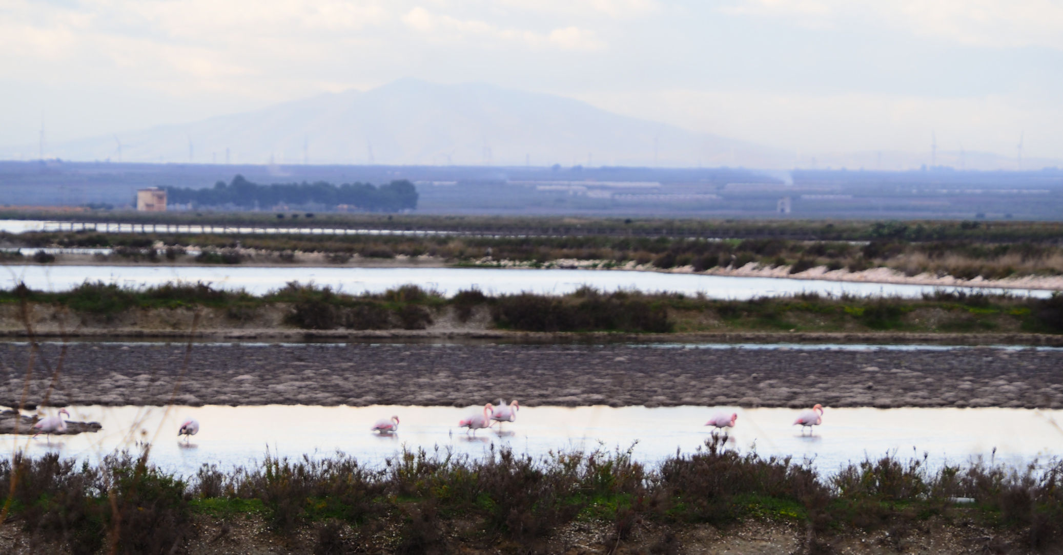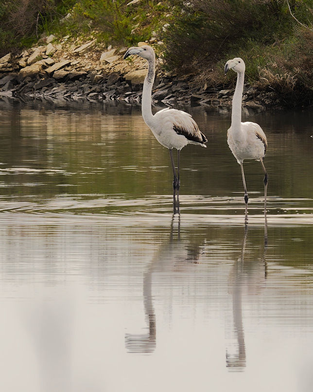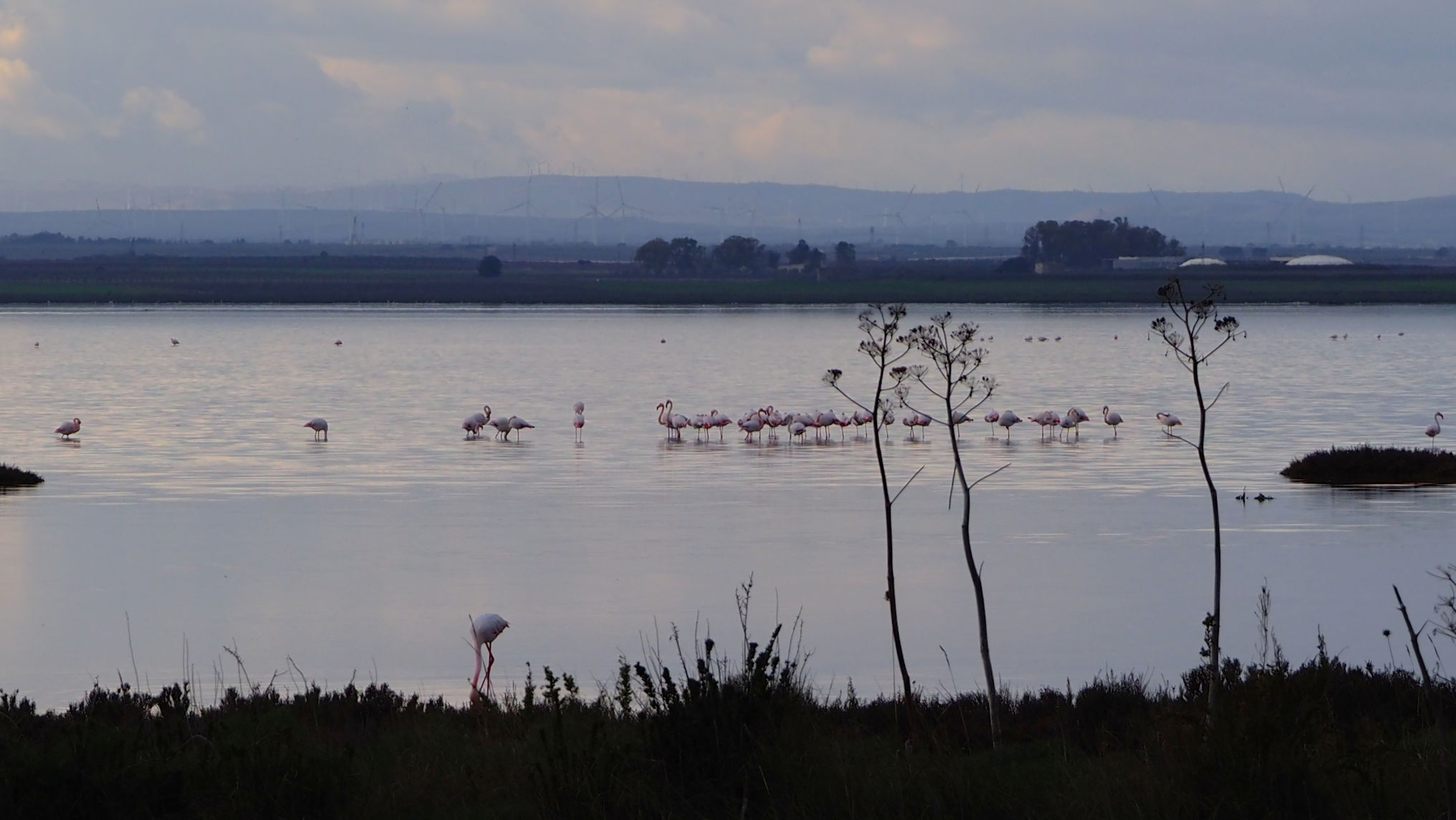 Am Anfang der etwa 20 km langen Saline befinden sich nur vereinzelt Flamingos. Etwa 4000 sollen regelmäßig hier leben. Fenicotteri Rosa heißen diese Tiere übrigens im Italienischen. Es dauert einige Kilometer, bis wir an einigen, nahe an der Straße stehenden Exemplaren vorbeikommen. Und es ist trotz der fehlenden Sonne traumhaft schön.