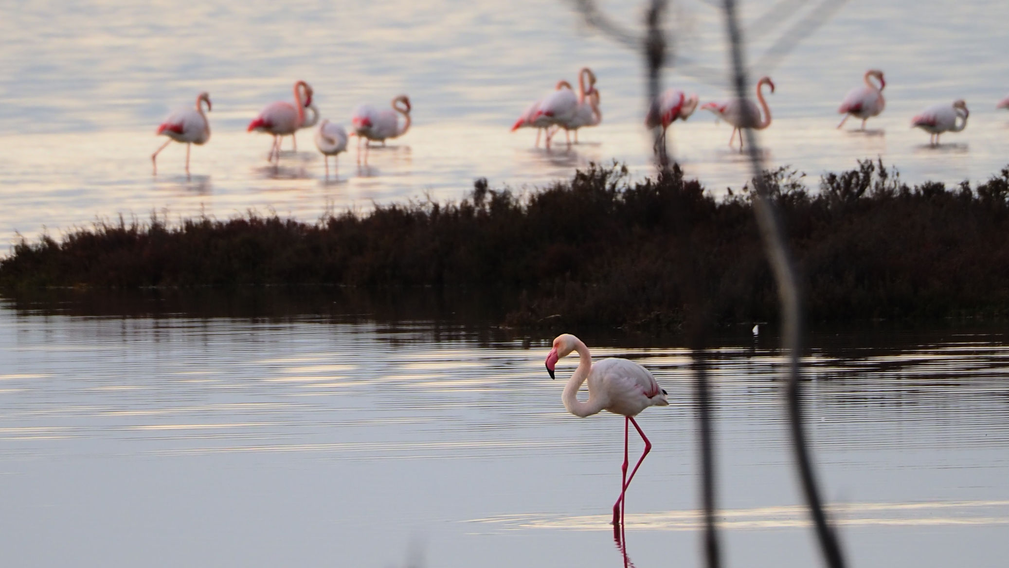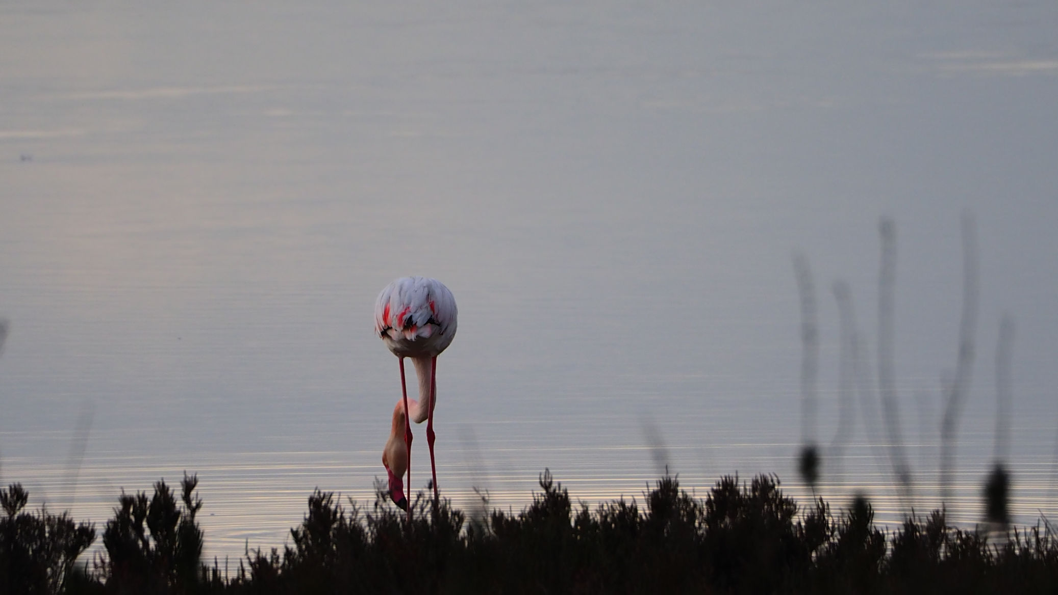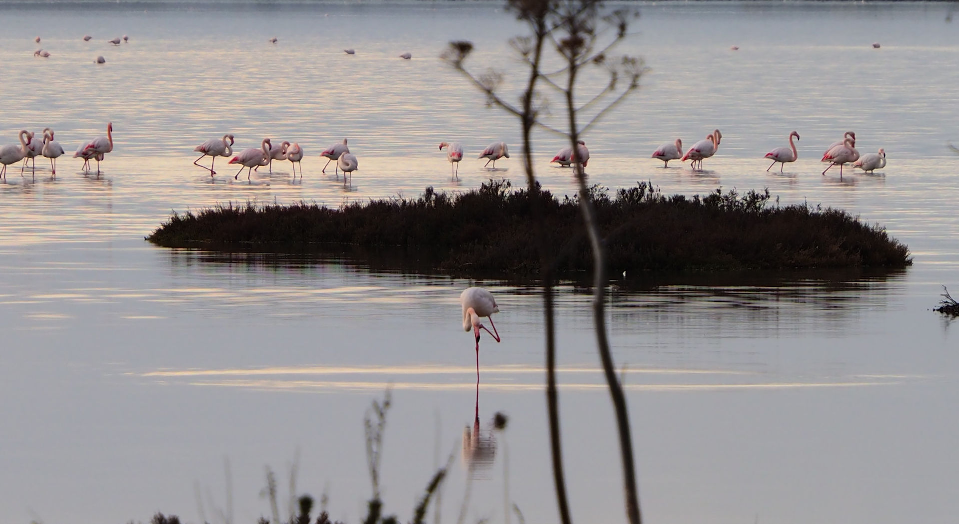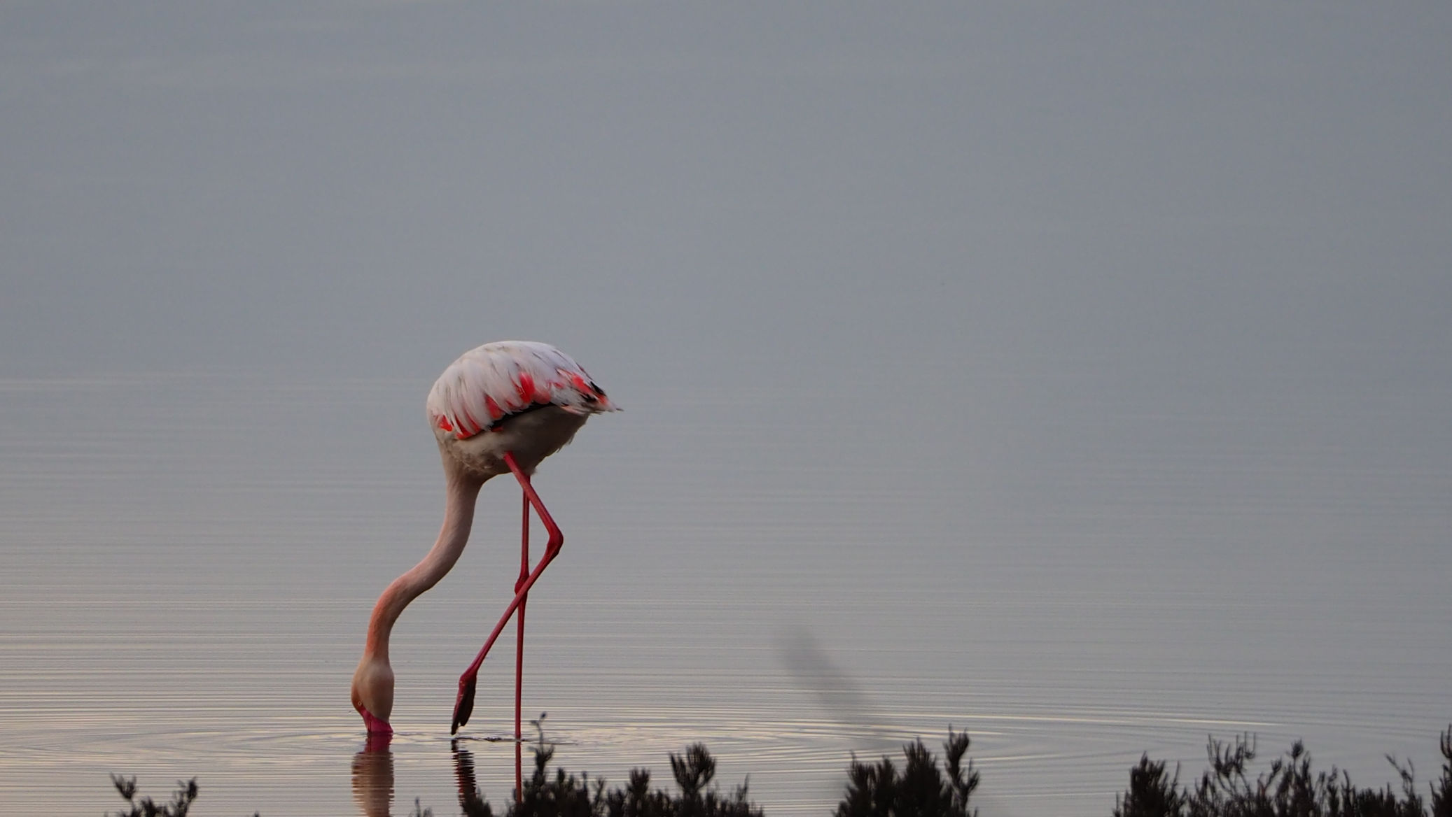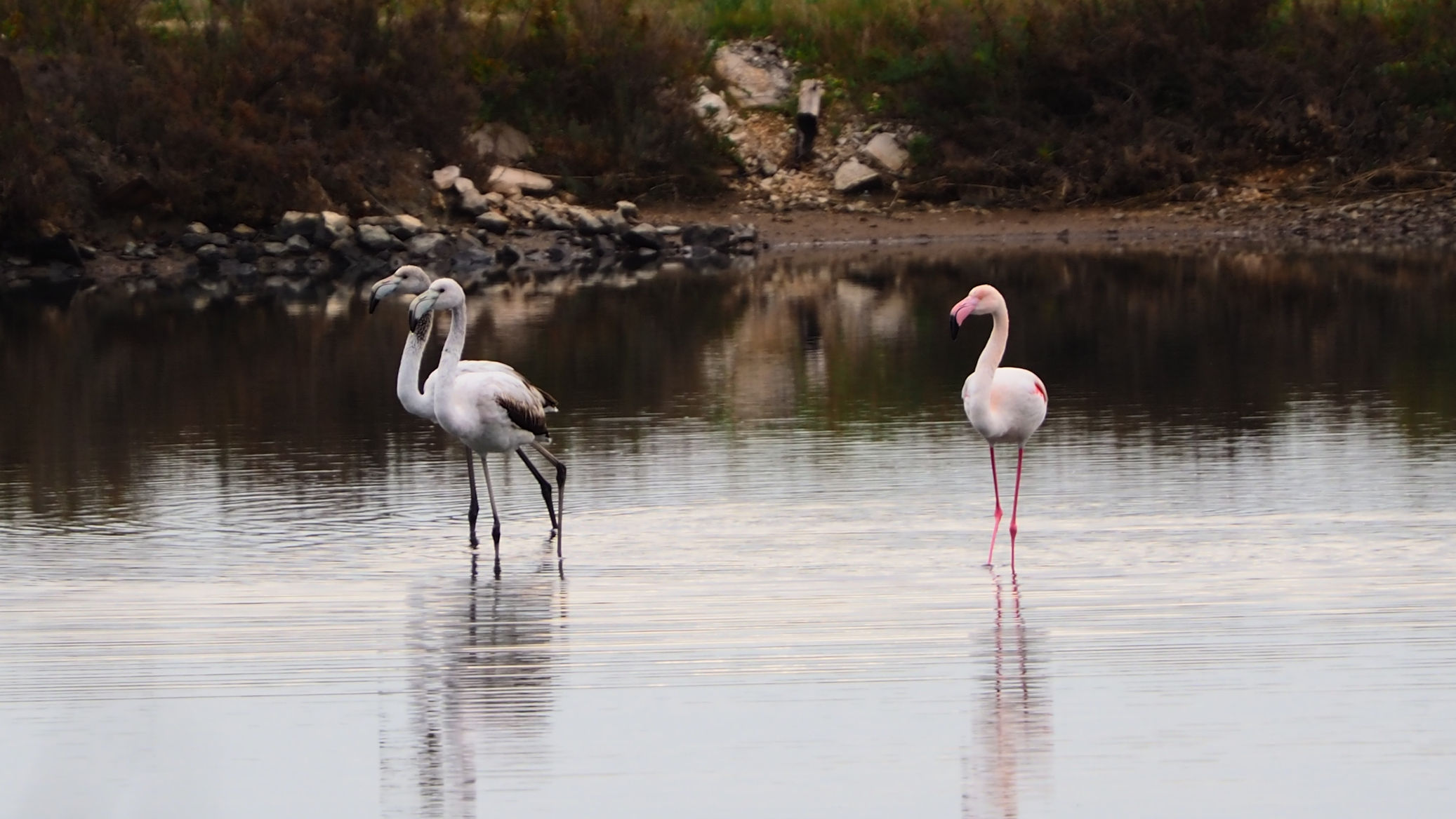 Am Anfang der etwa 20 km langen Saline befinden sich nur vereinzelt Flamingos. Etwa 4000 sollen regelmäßig hier leben. Fenicotteri Rosa heißen diese Tiere übrigens im Italienischen. Es dauert einige Kilometer, bis wir an einigen, nahe an der Straße stehenden Exemplaren vorbeikommen. Und es ist trotz der fehlenden Sonne traumhaft schön.